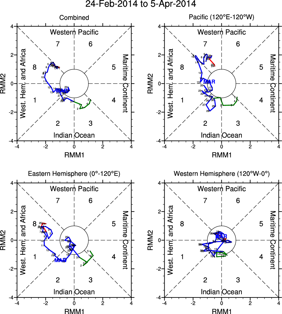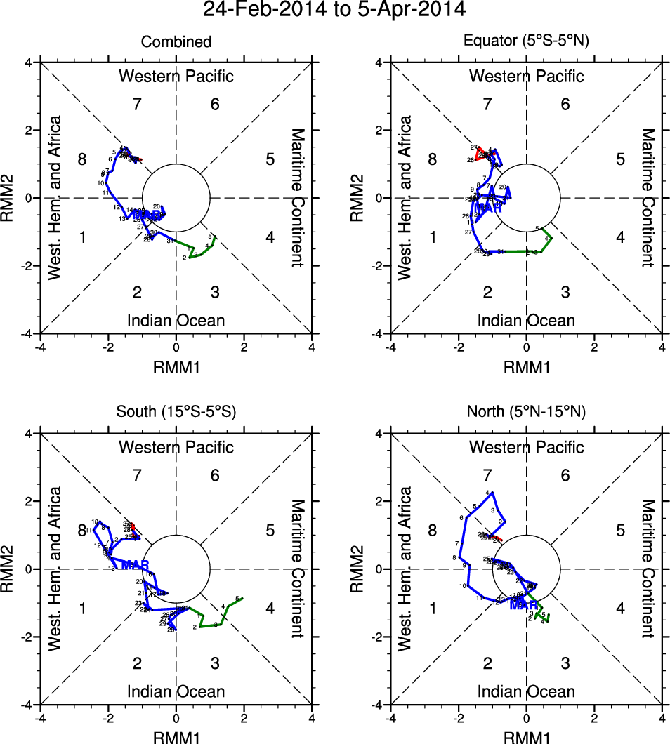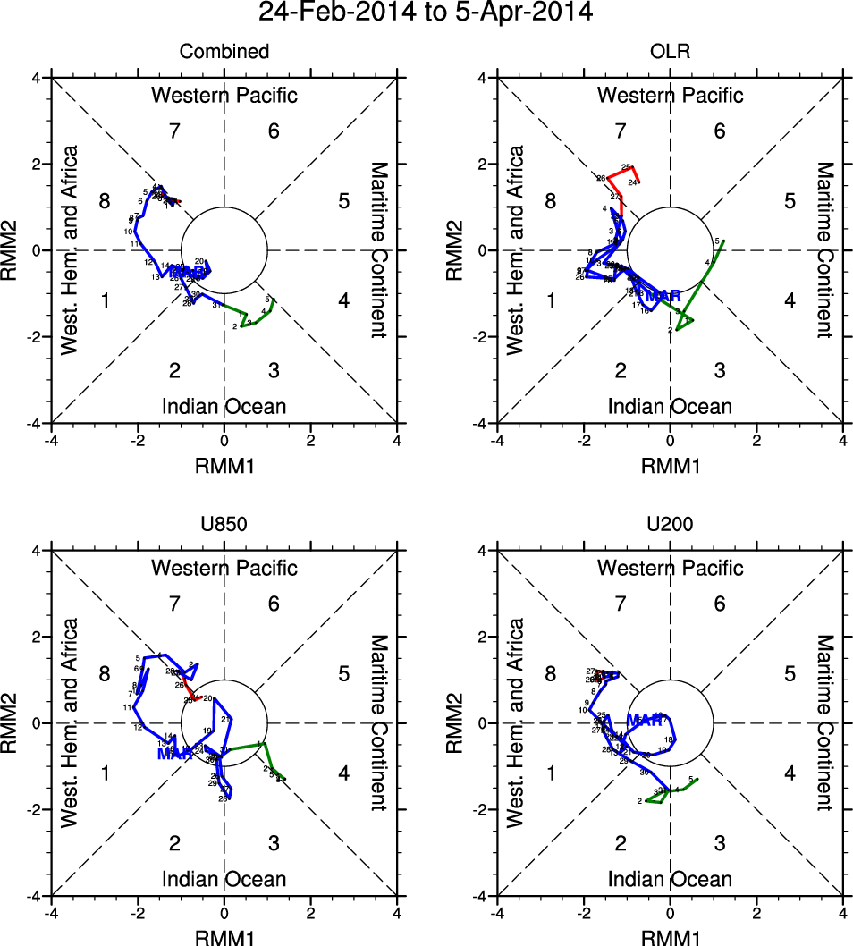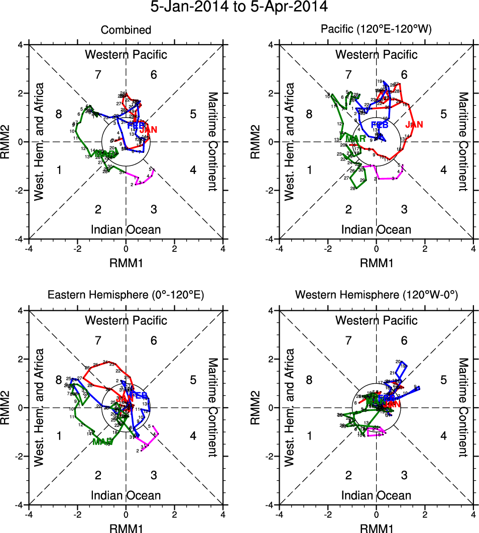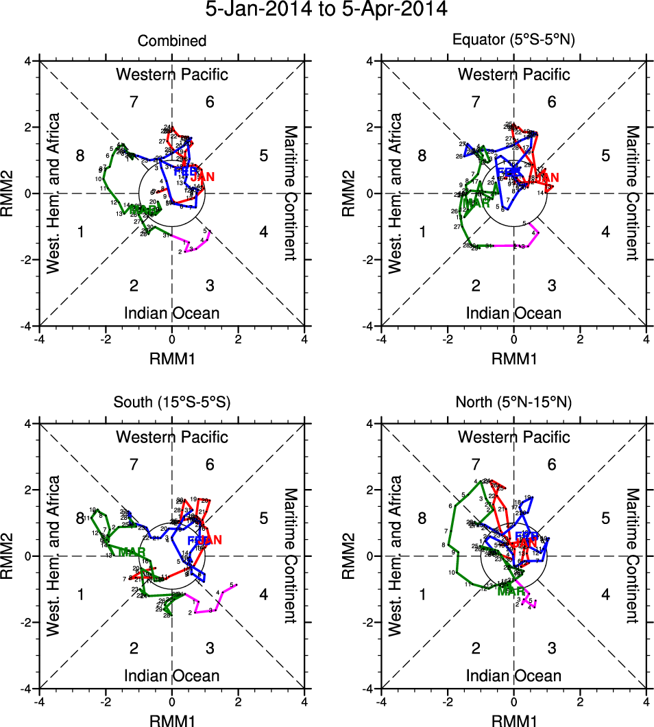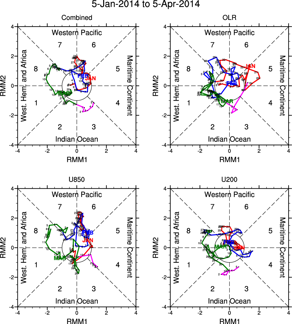 Wheeler and Hendon (2004) constructed the RMM index for monitoring the MJO. This index consists of the first two principal components (PCs) of OLR, 850-hPa zonal wind, and 200-hPa zonal wind averaged 15S-15N.