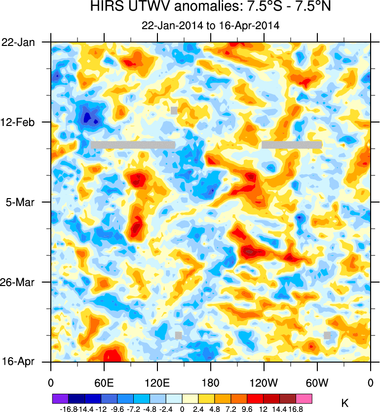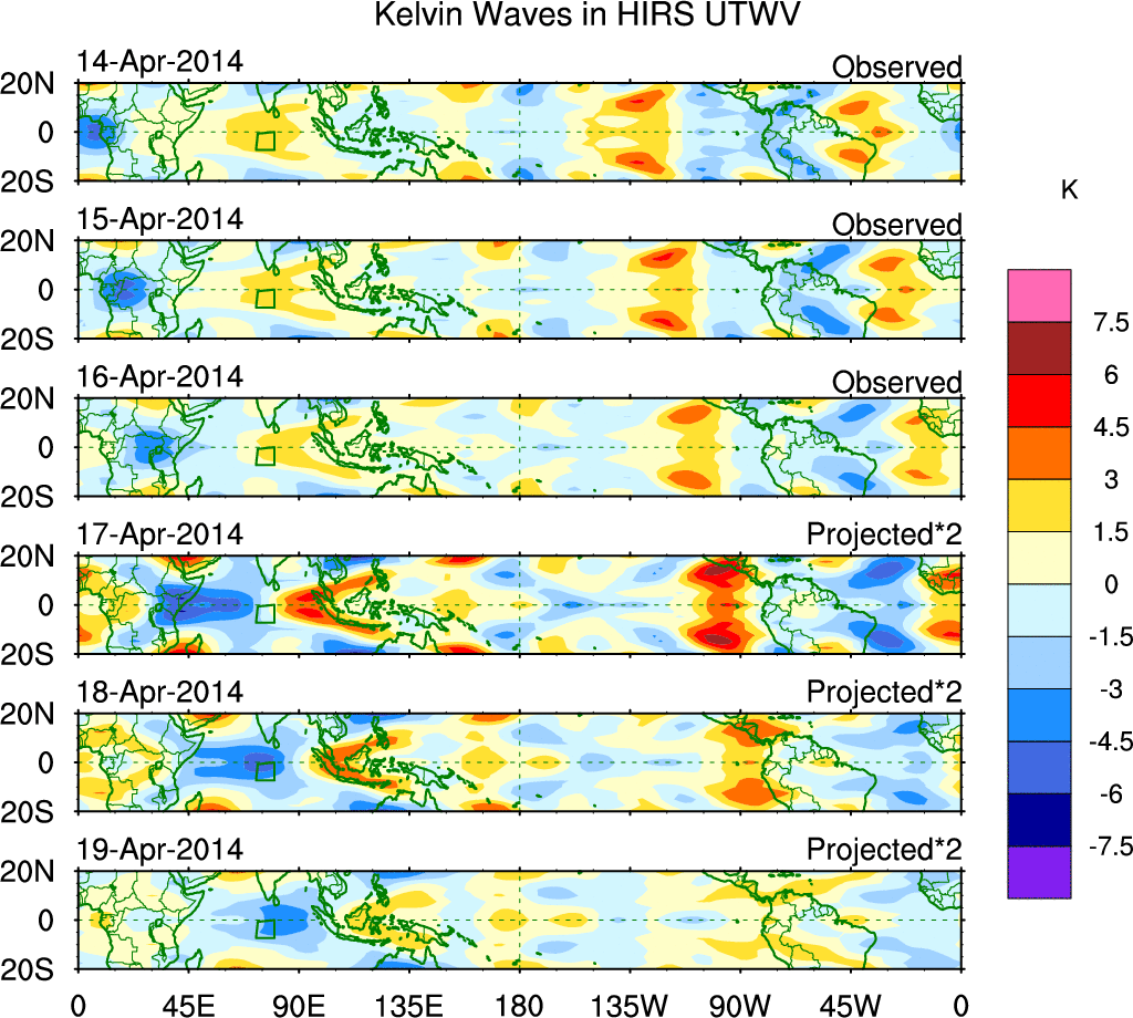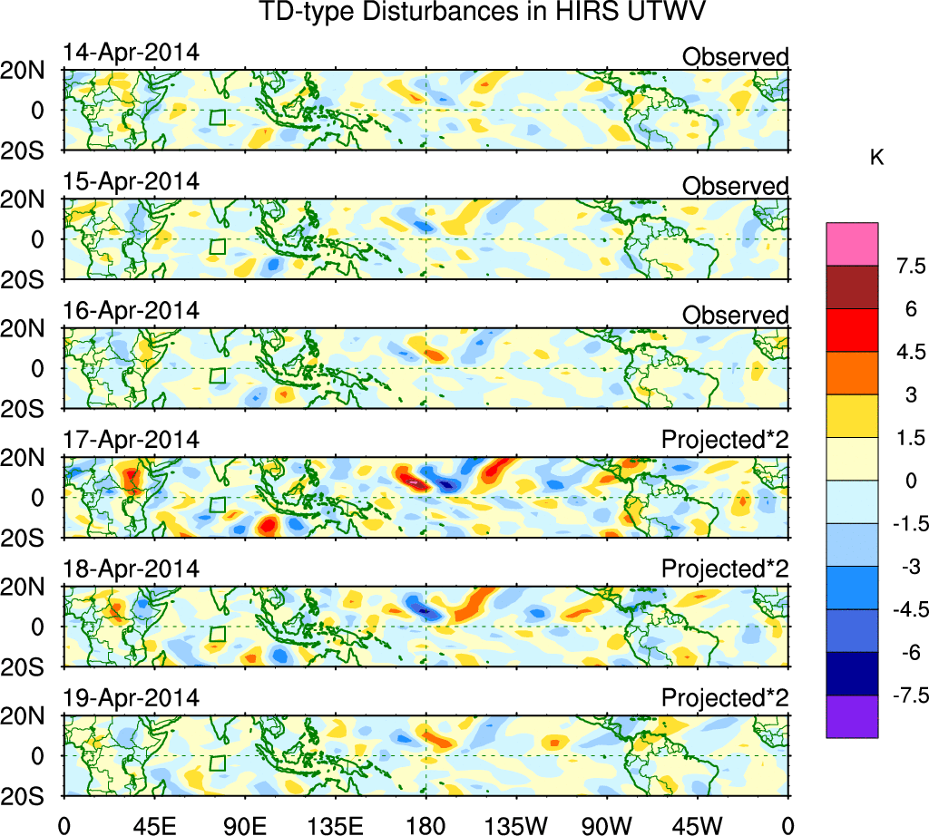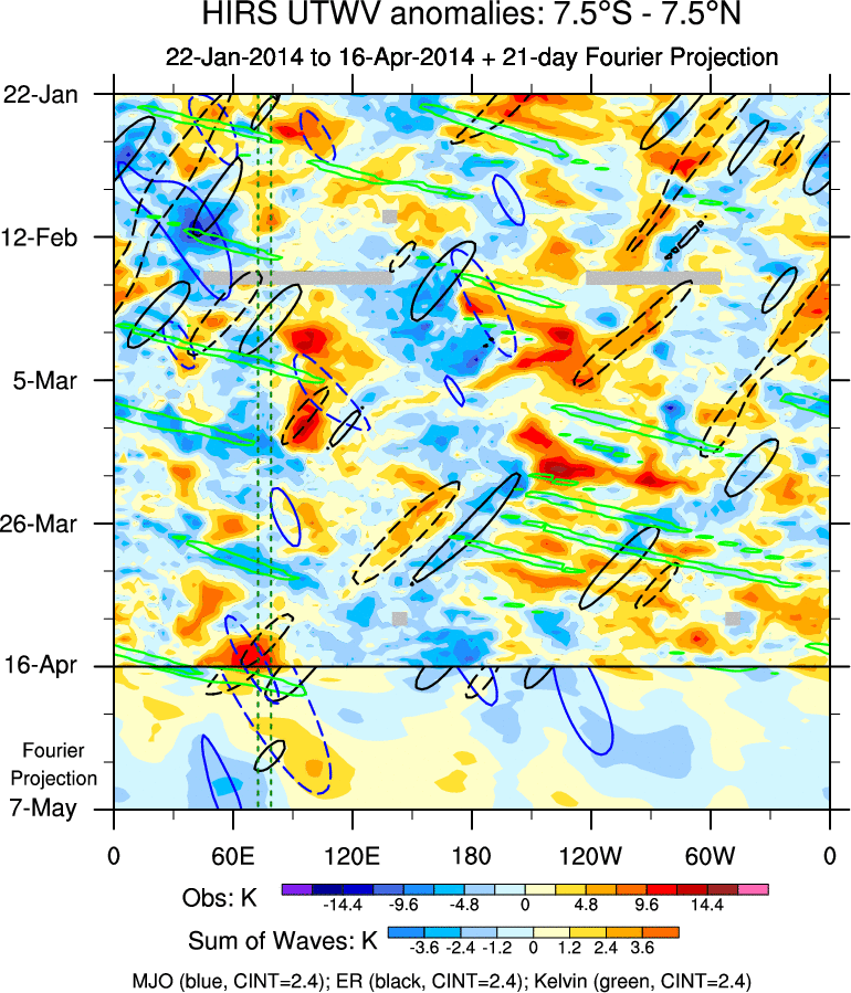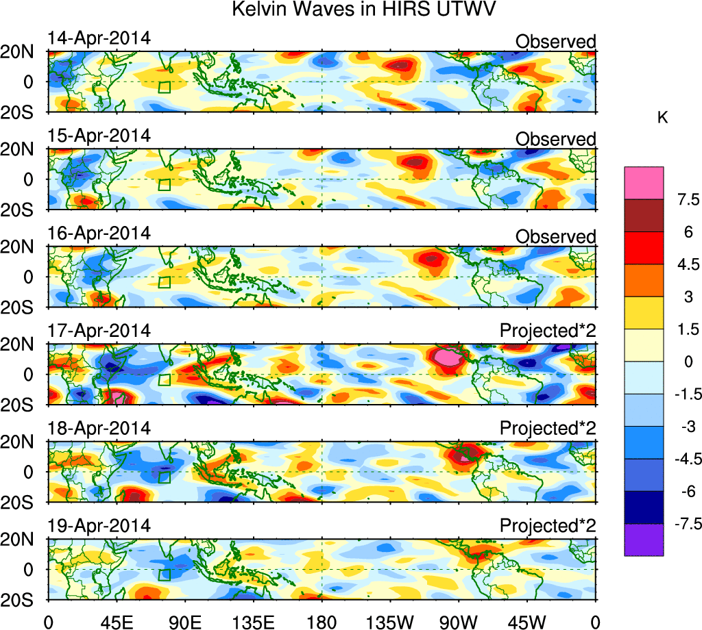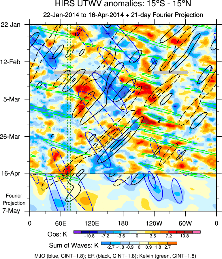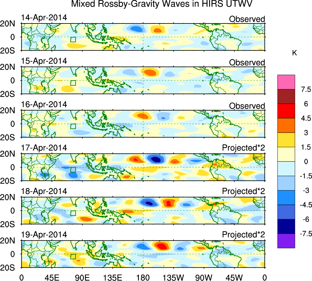 To identify tropical waves in near real-time, the OLR and UTWV data are filtered following Wheeler & Weickmann (2001 MWR). The daily anomalies are calculated using the first 3 harmonics of the seasonal cycle for 1979–2009. Missing values are then filled using linear interpolation in space and time. The most recent 365 days of anomalies are padded with 659 days of zeroes, and the result is filtered for each wave type.