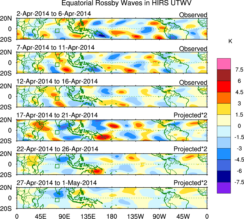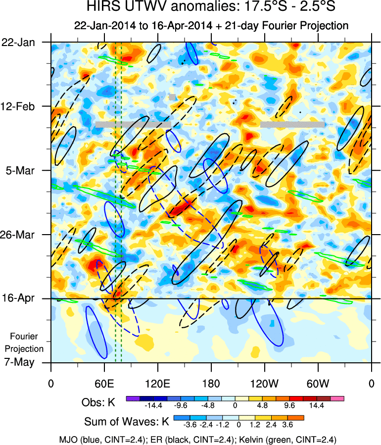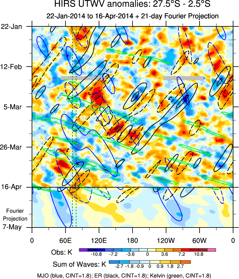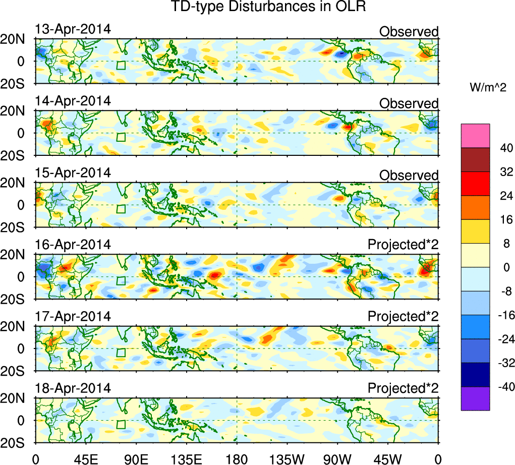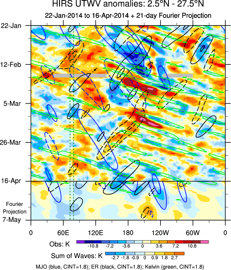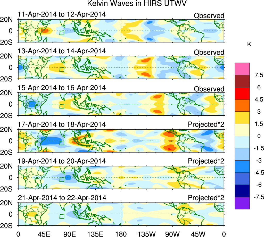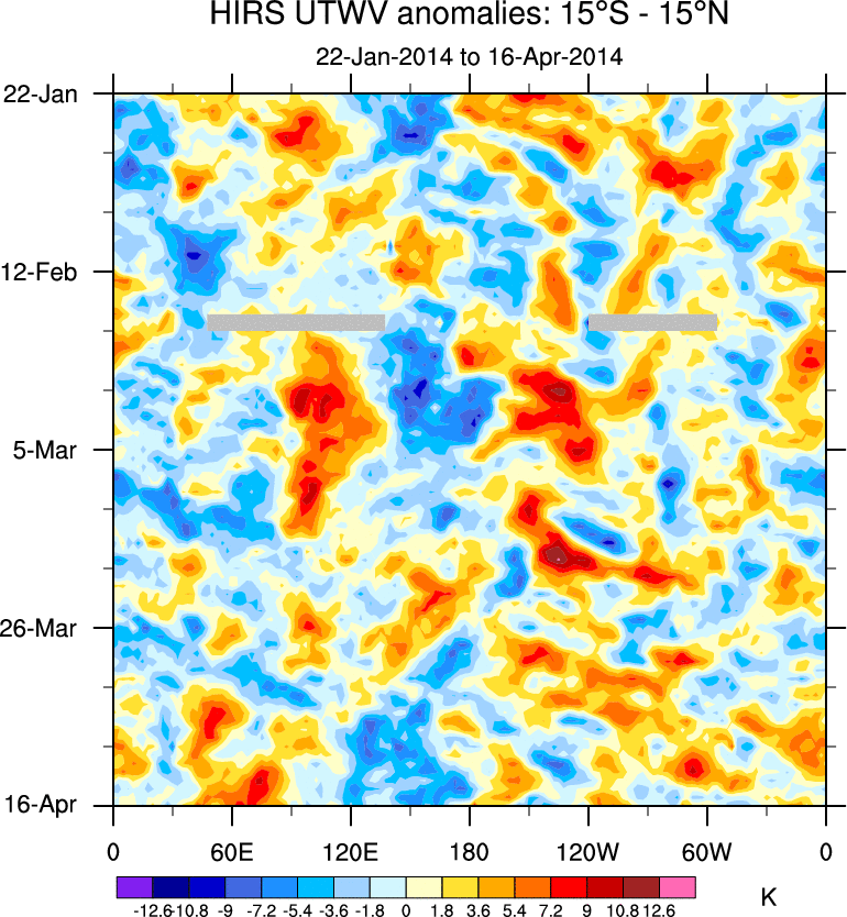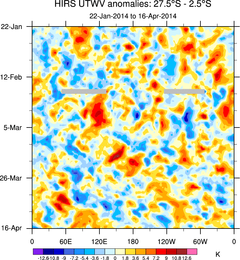 To identify tropical waves in near real-time, the OLR and UTWV data are filtered following Wheeler & Weickmann (2001 MWR). The daily anomalies are calculated using the first 3 harmonics of the seasonal cycle for 1979–2009. Missing values are then filled using linear interpolation in space and time. The most recent 365 days of anomalies are padded with 659 days of zeroes, and the result is filtered for each wave type.