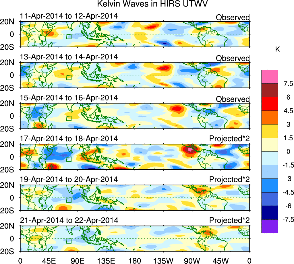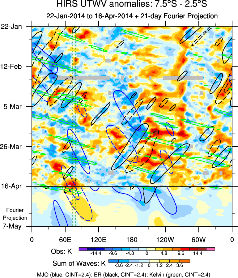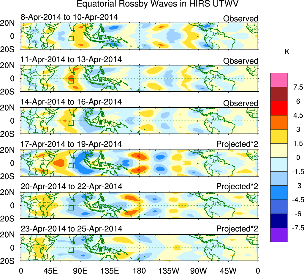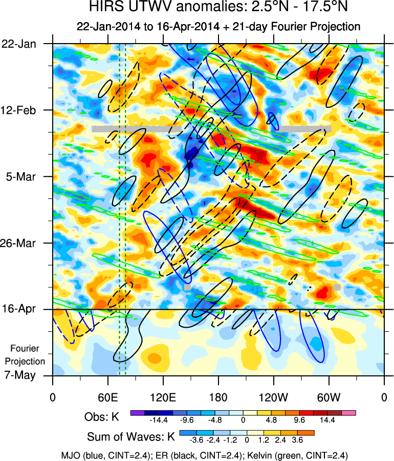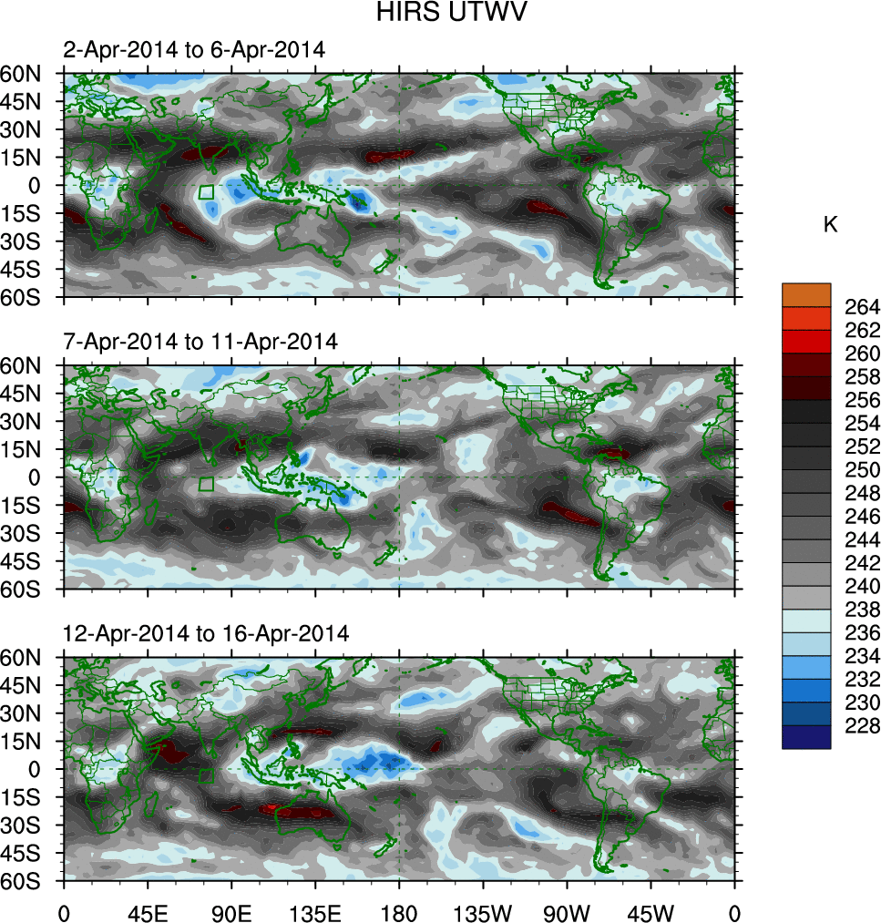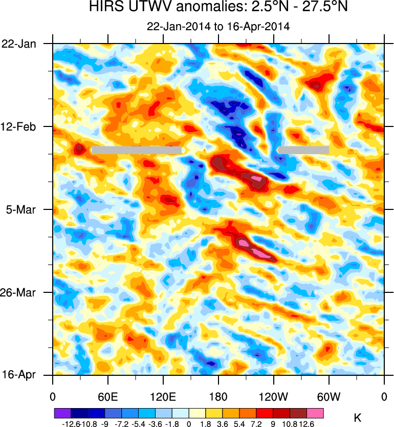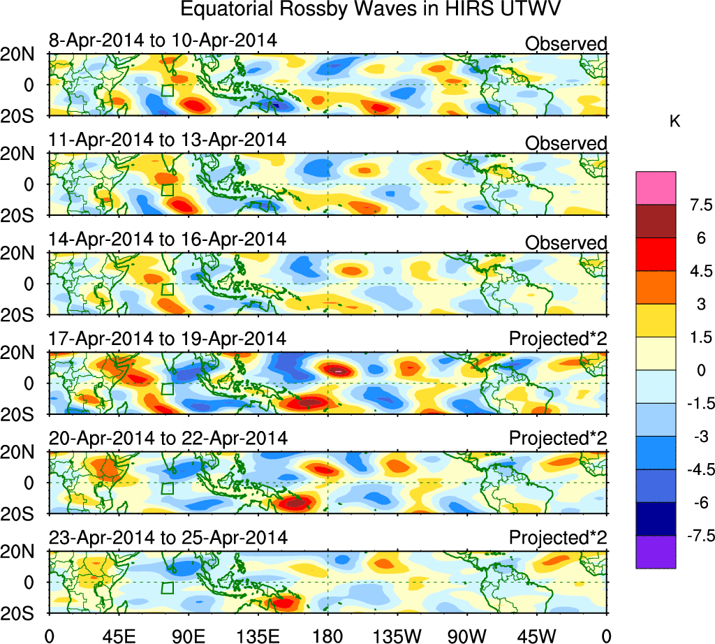To identify tropical waves in near real-time, the OLR and UTWV data are filtered following Wheeler & Weickmann (2001 MWR). The daily anomalies are calculated using the first 3 harmonics of the seasonal cycle for 1979–2009. Missing values are then filled using linear interpolation in space and time. The most recent 365 days of anomalies are padded with 659 days of zeroes, and the result is filtered for each wave type.