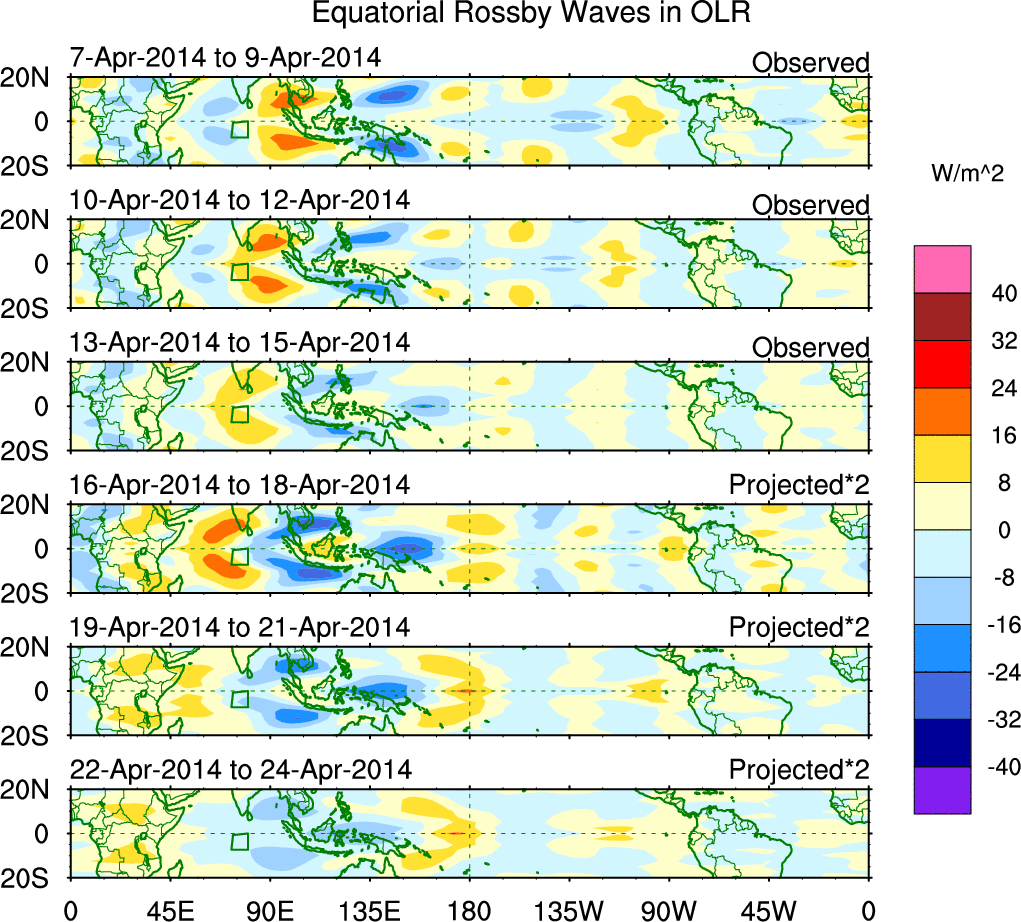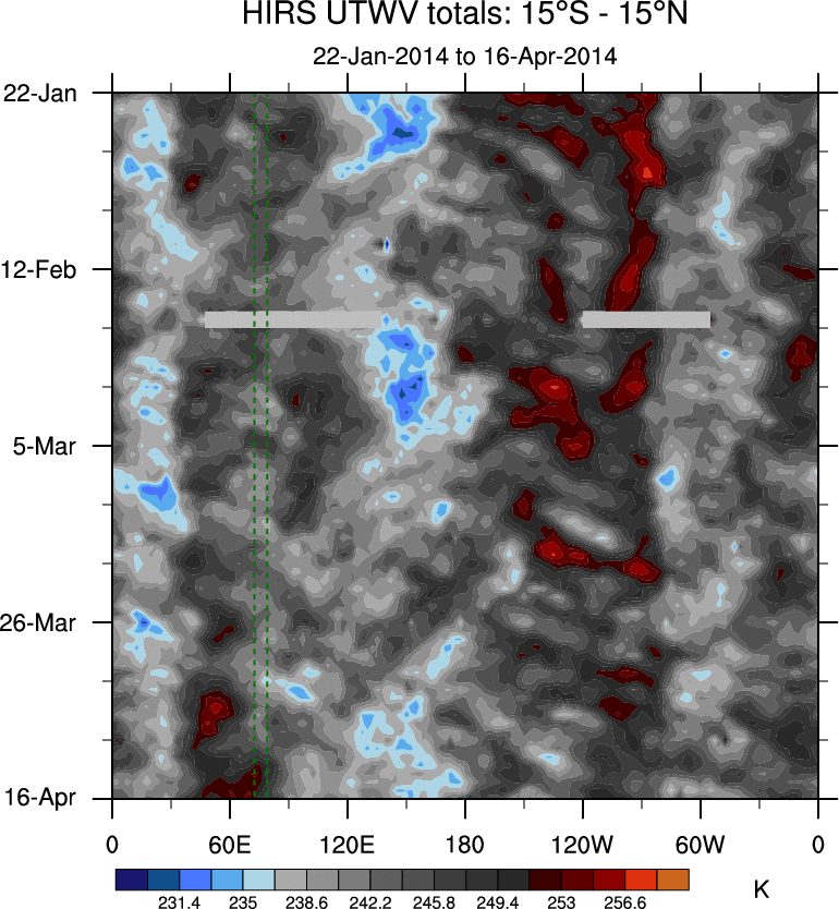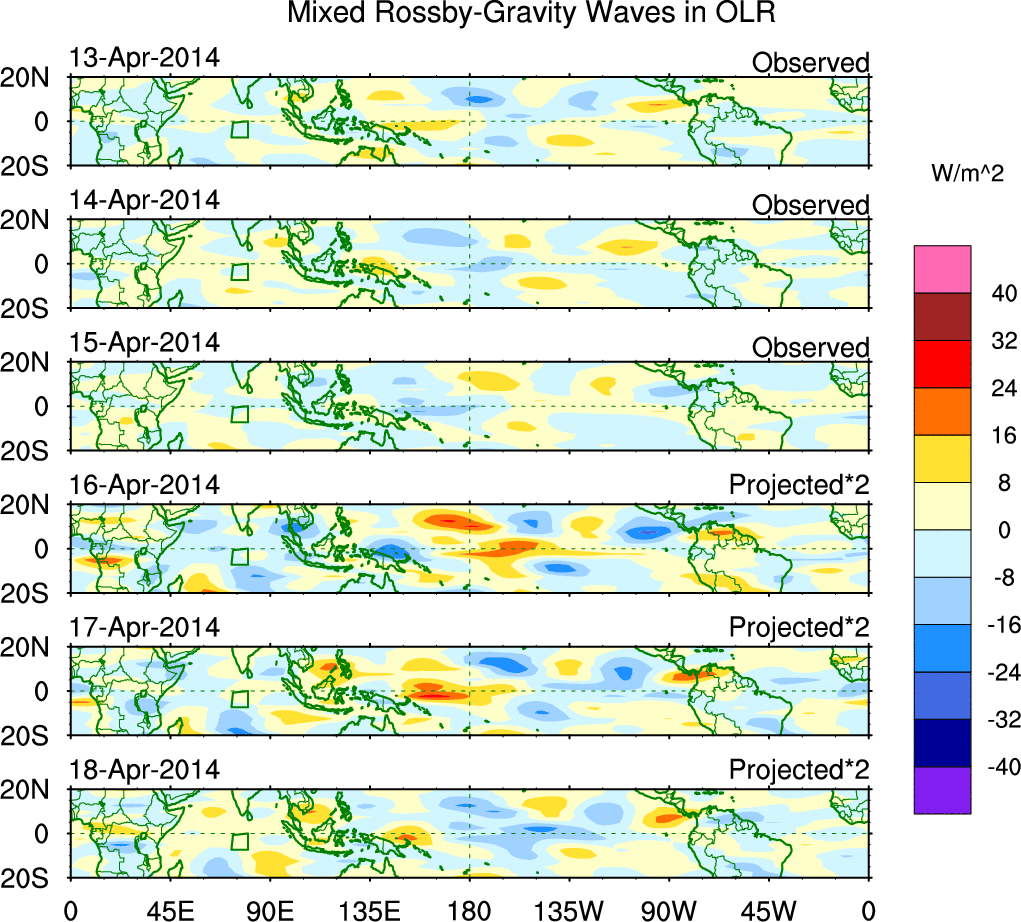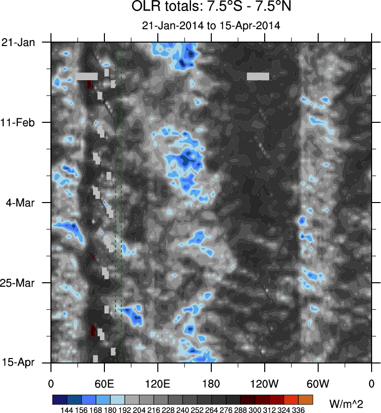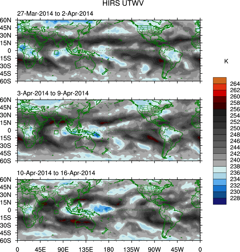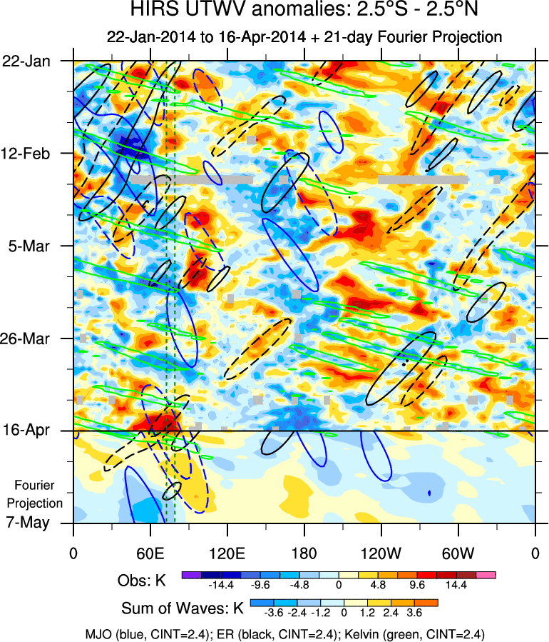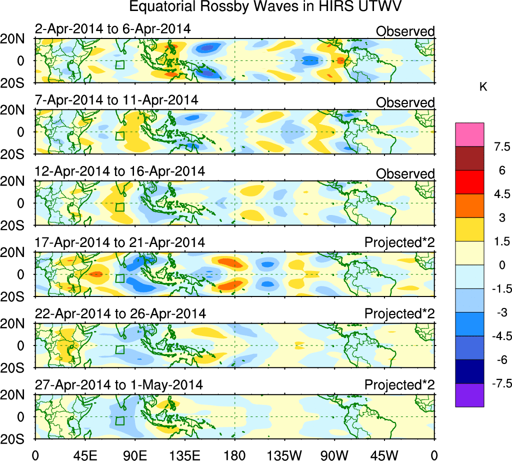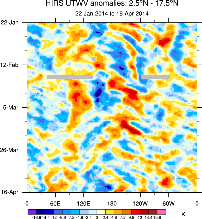 To identify tropical waves in near real-time, the OLR and UTWV data are filtered following Wheeler & Weickmann (2001 MWR). The daily anomalies are calculated using the first 3 harmonics of the seasonal cycle for 1979–2009. Missing values are then filled using linear interpolation in space and time. The most recent 365 days of anomalies are padded with 659 days of zeroes, and the result is filtered for each wave type.
