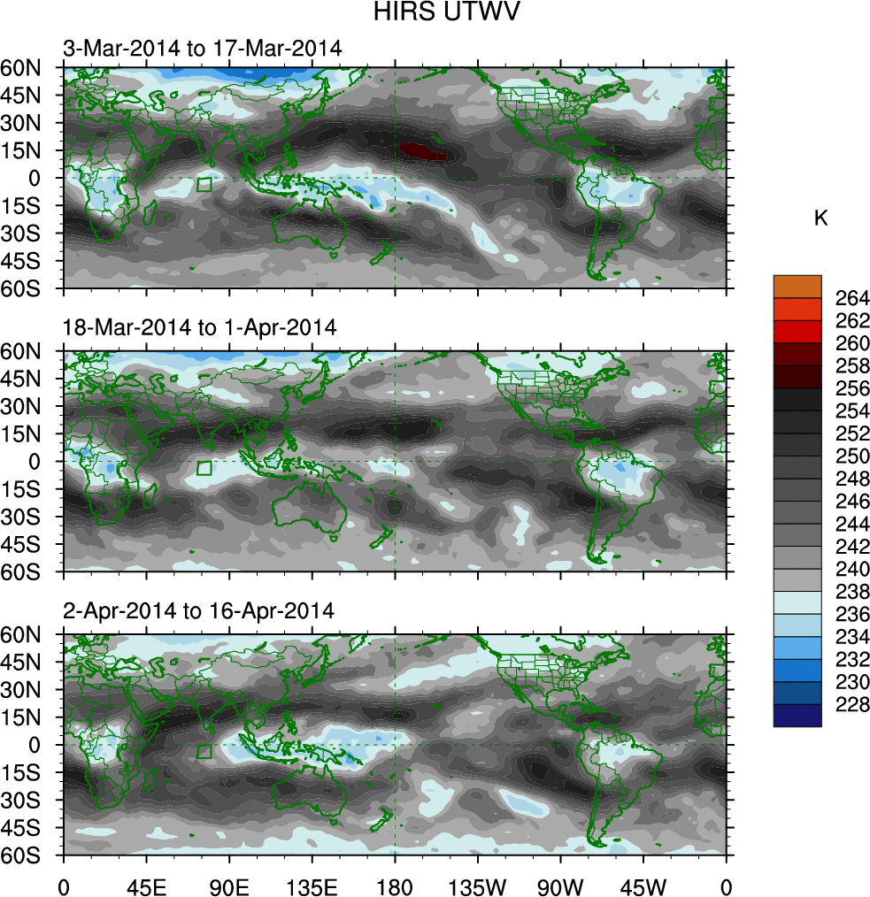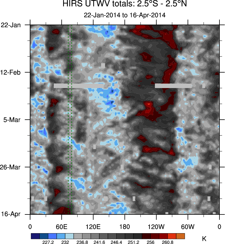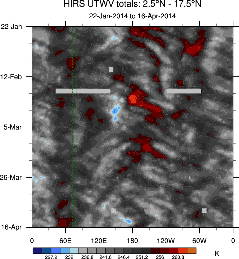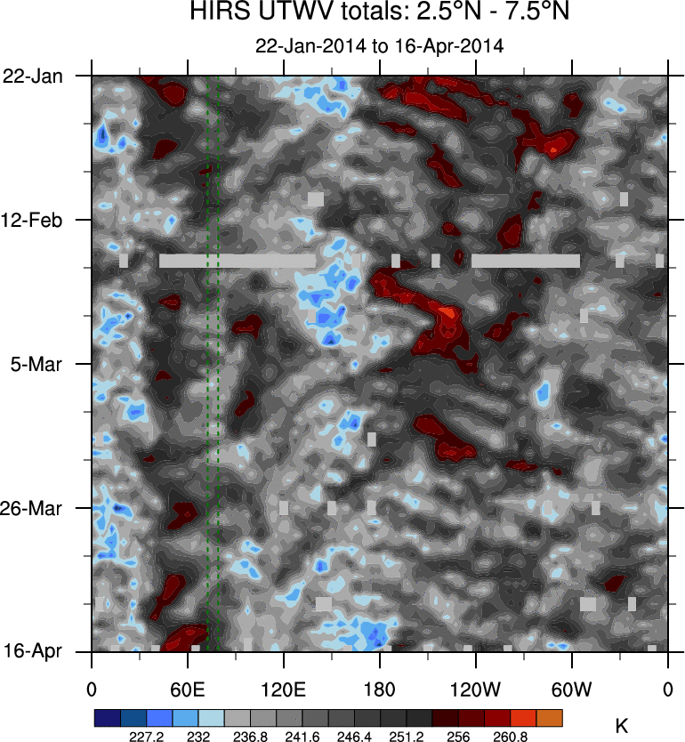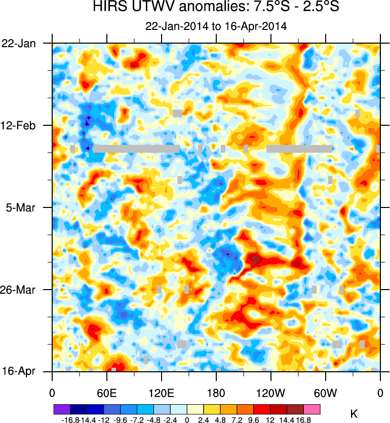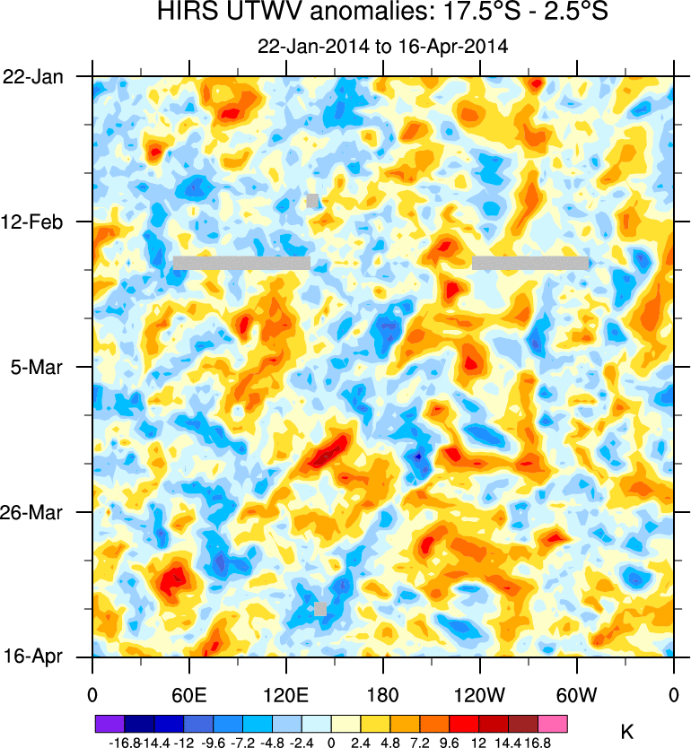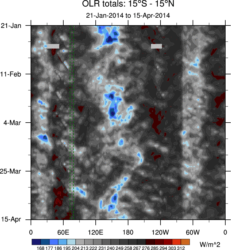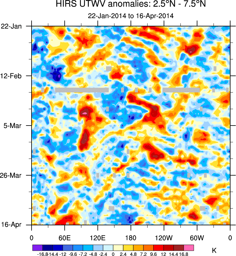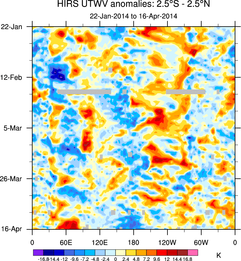 To identify tropical waves in near real-time, the OLR and UTWV data are filtered following Wheeler & Weickmann (2001 MWR). The daily anomalies are calculated using the first 3 harmonics of the seasonal cycle for 1979–2009. Missing values are then filled using linear interpolation in space and time. The most recent 365 days of anomalies are padded with 659 days of zeroes, and the result is filtered for each wave type.