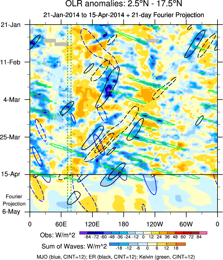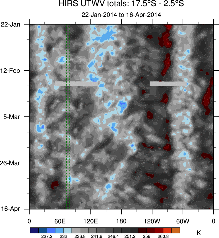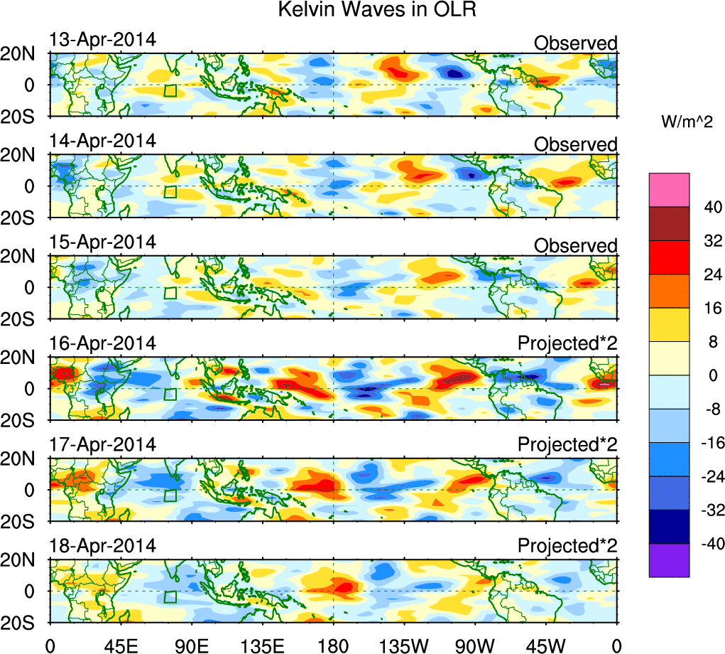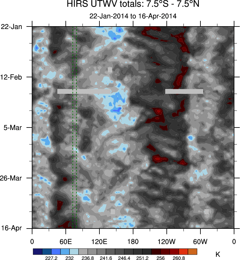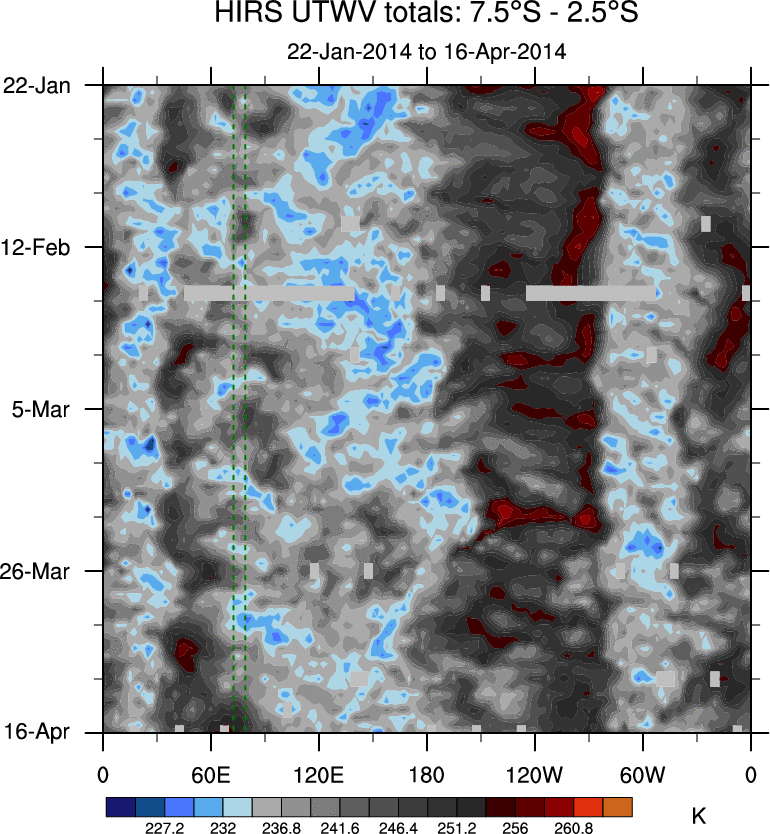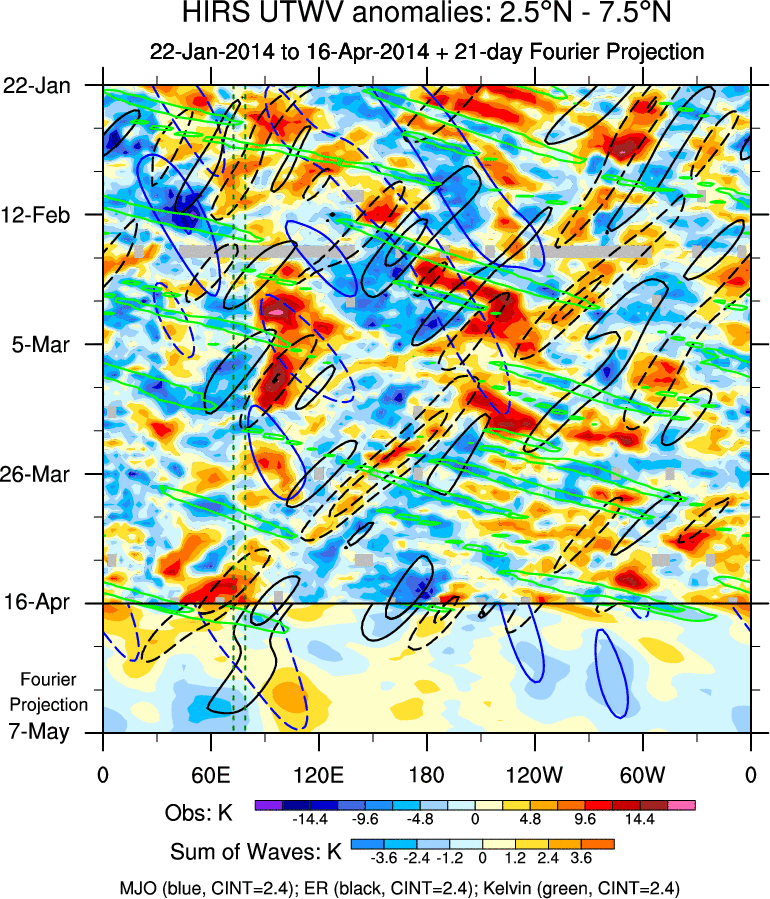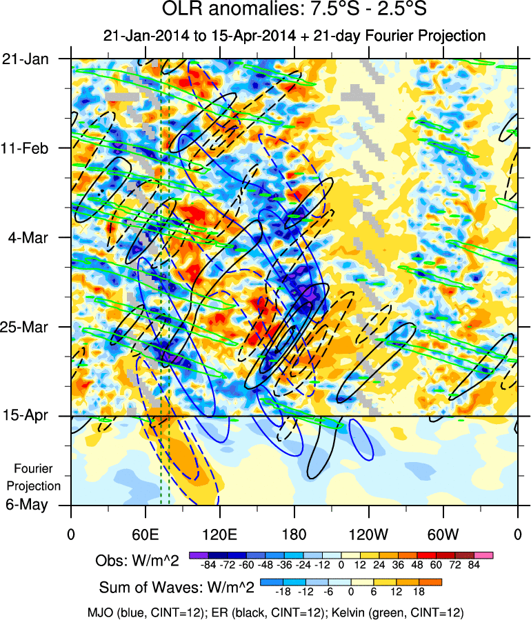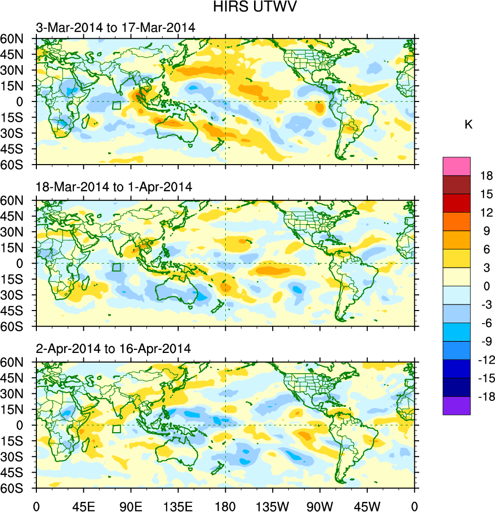 To identify tropical waves in near real-time, the OLR and UTWV data are filtered following Wheeler & Weickmann (2001 MWR). The daily anomalies are calculated using the first 3 harmonics of the seasonal cycle for 1979–2009. Missing values are then filled using linear interpolation in space and time. The most recent 365 days of anomalies are padded with 659 days of zeroes, and the result is filtered for each wave type.