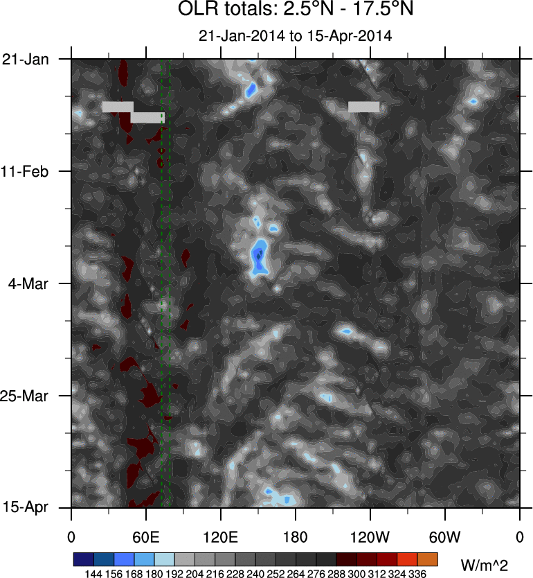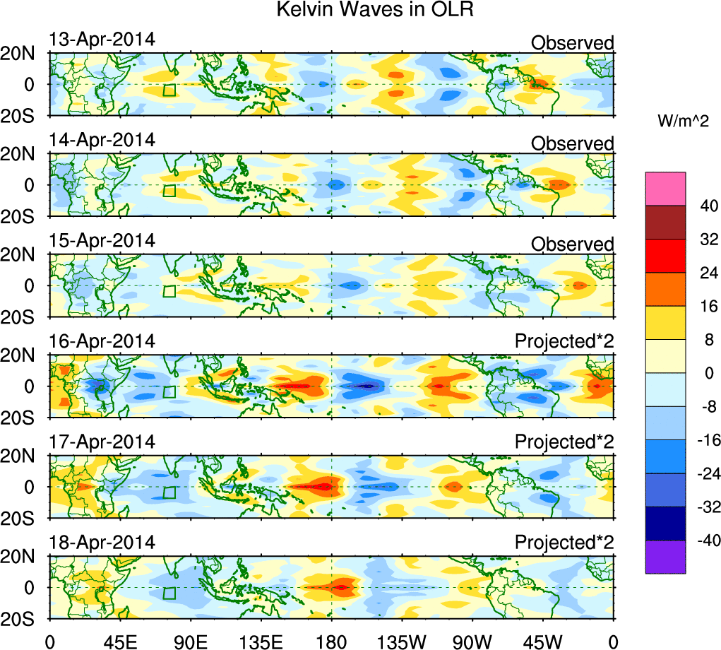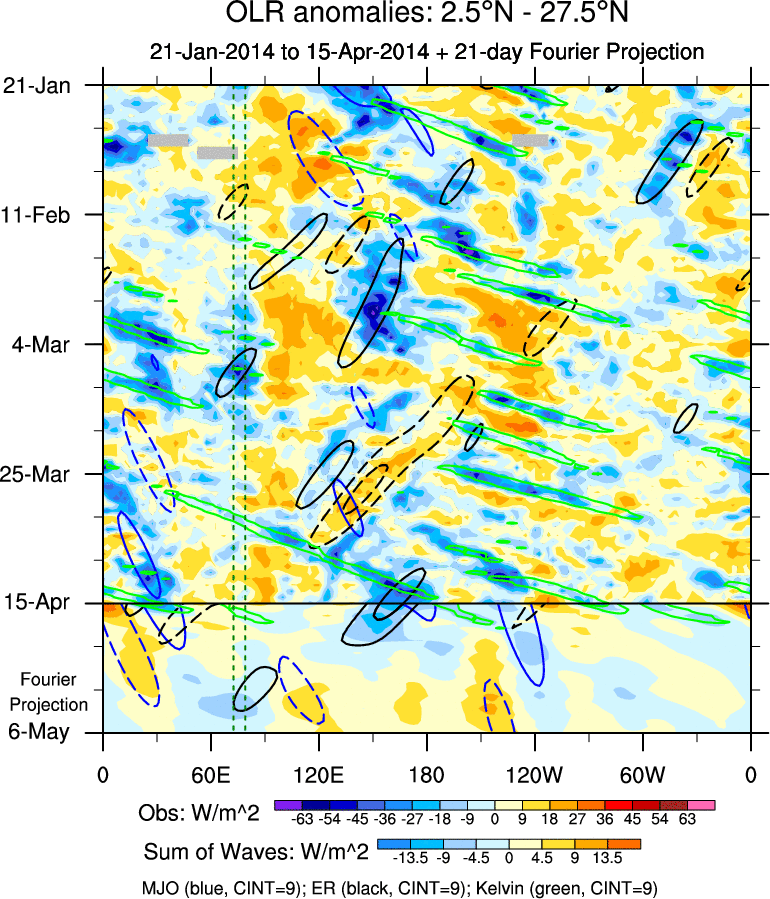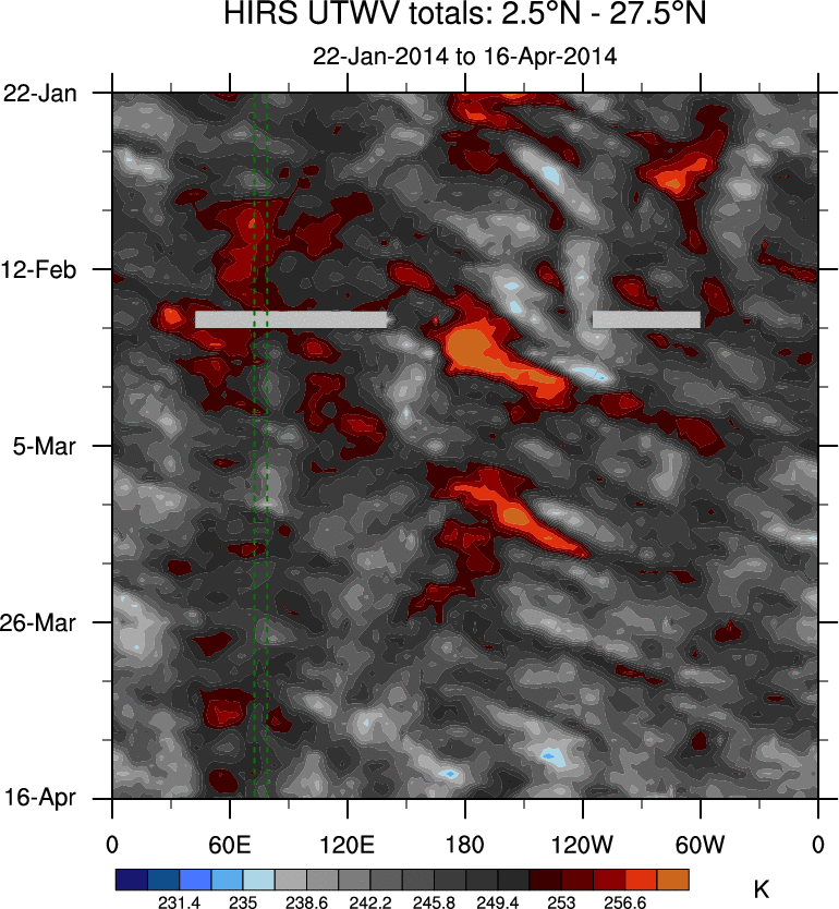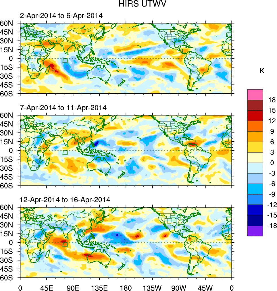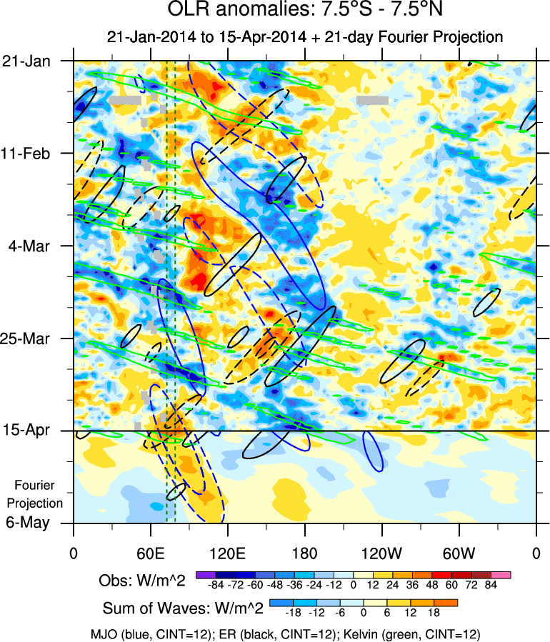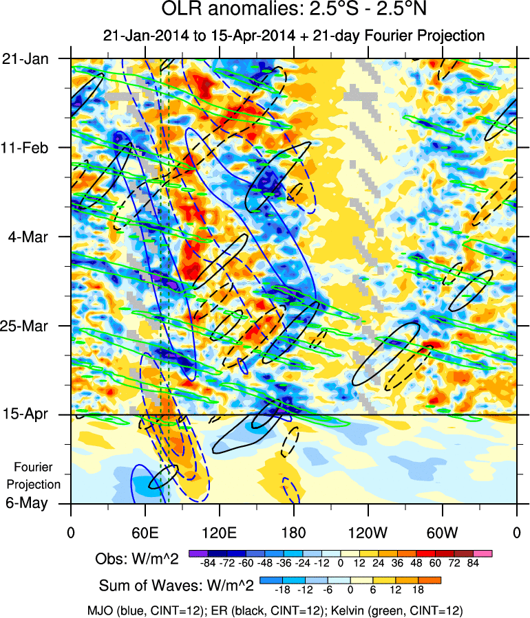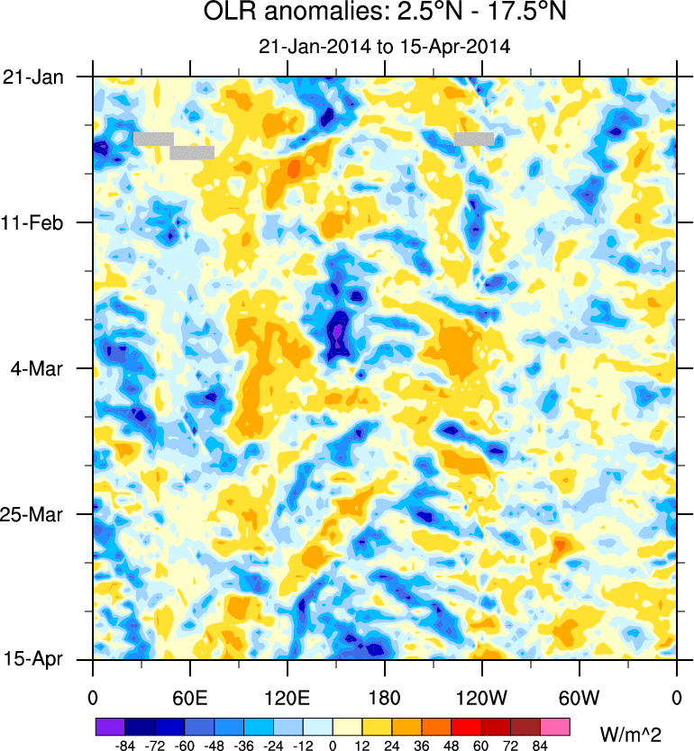 To identify tropical waves in near real-time, the OLR and UTWV data are filtered following Wheeler & Weickmann (2001 MWR). The daily anomalies are calculated using the first 3 harmonics of the seasonal cycle for 1979–2009. Missing values are then filled using linear interpolation in space and time. The most recent 365 days of anomalies are padded with 659 days of zeroes, and the result is filtered for each wave type.