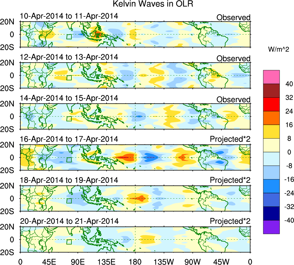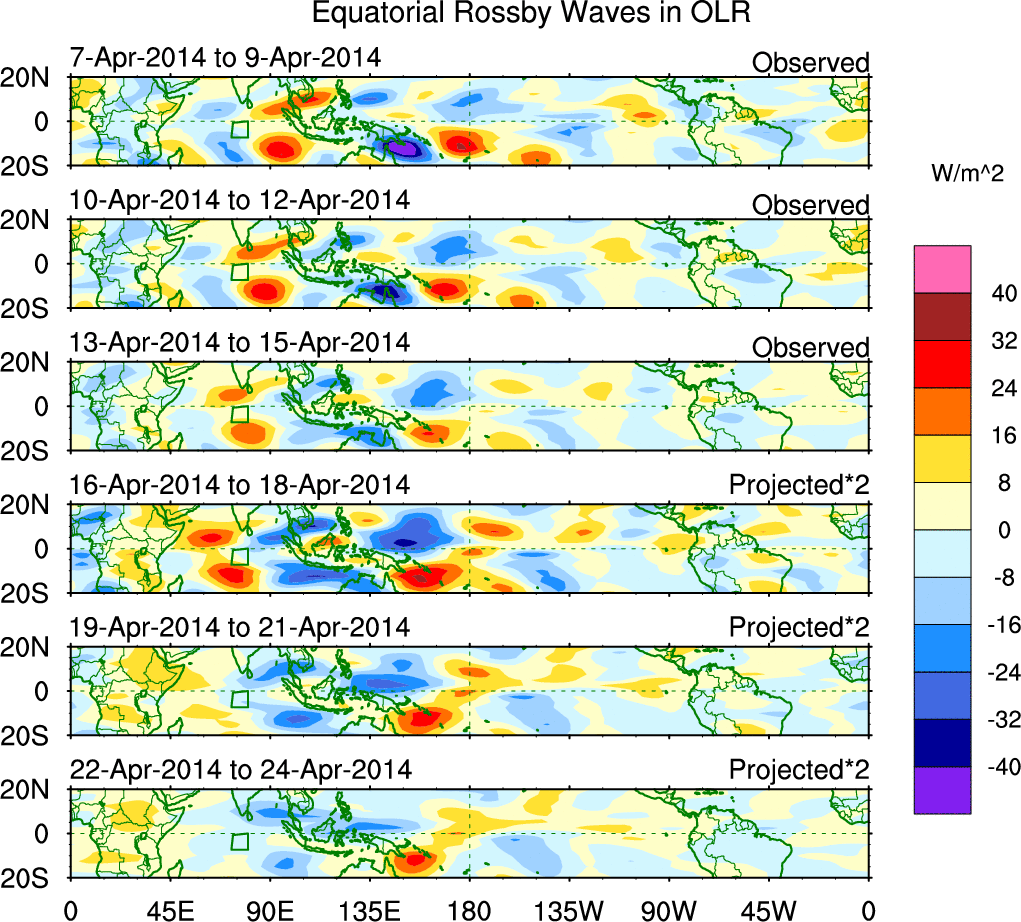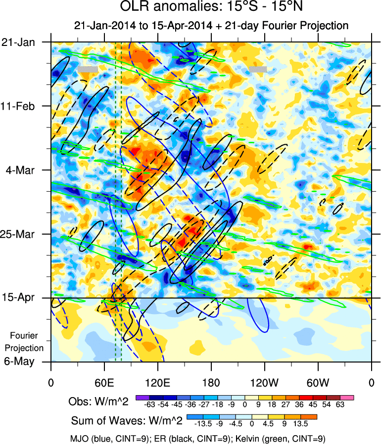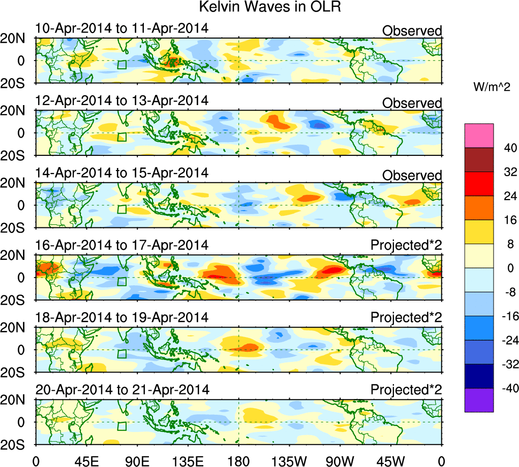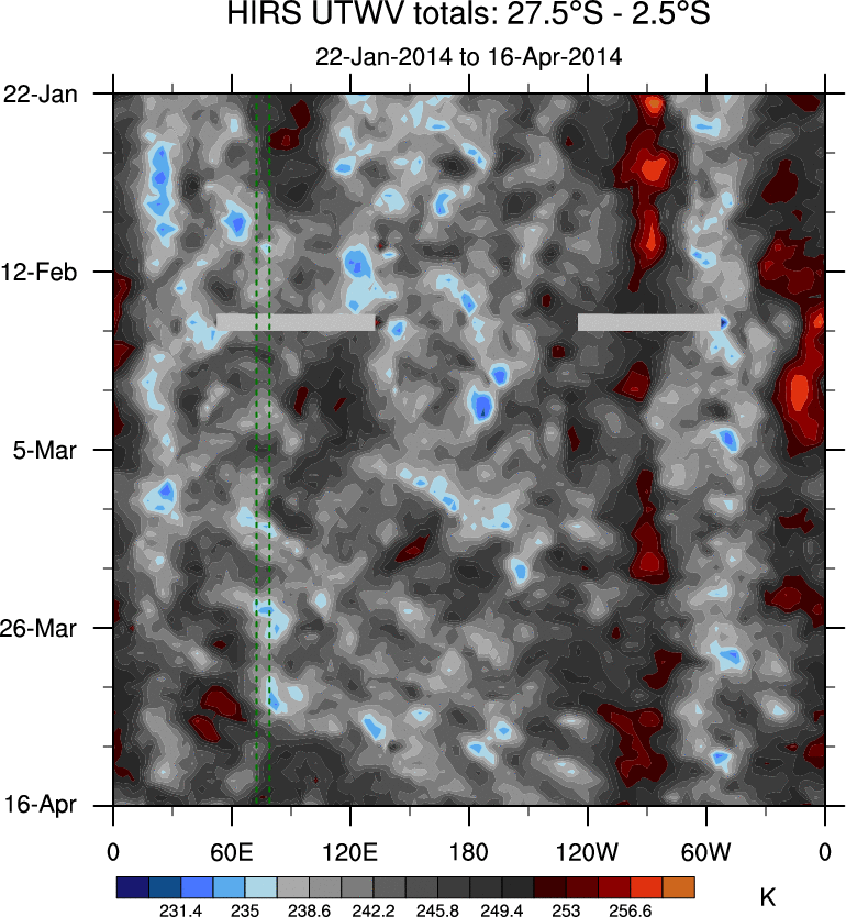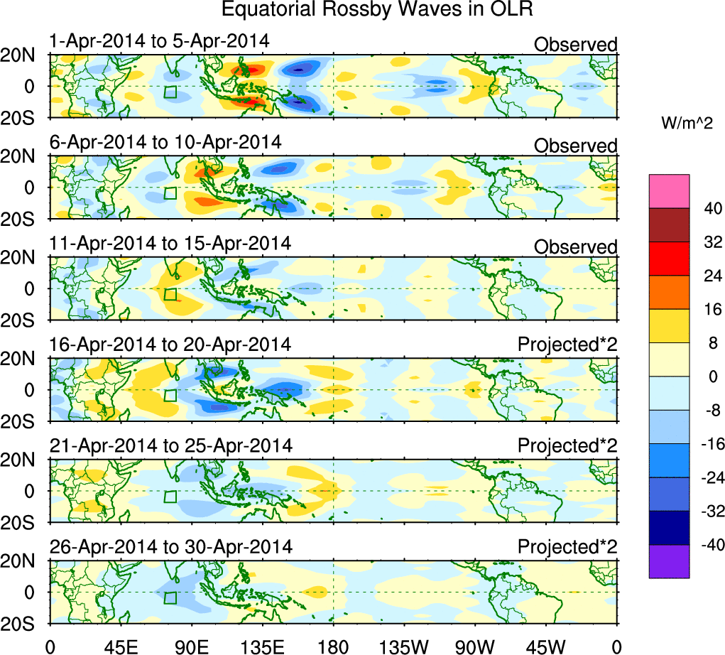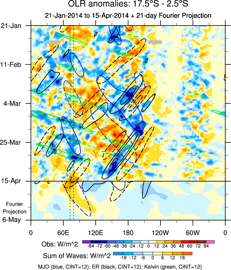 To identify tropical waves in near real-time, the OLR and UTWV data are filtered following Wheeler & Weickmann (2001 MWR). The daily anomalies are calculated using the first 3 harmonics of the seasonal cycle for 1979–2009. Missing values are then filled using linear interpolation in space and time. The most recent 365 days of anomalies are padded with 659 days of zeroes, and the result is filtered for each wave type.