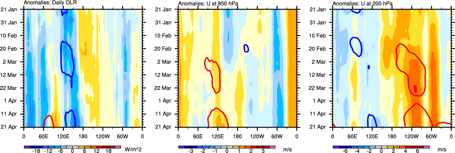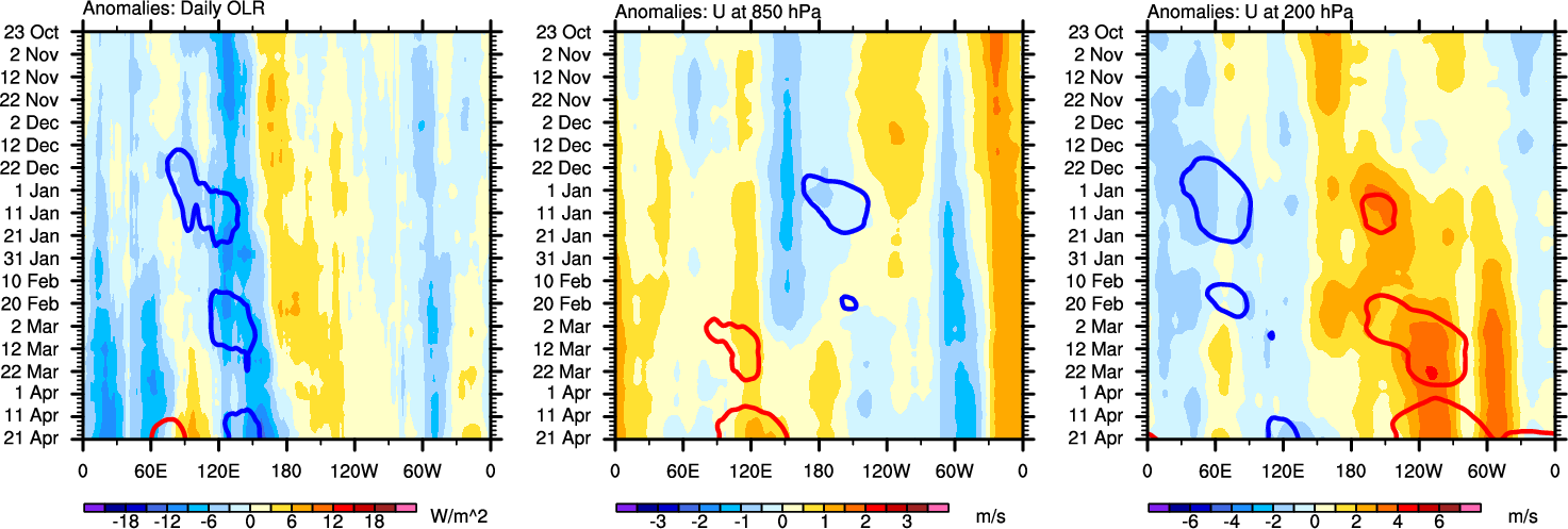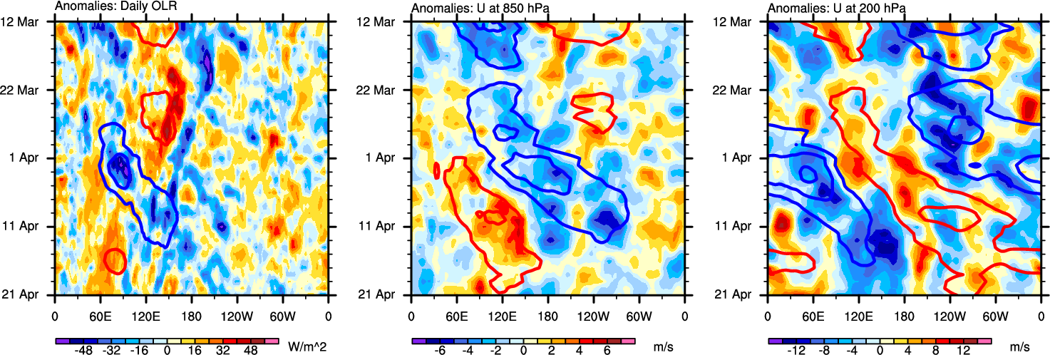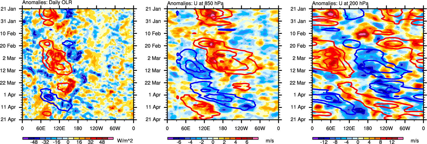 The Hovmollers show longitude-time plots for OLR, U-850, and U-200. The shading indicates the observed anomalies, while the contours are the projection of those anomalies onto the RMM EOFs.