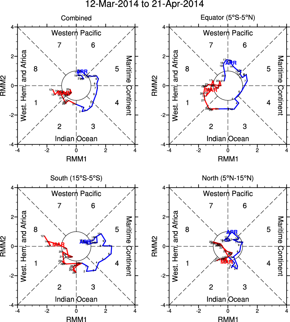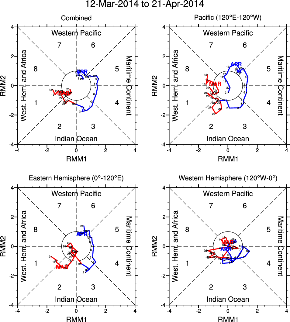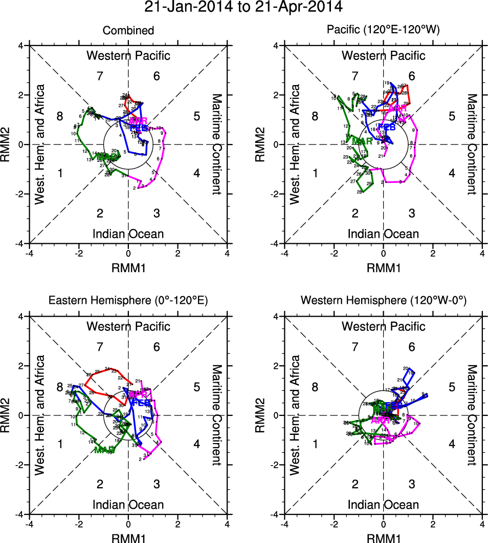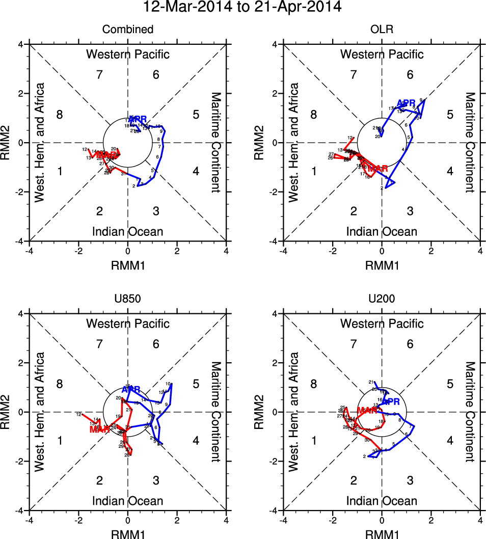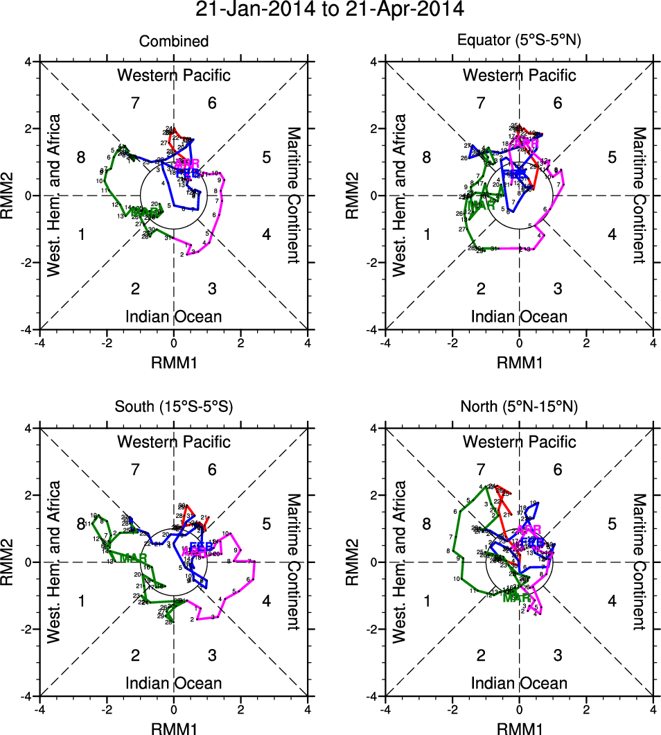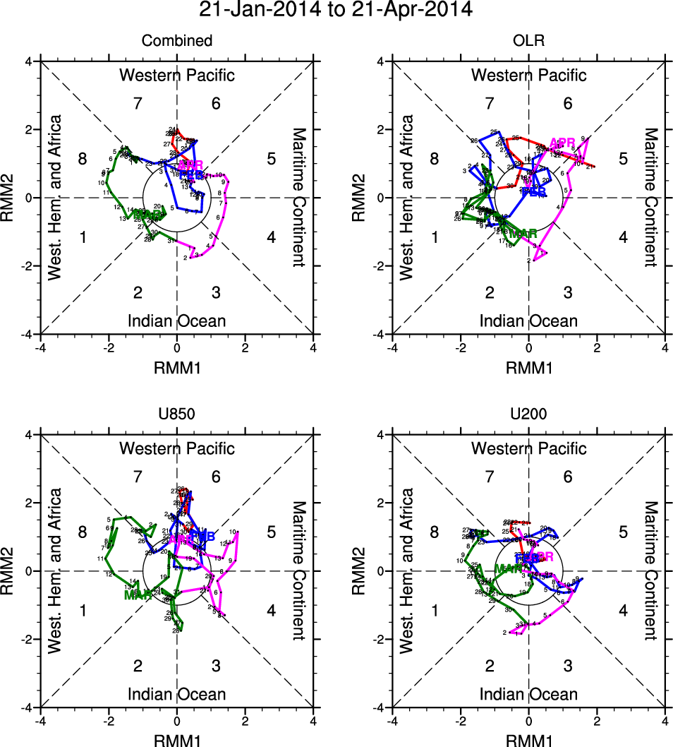 Wheeler and Hendon (2004) constructed the RMM index for monitoring the MJO. This index consists of the first two principal components (PCs) of OLR, 850-hPa zonal wind, and 200-hPa zonal wind averaged 15S-15N.