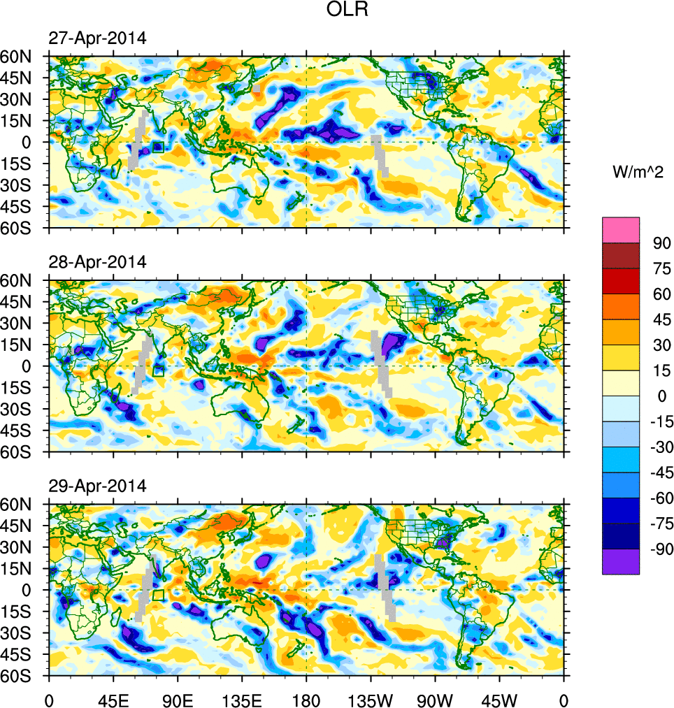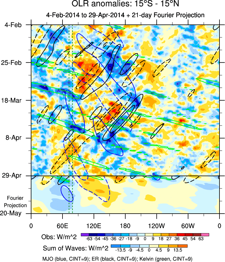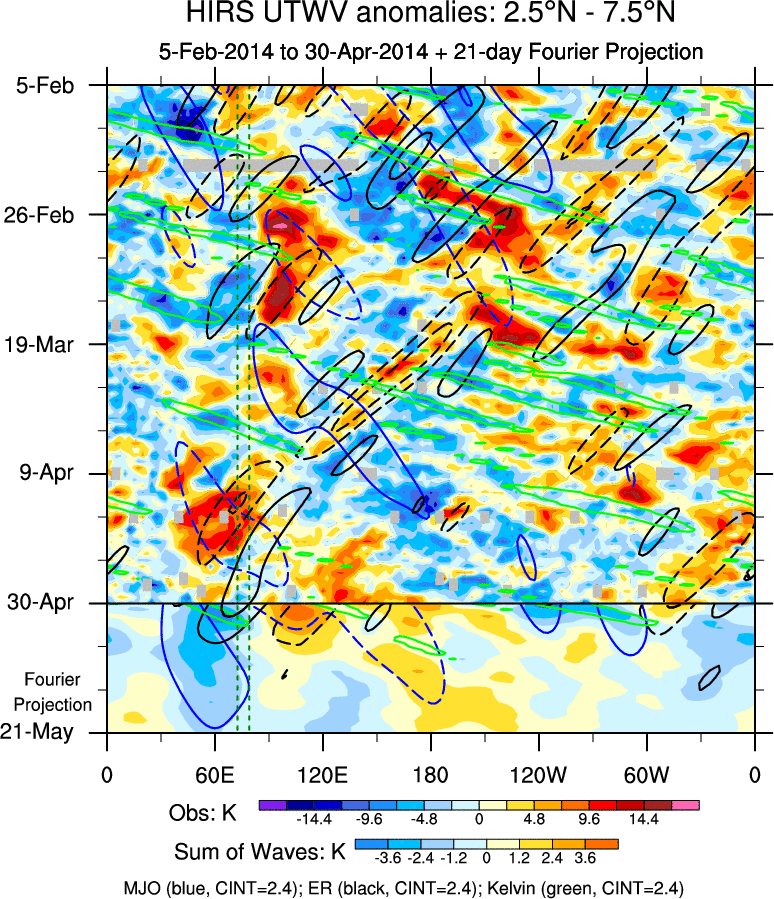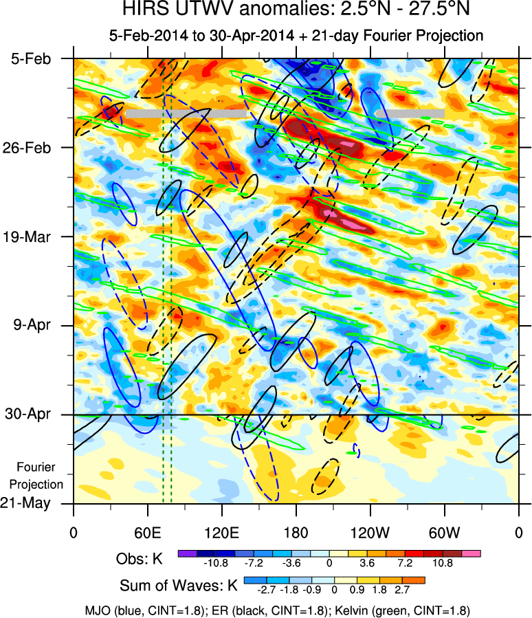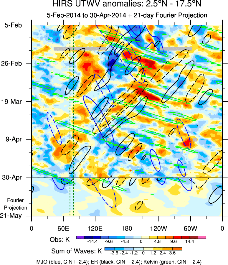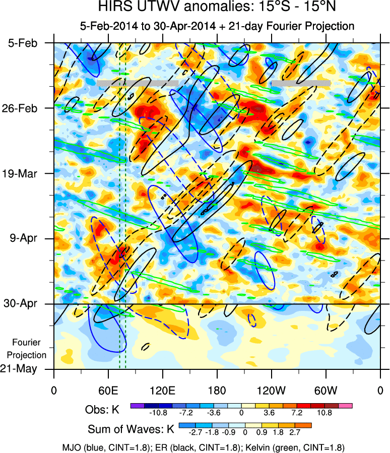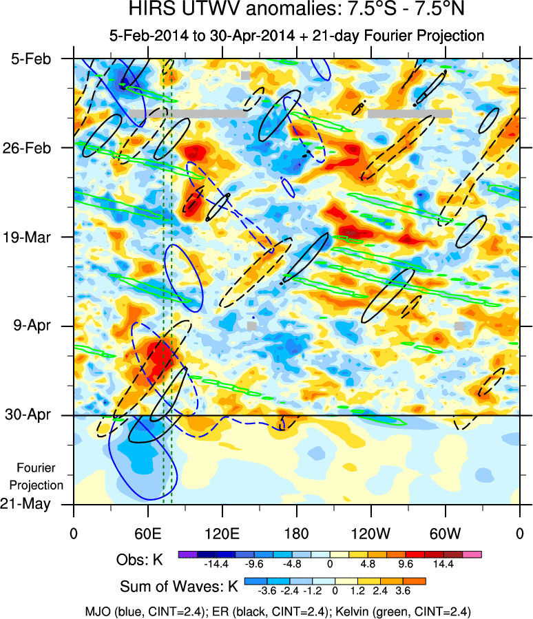 To identify tropical waves in near real-time, the OLR and UTWV data are filtered following Wheeler & Weickmann (2001 MWR). The daily anomalies are calculated using the first 3 harmonics of the seasonal cycle for 1979–2009. Missing values are then filled using linear interpolation in space and time. The most recent 365 days of anomalies are padded with 659 days of zeroes, and the result is filtered for each wave type.