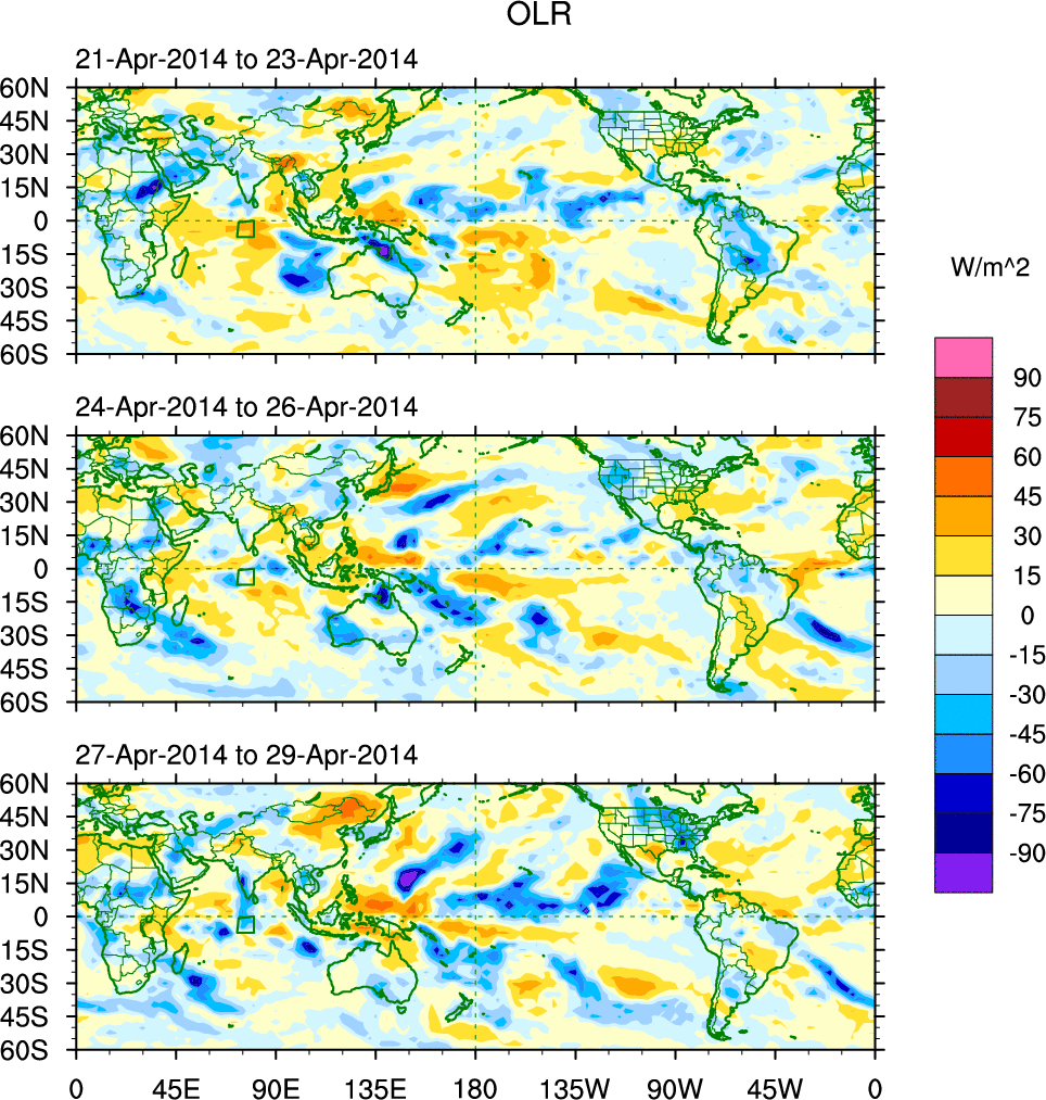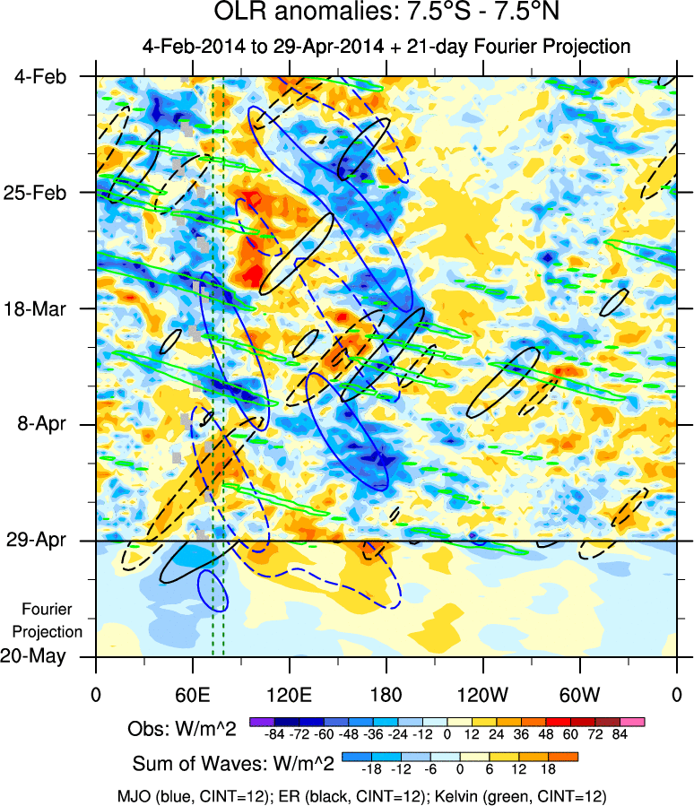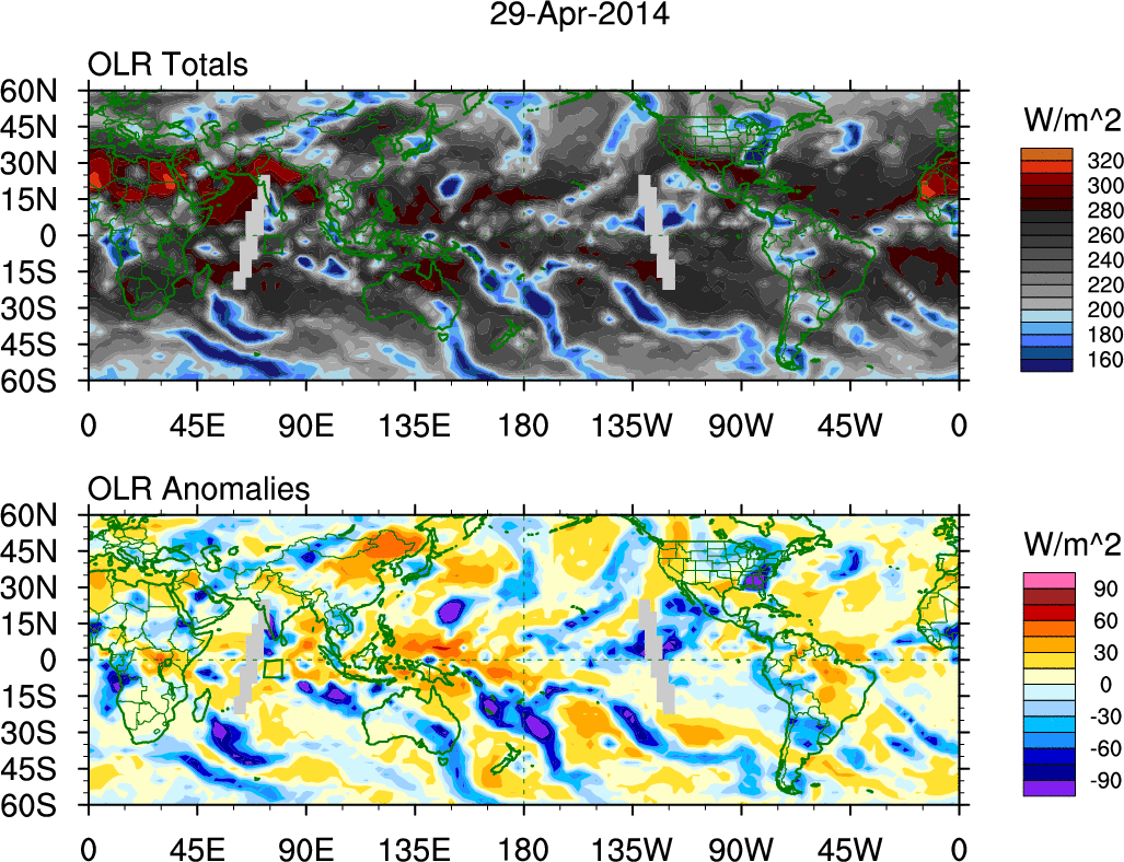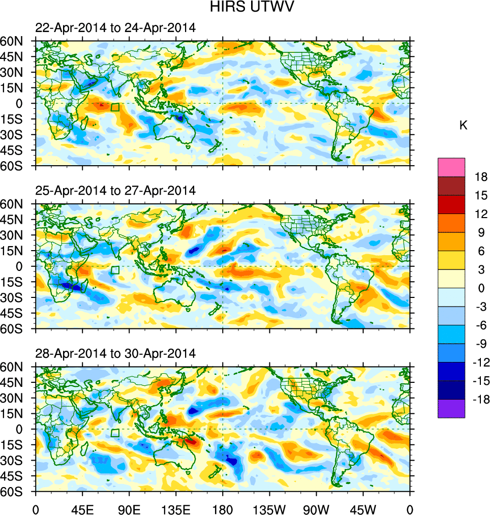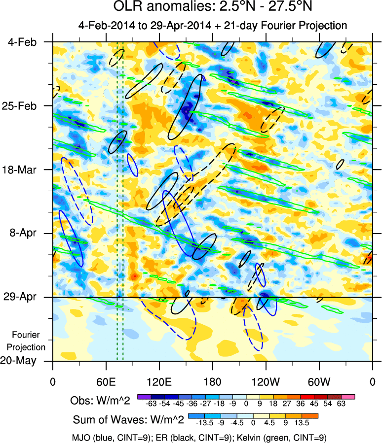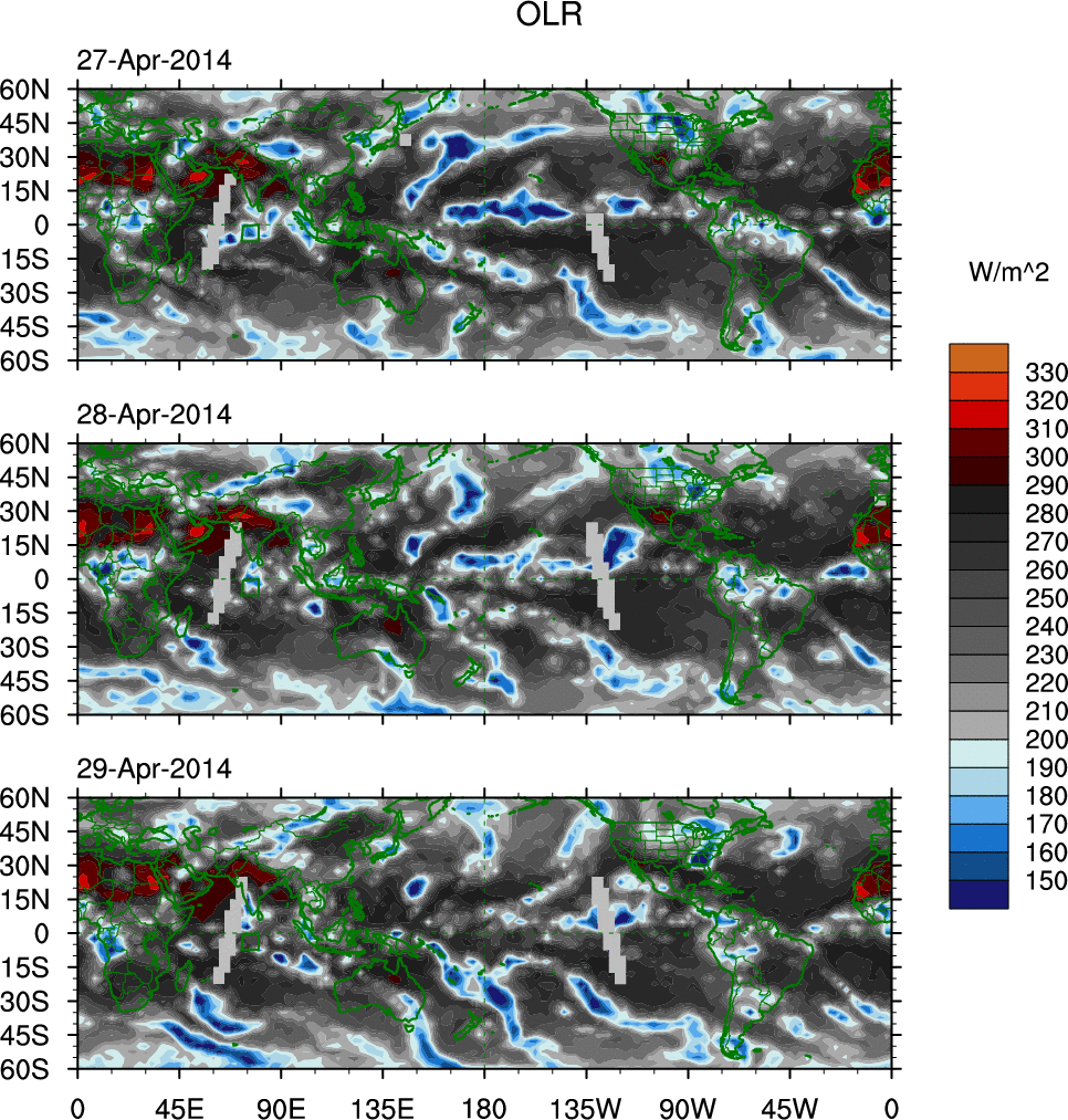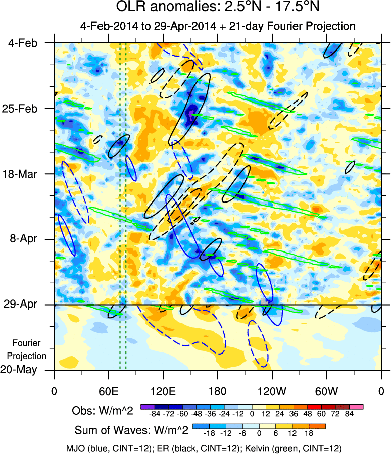 To identify tropical waves in near real-time, the OLR and UTWV data are filtered following Wheeler & Weickmann (2001 MWR). The daily anomalies are calculated using the first 3 harmonics of the seasonal cycle for 1979–2009. Missing values are then filled using linear interpolation in space and time. The most recent 365 days of anomalies are padded with 659 days of zeroes, and the result is filtered for each wave type.