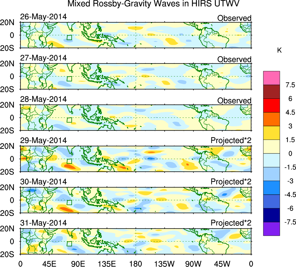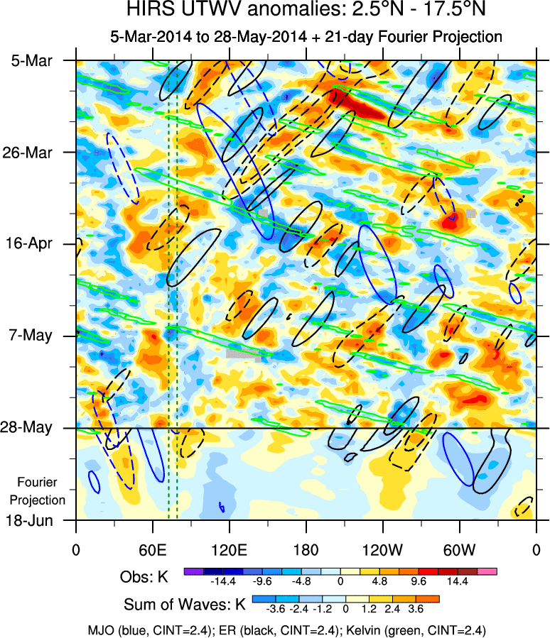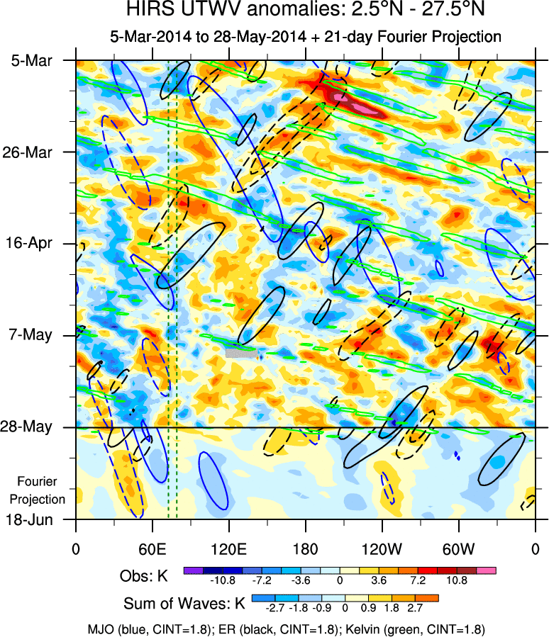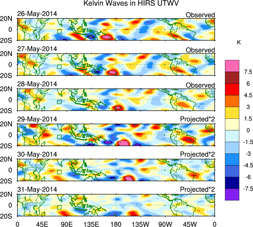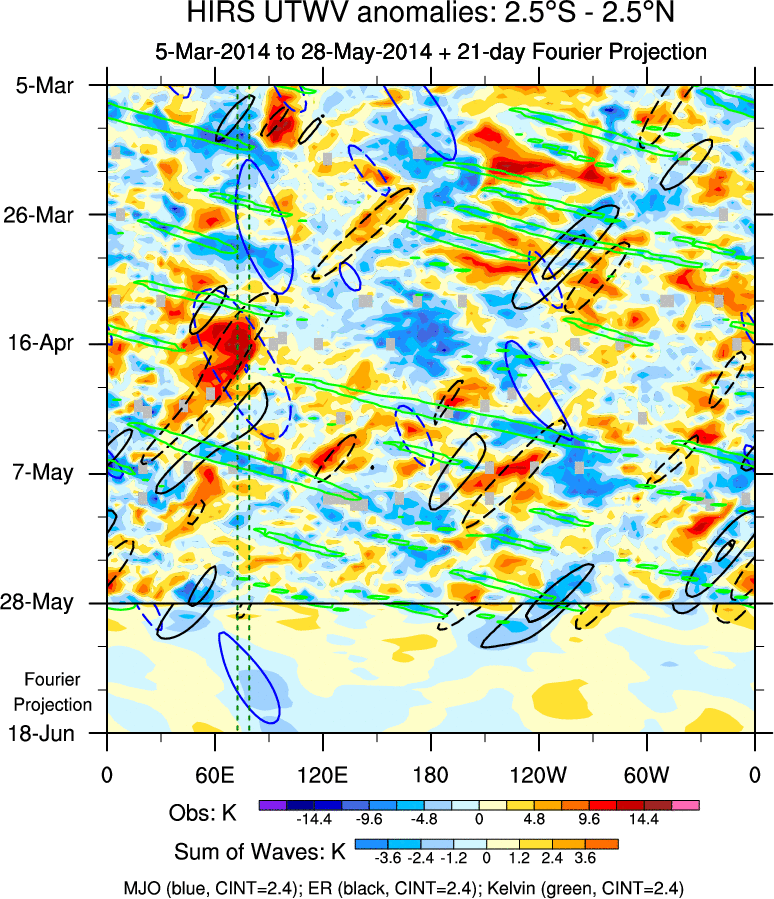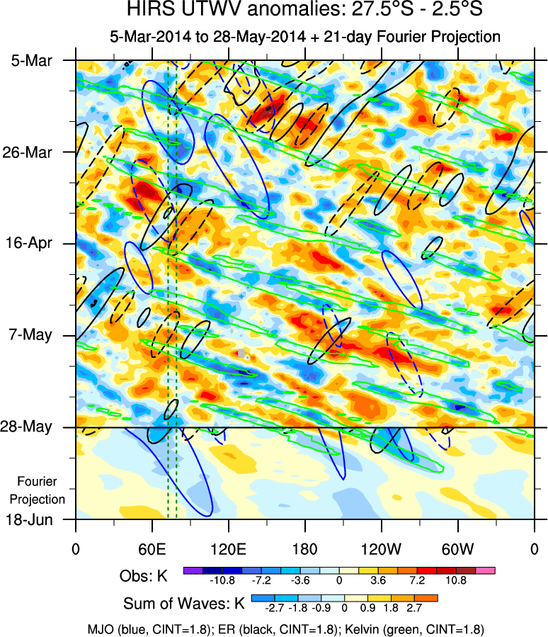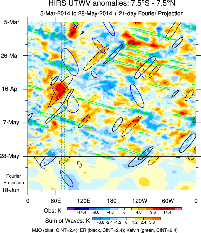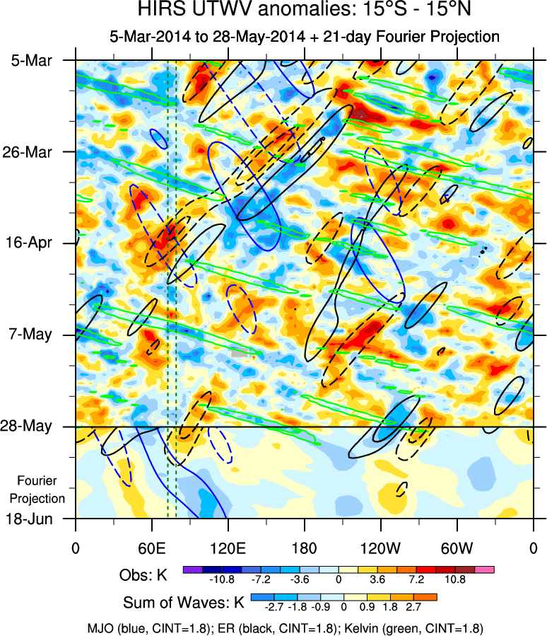 To identify tropical waves in near real-time, the OLR and UTWV data are filtered following Wheeler & Weickmann (2001 MWR). The daily anomalies are calculated using the first 3 harmonics of the seasonal cycle for 1979–2009. Missing values are then filled using linear interpolation in space and time. The most recent 365 days of anomalies are padded with 659 days of zeroes, and the result is filtered for each wave type.