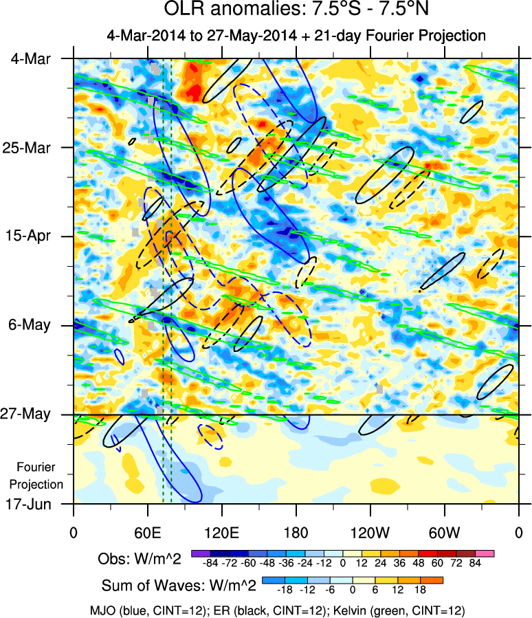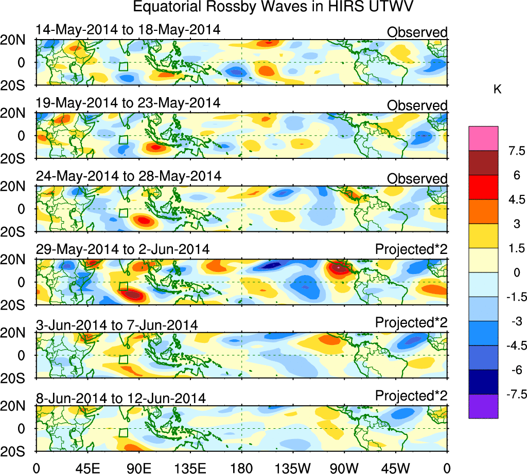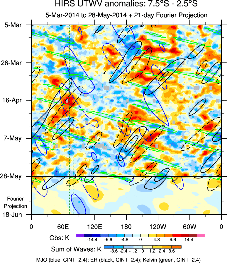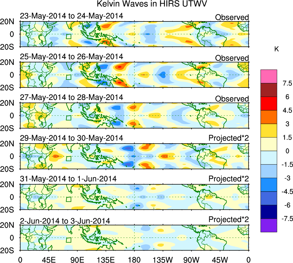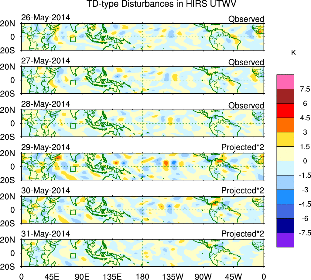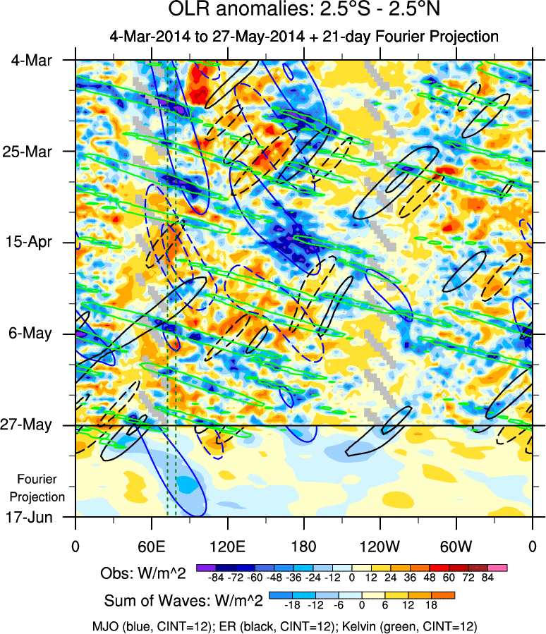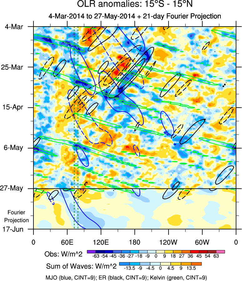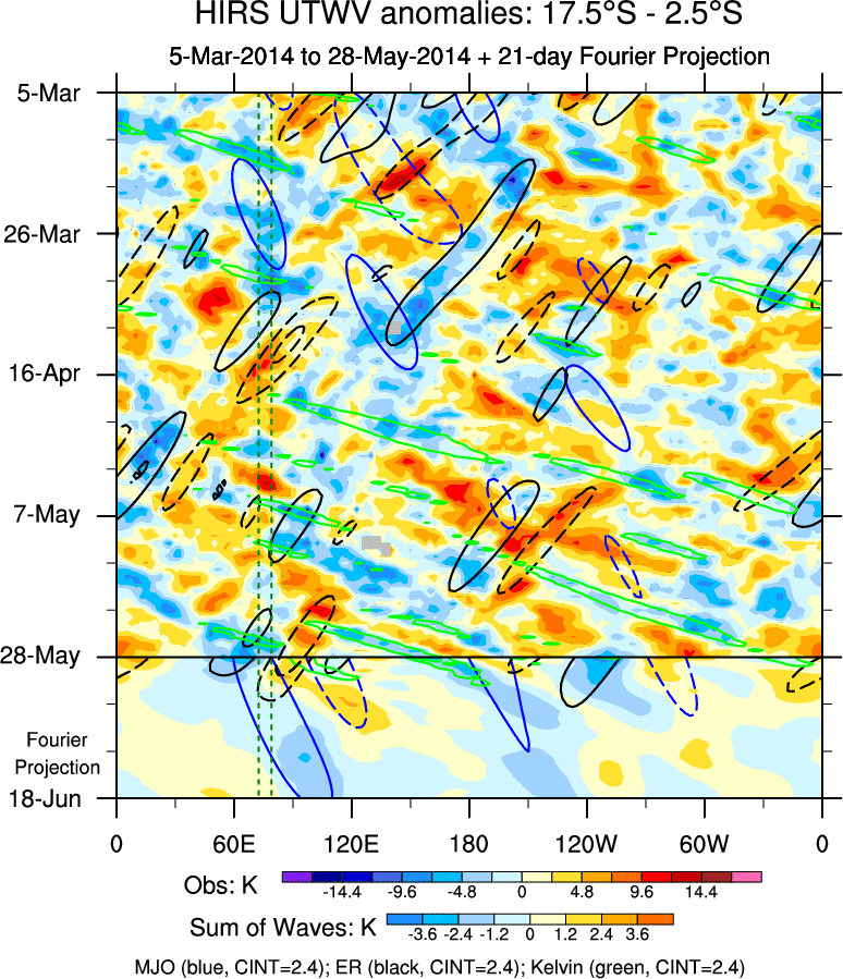 To identify tropical waves in near real-time, the OLR and UTWV data are filtered following Wheeler & Weickmann (2001 MWR). The daily anomalies are calculated using the first 3 harmonics of the seasonal cycle for 1979–2009. Missing values are then filled using linear interpolation in space and time. The most recent 365 days of anomalies are padded with 659 days of zeroes, and the result is filtered for each wave type.