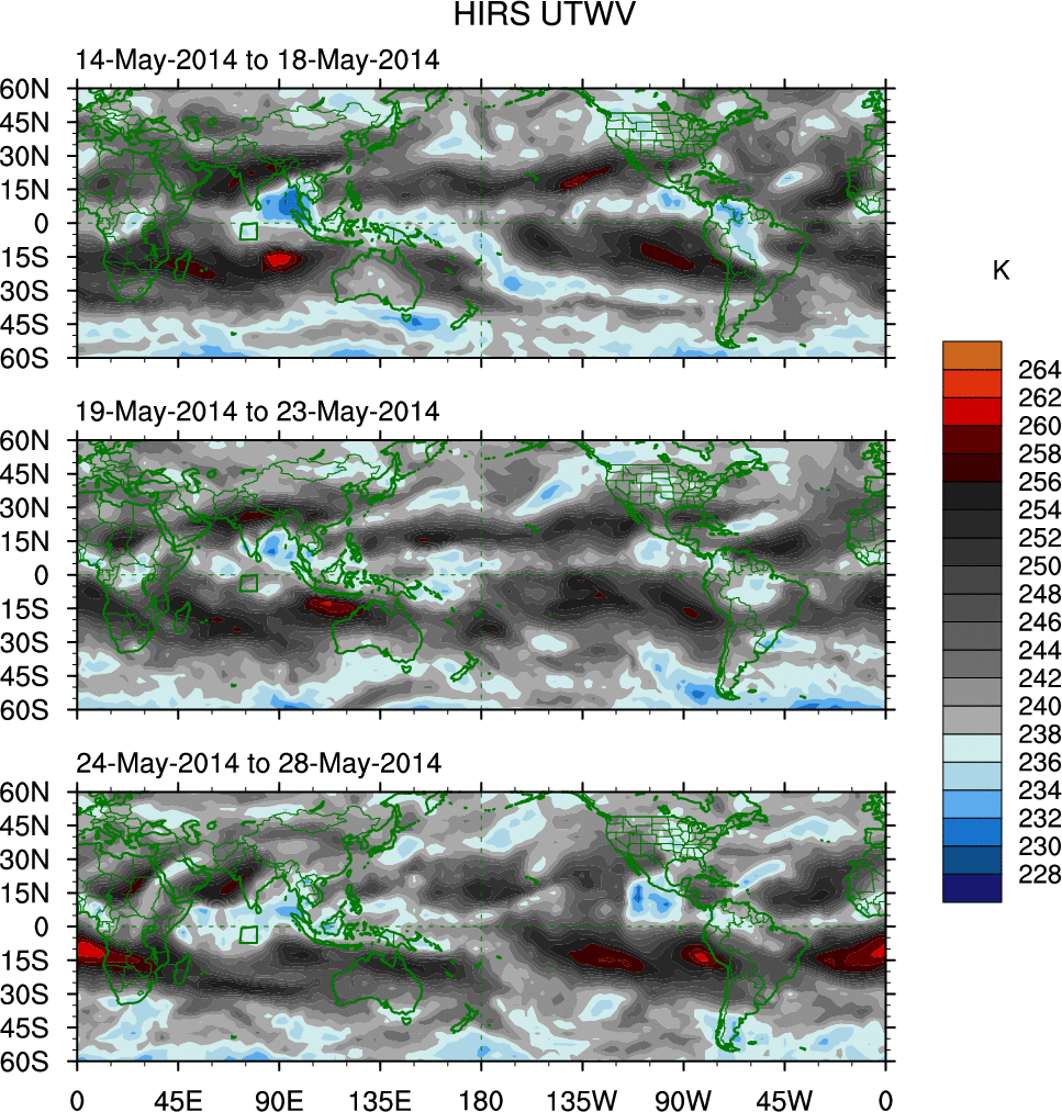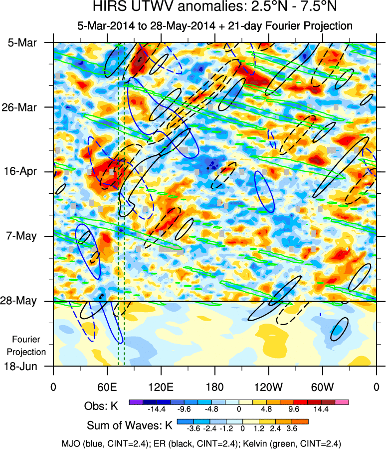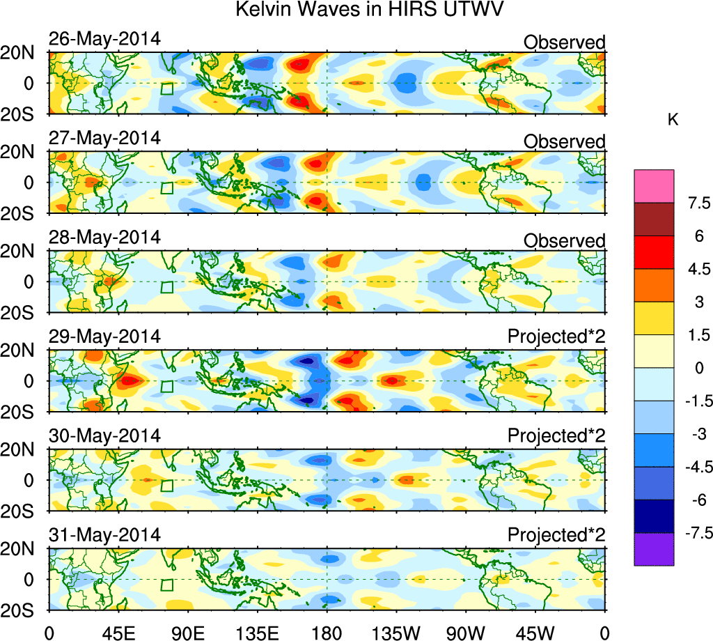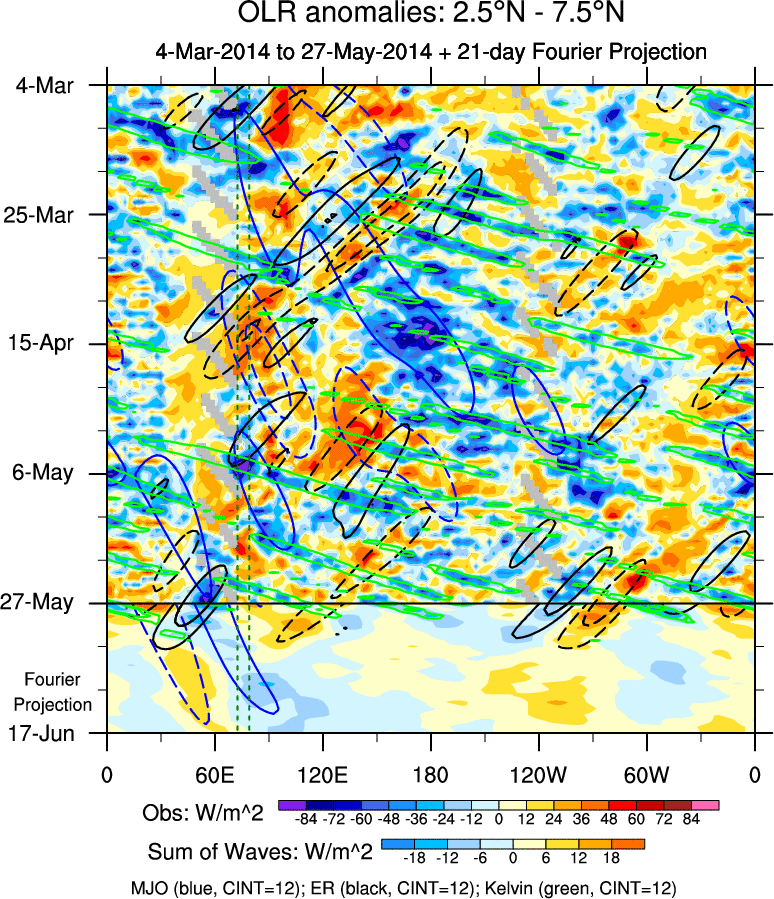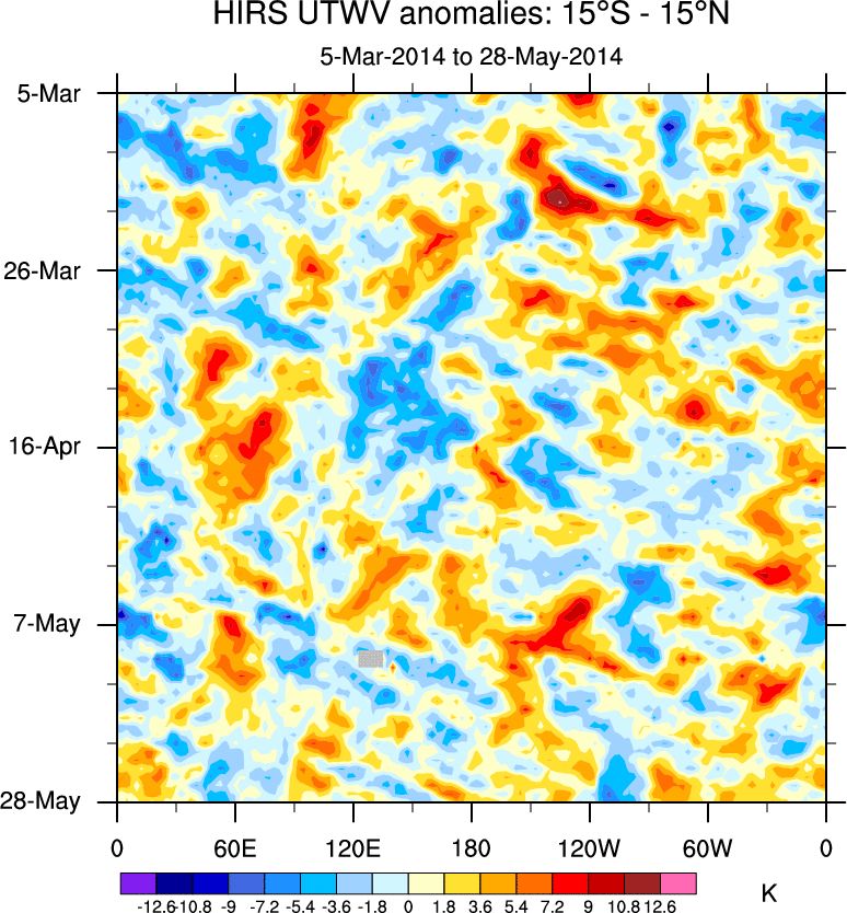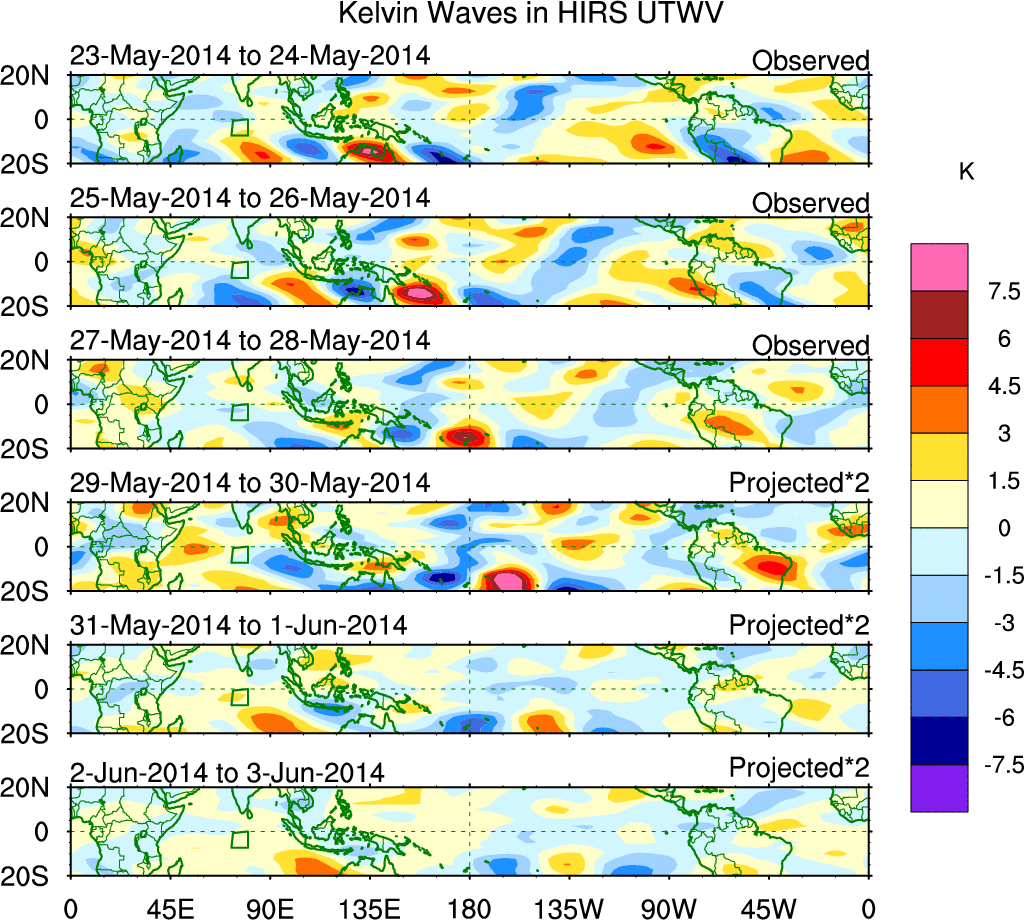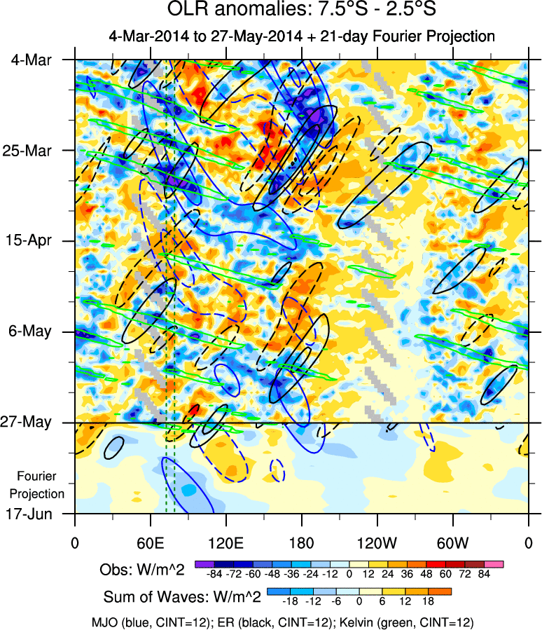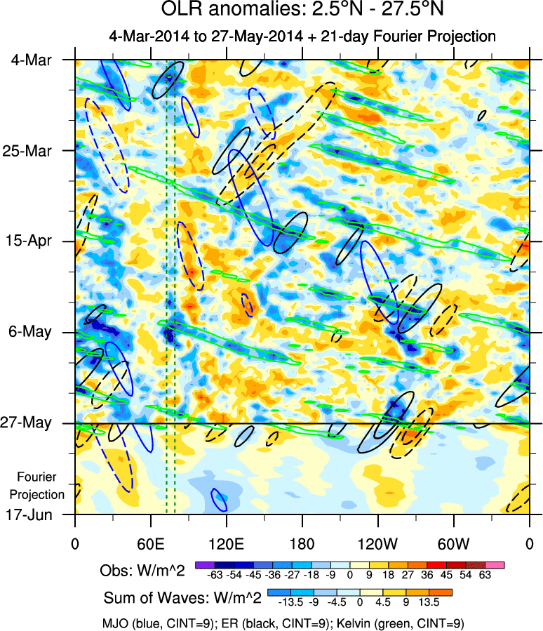 To identify tropical waves in near real-time, the OLR and UTWV data are filtered following Wheeler & Weickmann (2001 MWR). The daily anomalies are calculated using the first 3 harmonics of the seasonal cycle for 1979–2009. Missing values are then filled using linear interpolation in space and time. The most recent 365 days of anomalies are padded with 659 days of zeroes, and the result is filtered for each wave type.