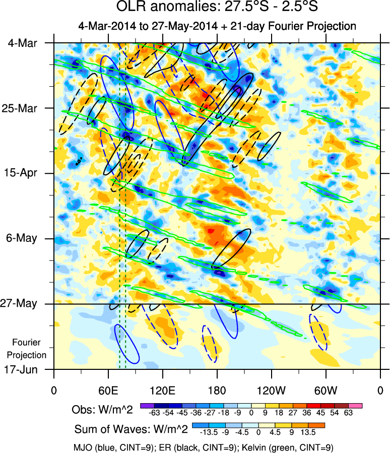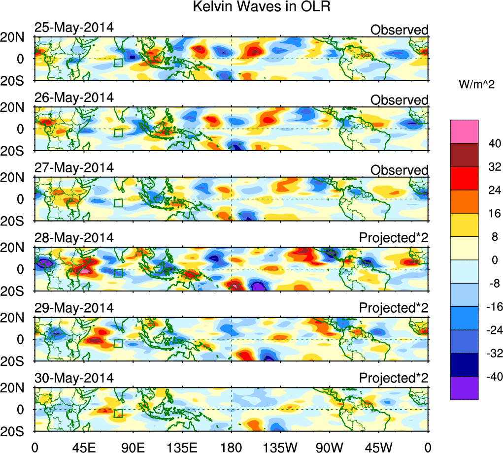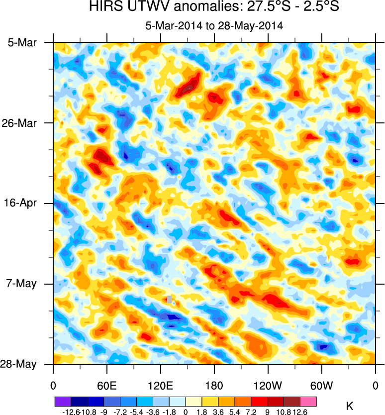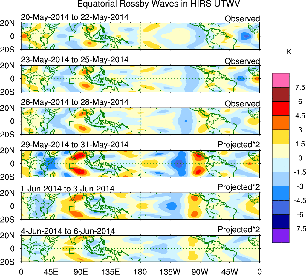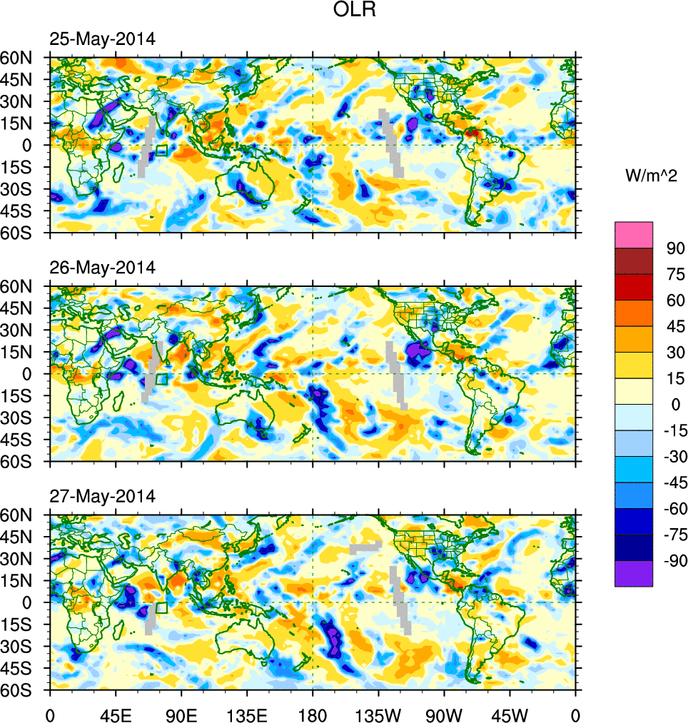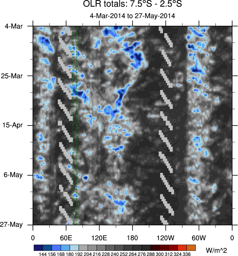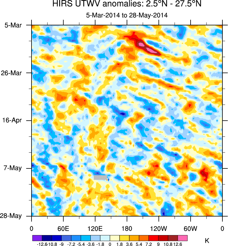 To identify tropical waves in near real-time, the OLR and UTWV data are filtered following Wheeler & Weickmann (2001 MWR). The daily anomalies are calculated using the first 3 harmonics of the seasonal cycle for 1979–2009. Missing values are then filled using linear interpolation in space and time. The most recent 365 days of anomalies are padded with 659 days of zeroes, and the result is filtered for each wave type.