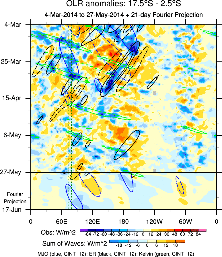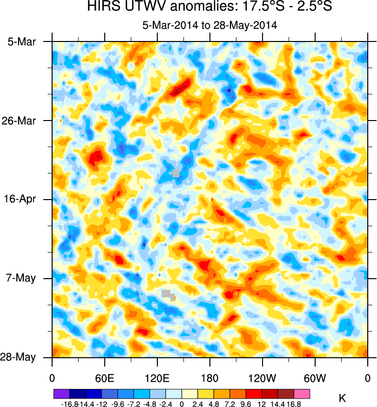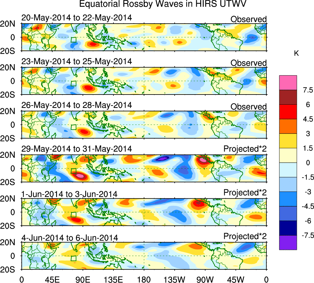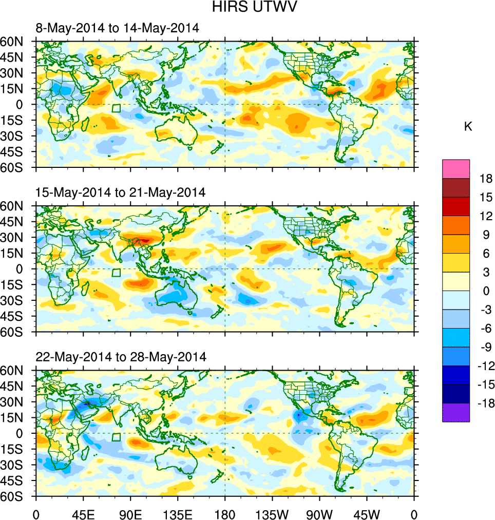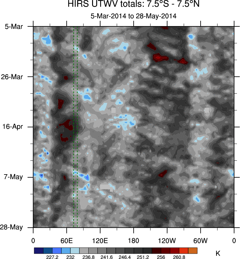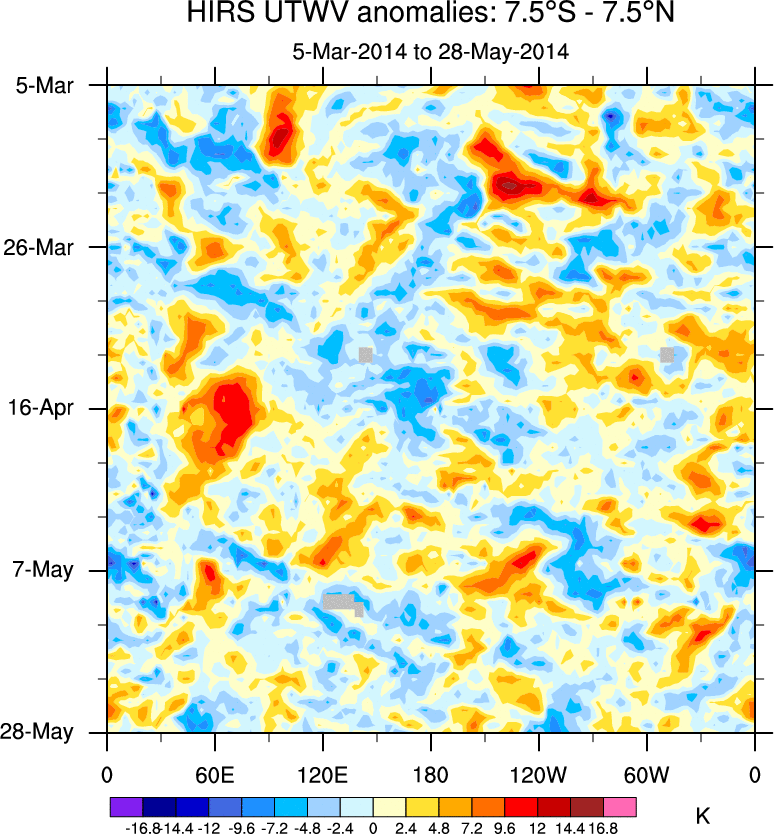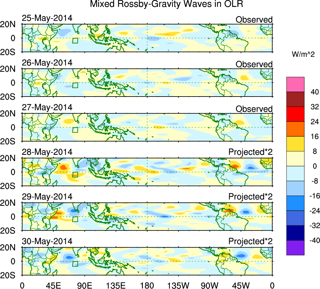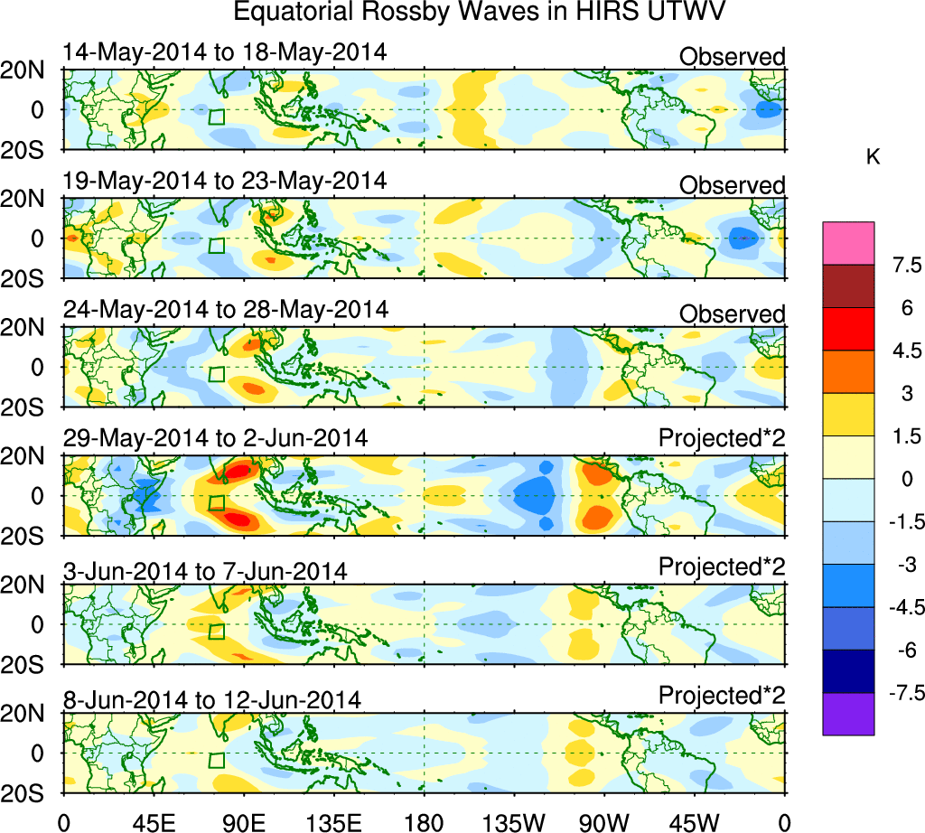 To identify tropical waves in near real-time, the OLR and UTWV data are filtered following Wheeler & Weickmann (2001 MWR). The daily anomalies are calculated using the first 3 harmonics of the seasonal cycle for 1979–2009. Missing values are then filled using linear interpolation in space and time. The most recent 365 days of anomalies are padded with 659 days of zeroes, and the result is filtered for each wave type.