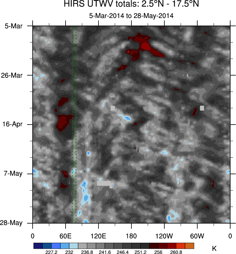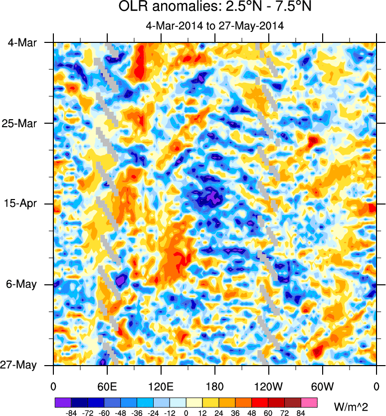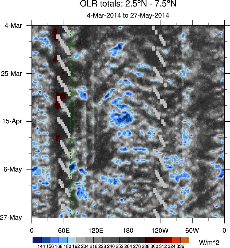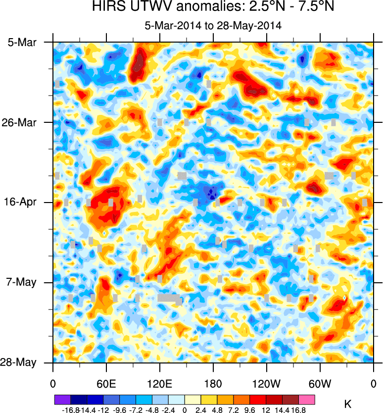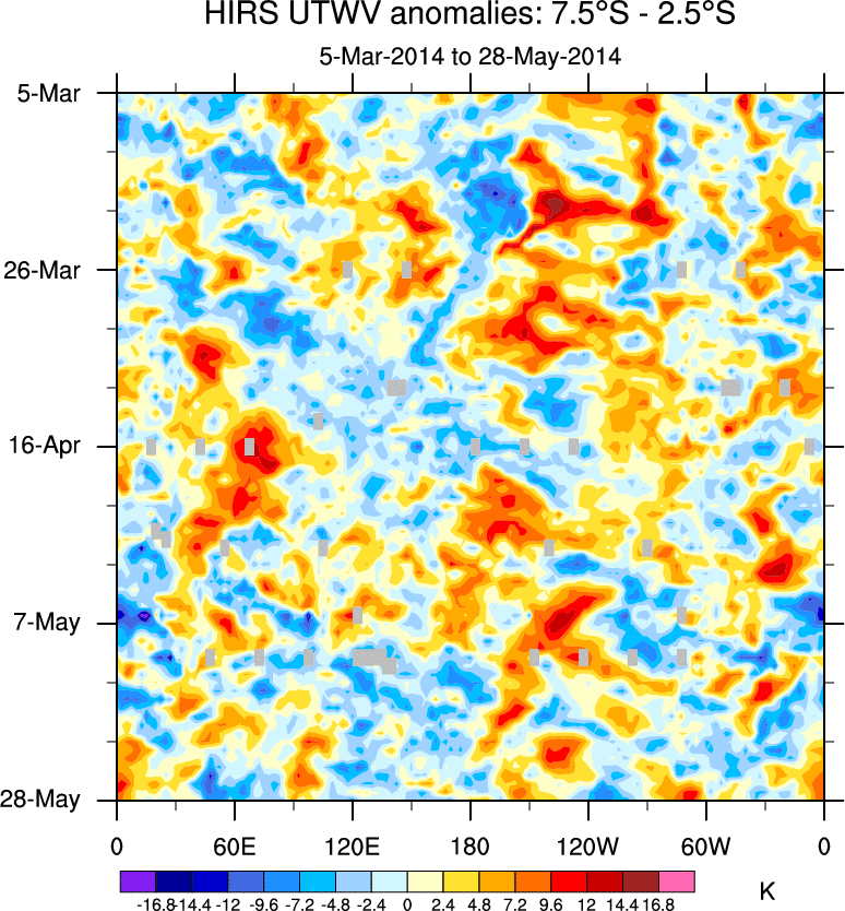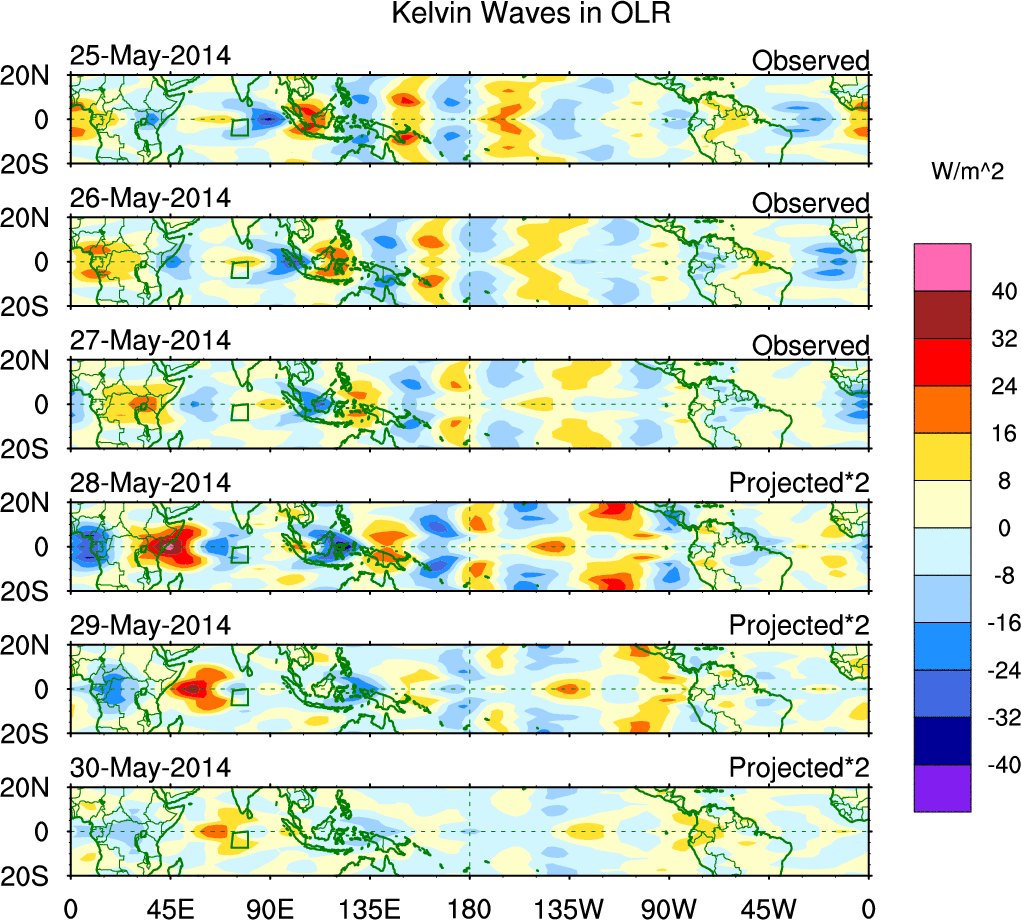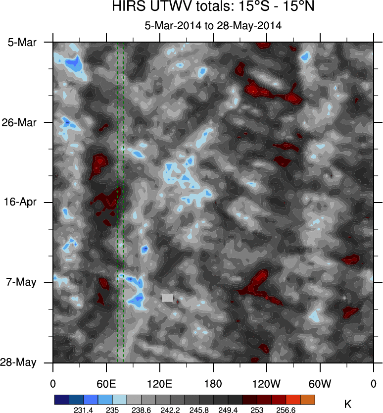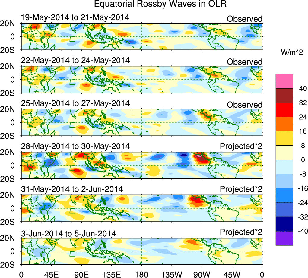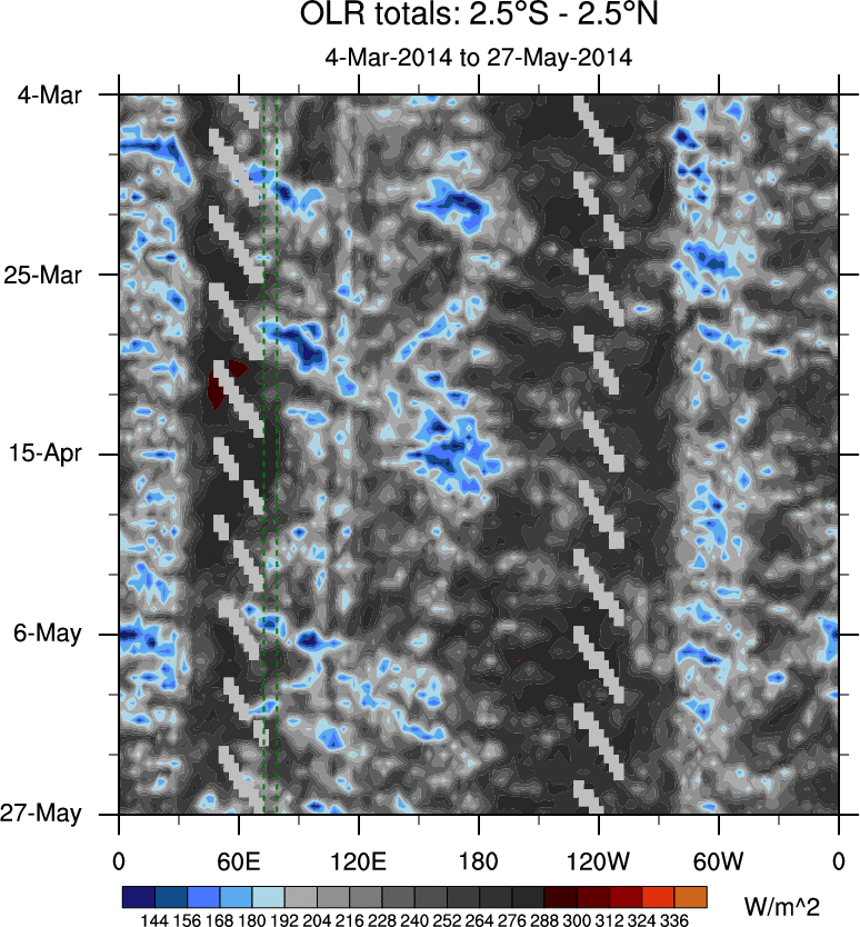 To identify tropical waves in near real-time, the OLR and UTWV data are filtered following Wheeler & Weickmann (2001 MWR). The daily anomalies are calculated using the first 3 harmonics of the seasonal cycle for 1979–2009. Missing values are then filled using linear interpolation in space and time. The most recent 365 days of anomalies are padded with 659 days of zeroes, and the result is filtered for each wave type.
