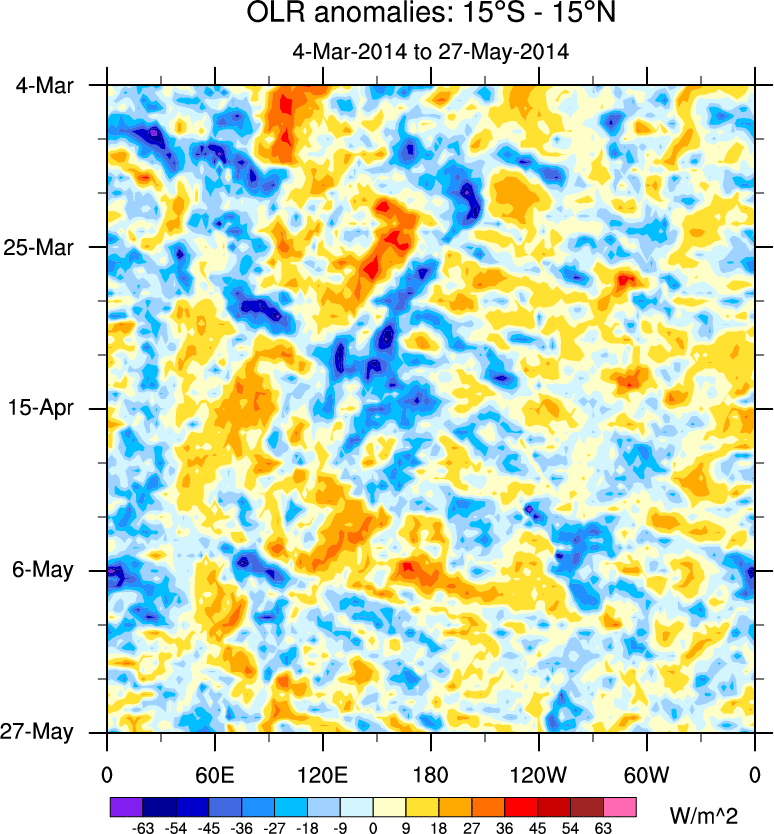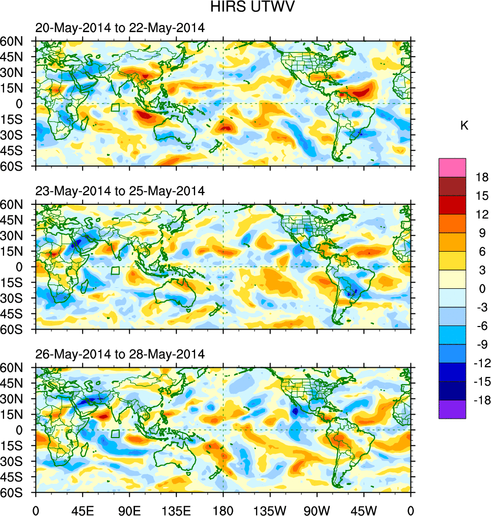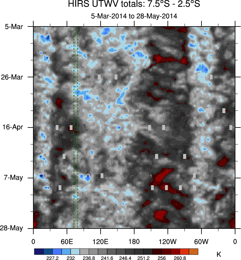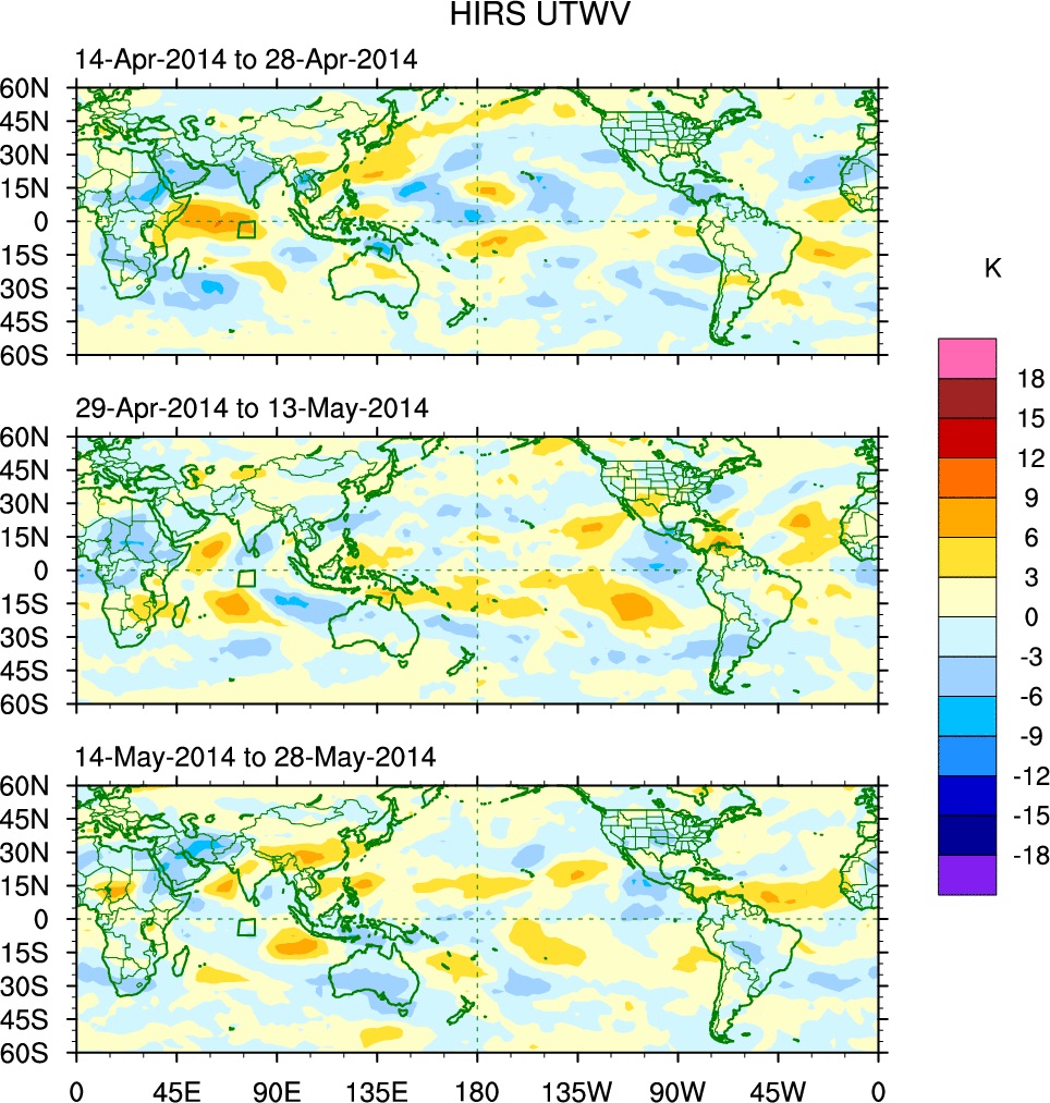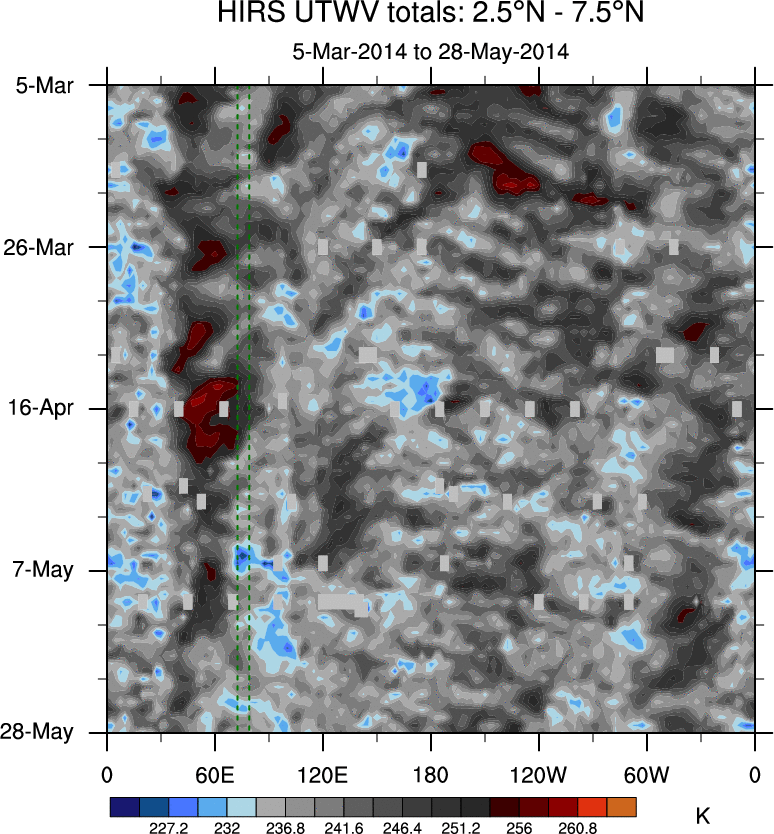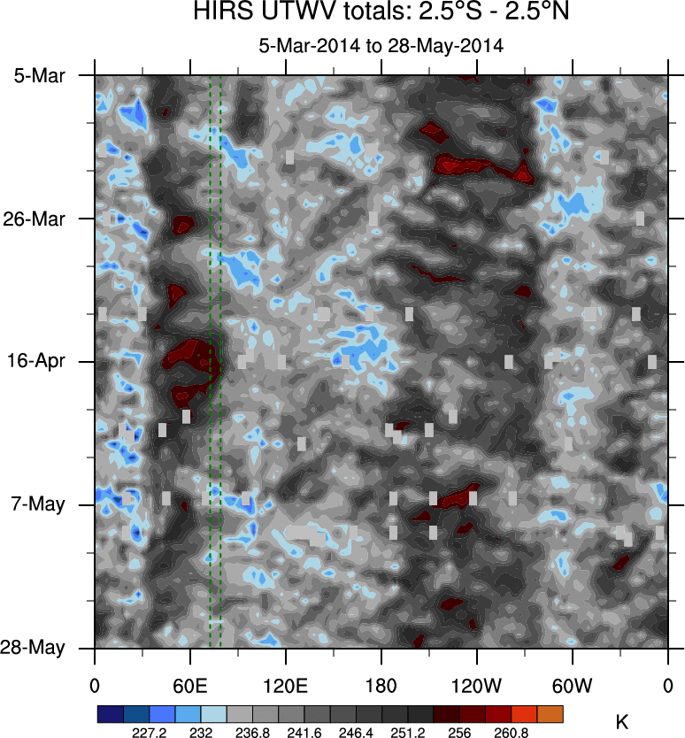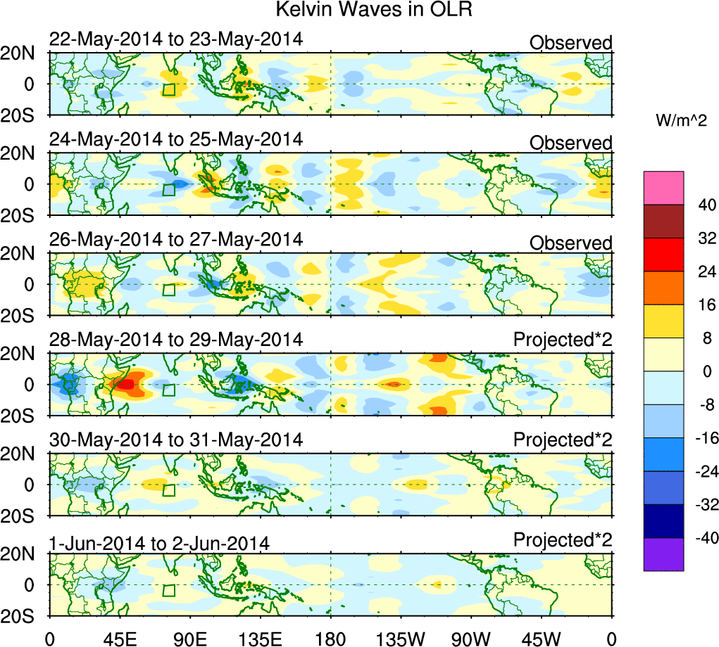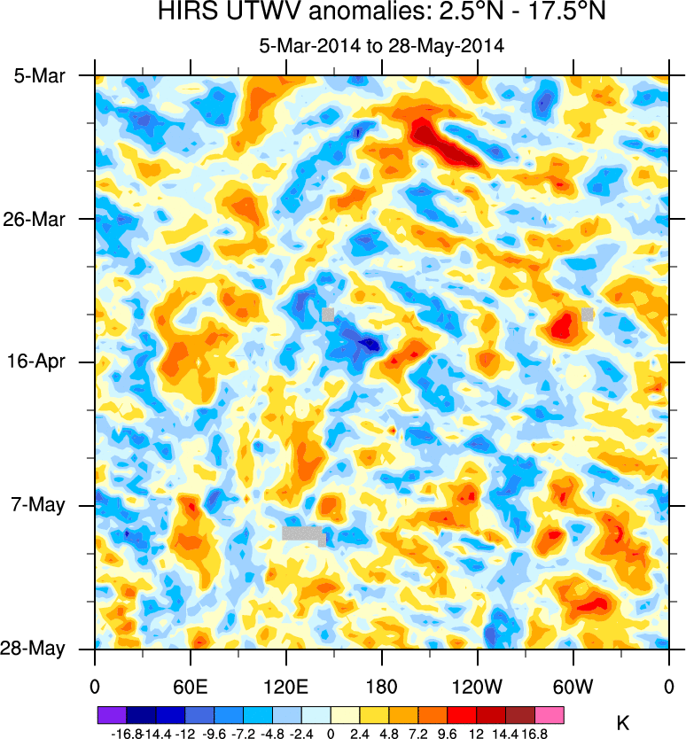 To identify tropical waves in near real-time, the OLR and UTWV data are filtered following Wheeler & Weickmann (2001 MWR). The daily anomalies are calculated using the first 3 harmonics of the seasonal cycle for 1979–2009. Missing values are then filled using linear interpolation in space and time. The most recent 365 days of anomalies are padded with 659 days of zeroes, and the result is filtered for each wave type.