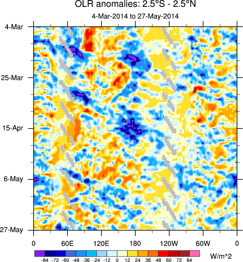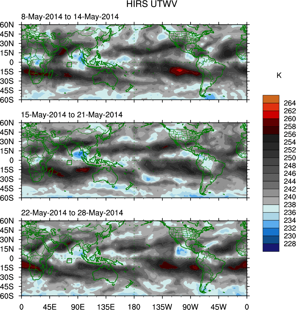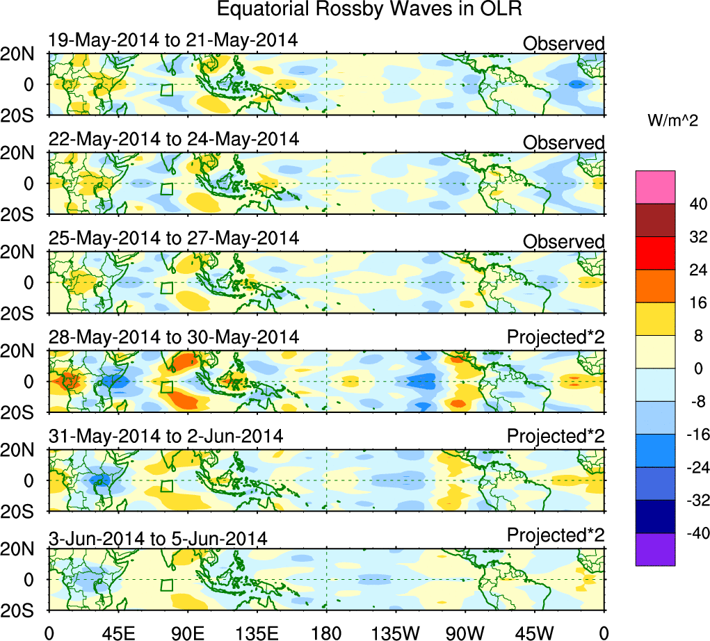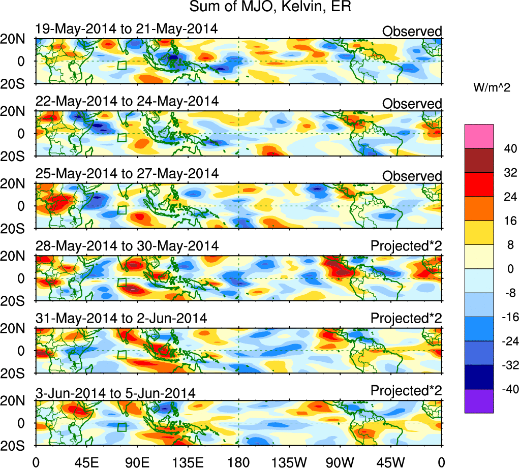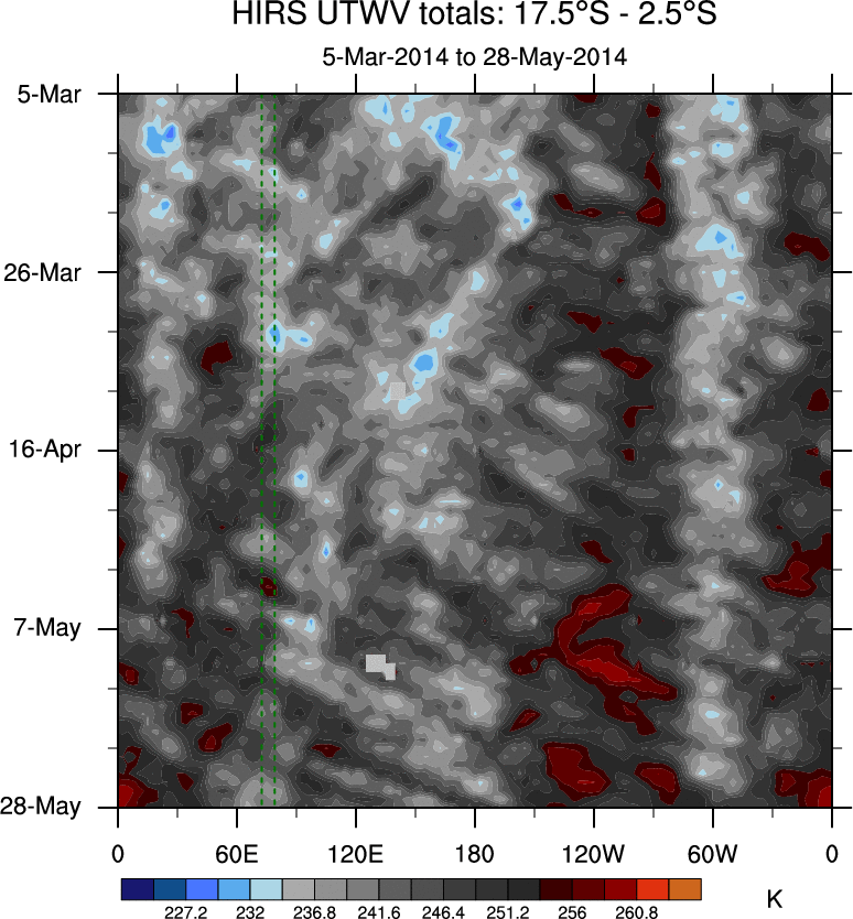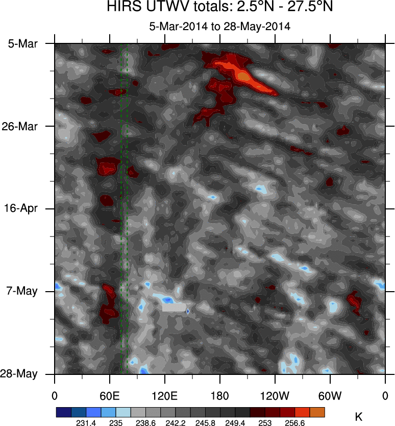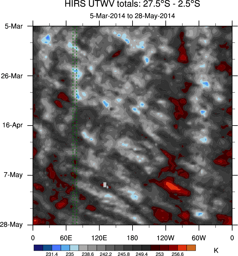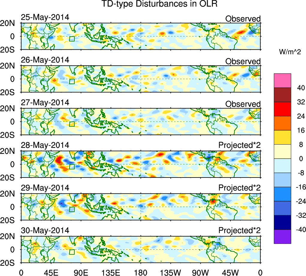 To identify tropical waves in near real-time, the OLR and UTWV data are filtered following Wheeler & Weickmann (2001 MWR). The daily anomalies are calculated using the first 3 harmonics of the seasonal cycle for 1979–2009. Missing values are then filled using linear interpolation in space and time. The most recent 365 days of anomalies are padded with 659 days of zeroes, and the result is filtered for each wave type.