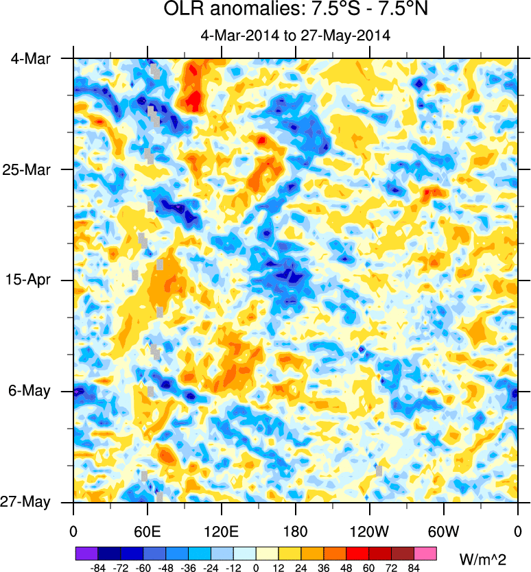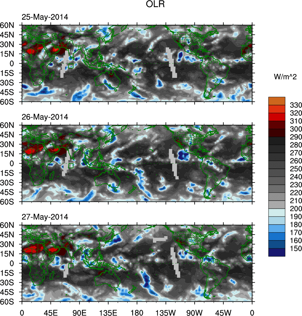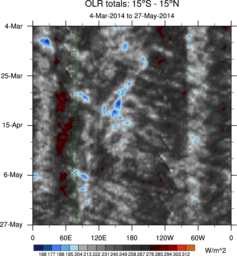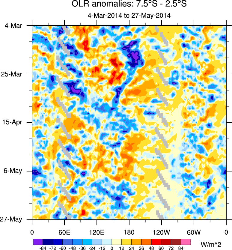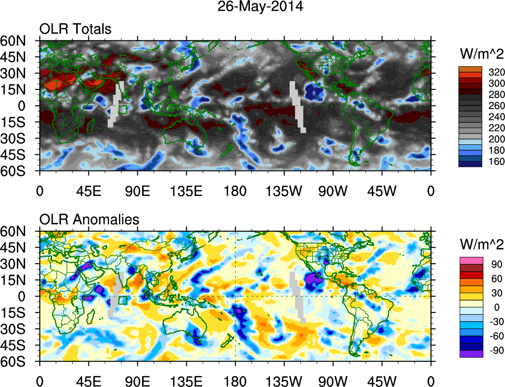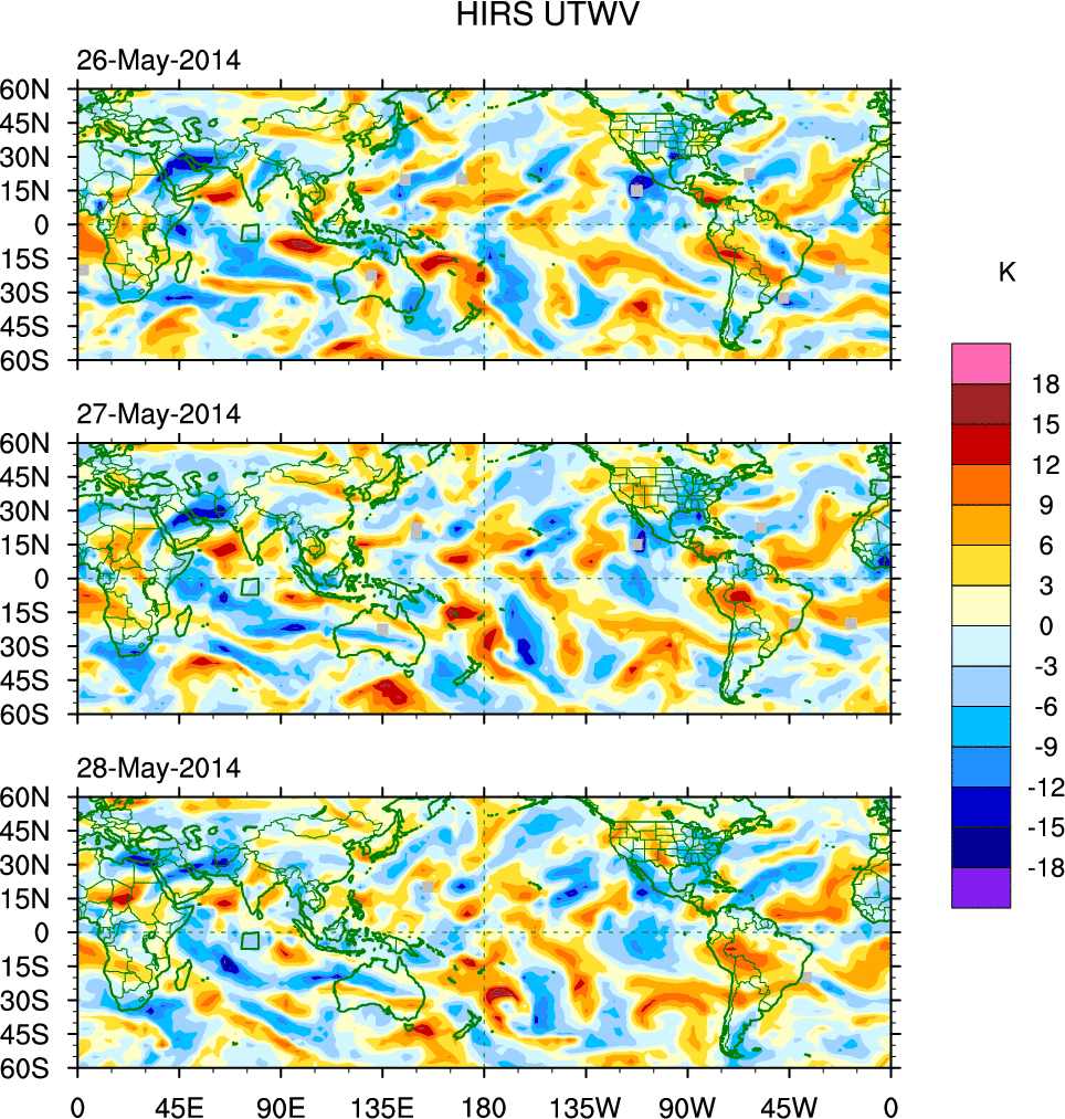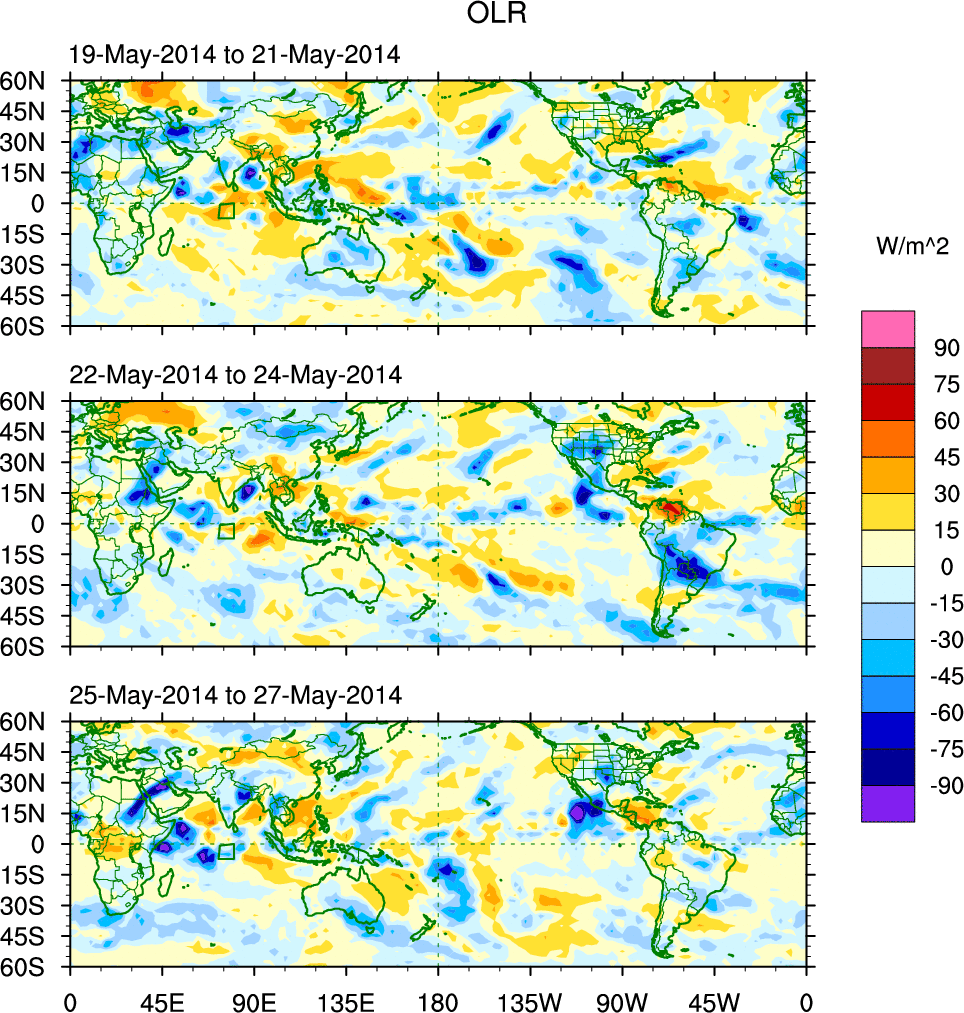 To identify tropical waves in near real-time, the OLR and UTWV data are filtered following Wheeler & Weickmann (2001 MWR). The daily anomalies are calculated using the first 3 harmonics of the seasonal cycle for 1979–2009. Missing values are then filled using linear interpolation in space and time. The most recent 365 days of anomalies are padded with 659 days of zeroes, and the result is filtered for each wave type.