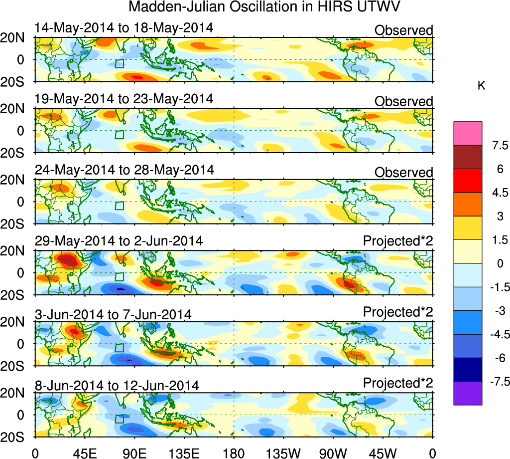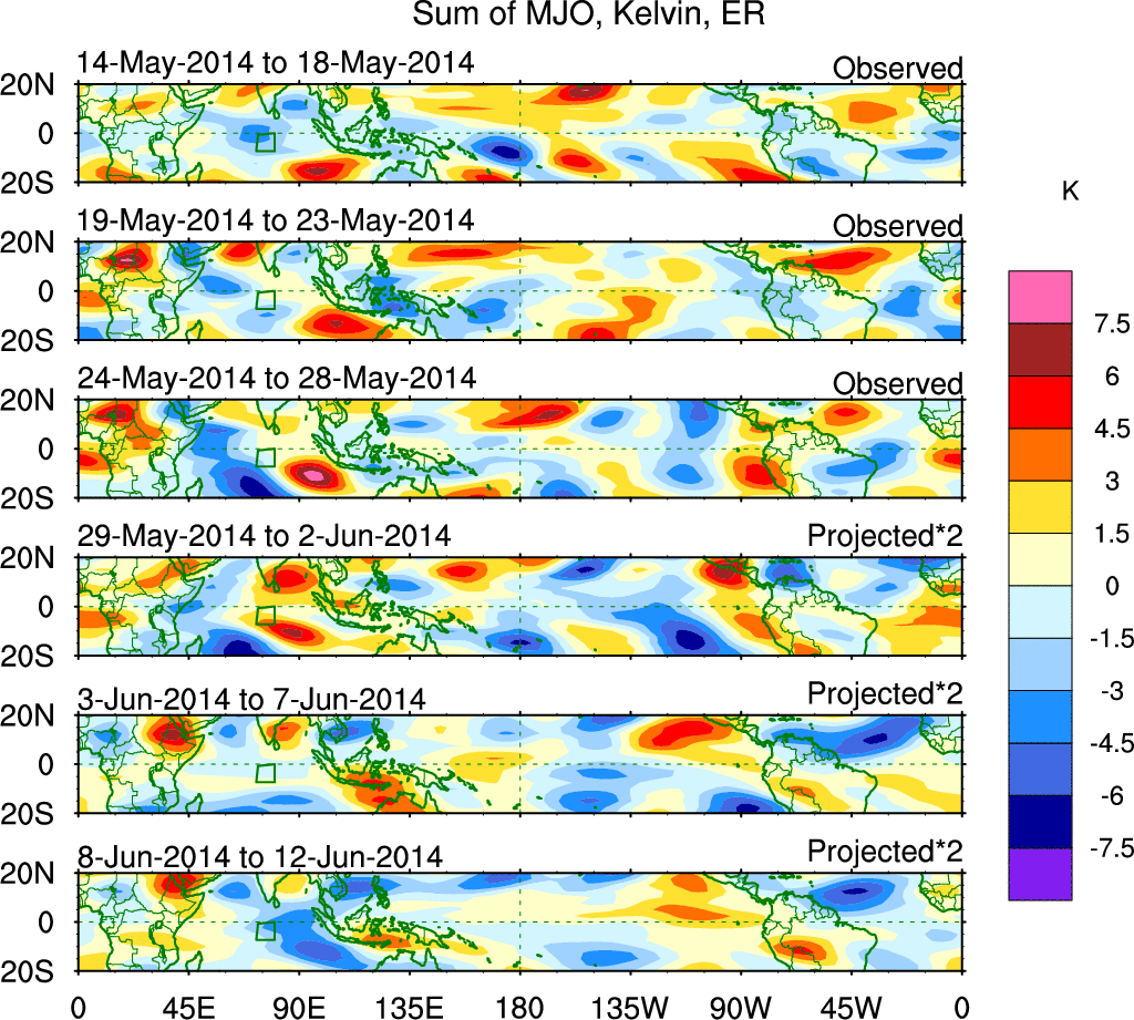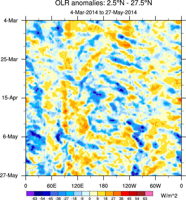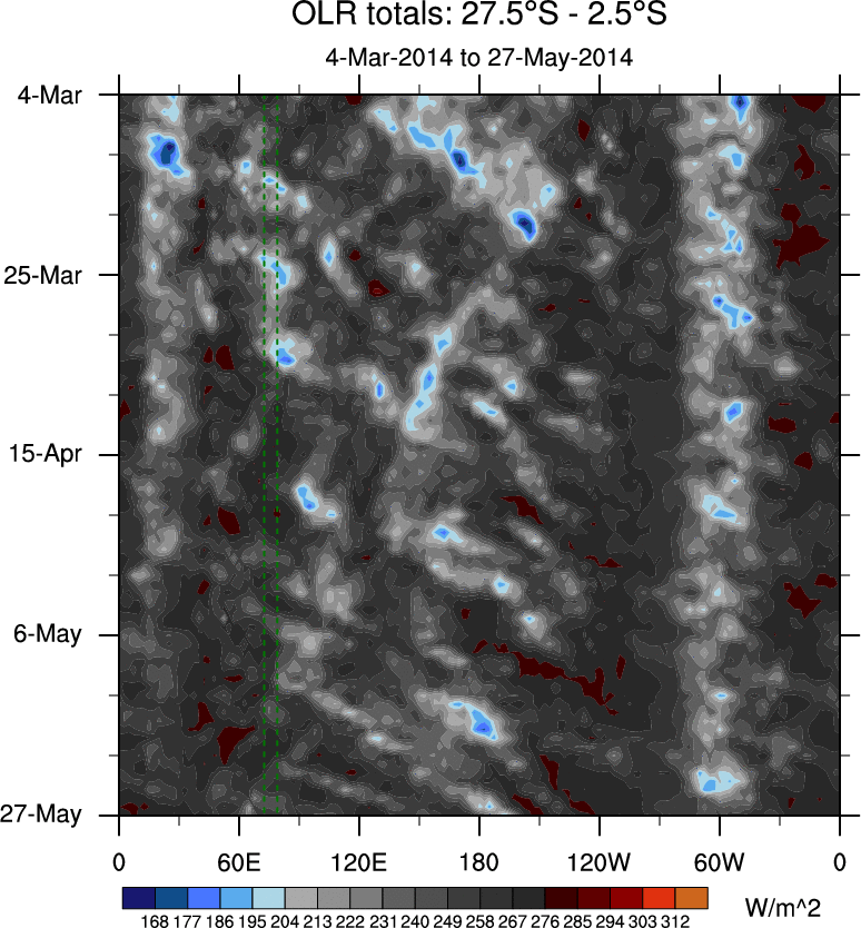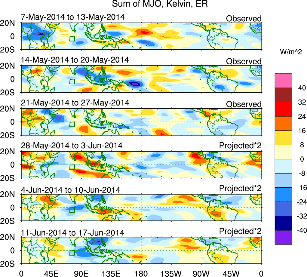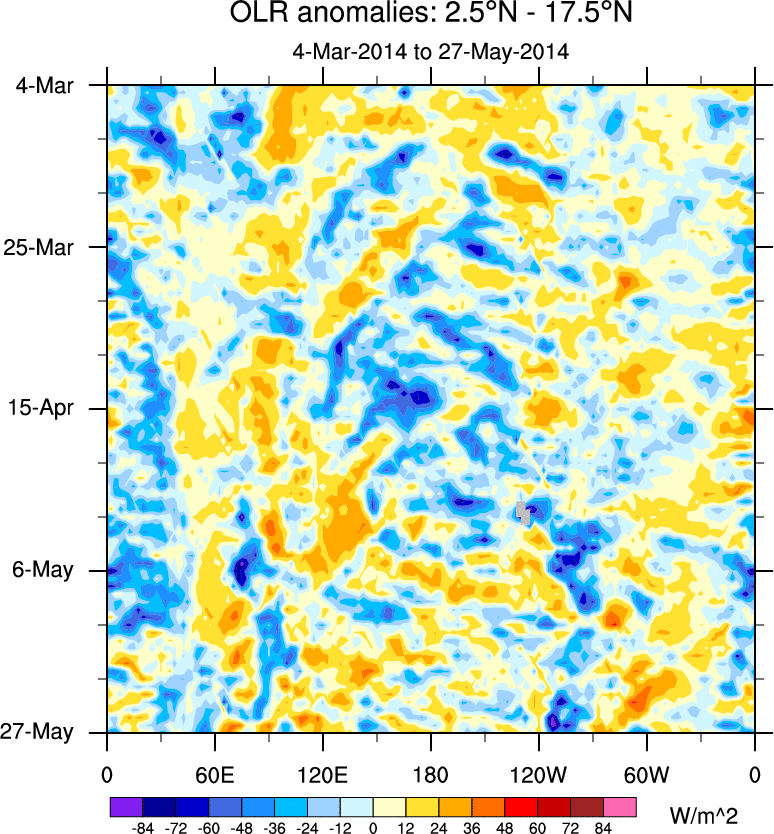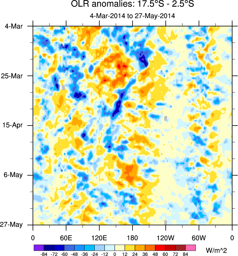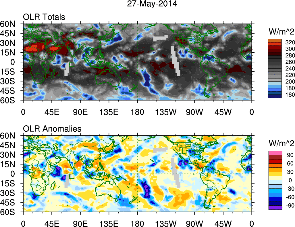 To identify tropical waves in near real-time, the OLR and UTWV data are filtered following Wheeler & Weickmann (2001 MWR). The daily anomalies are calculated using the first 3 harmonics of the seasonal cycle for 1979–2009. Missing values are then filled using linear interpolation in space and time. The most recent 365 days of anomalies are padded with 659 days of zeroes, and the result is filtered for each wave type.