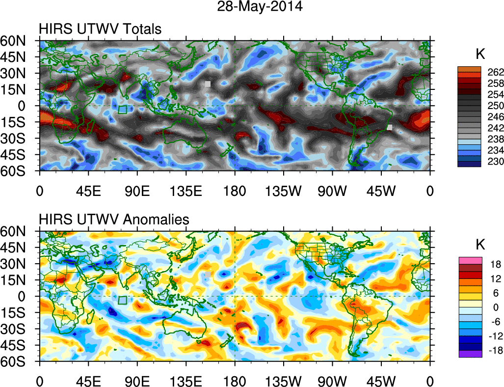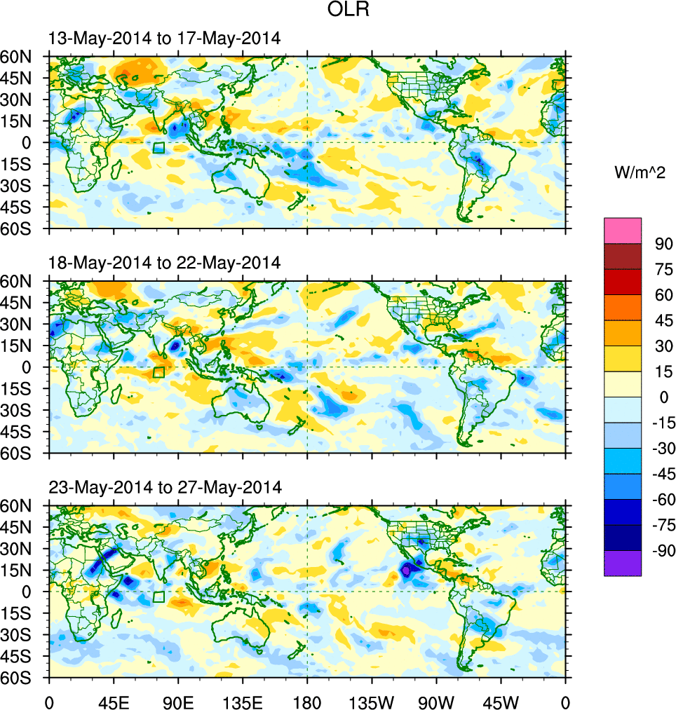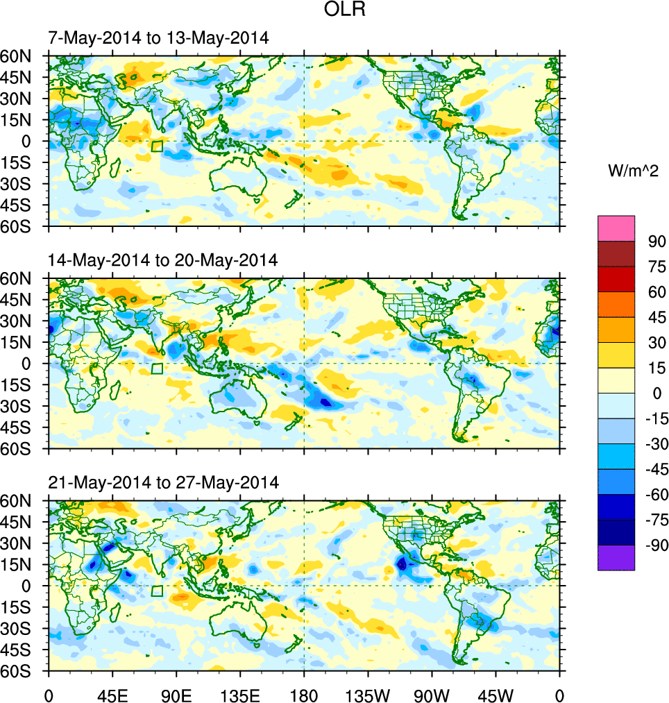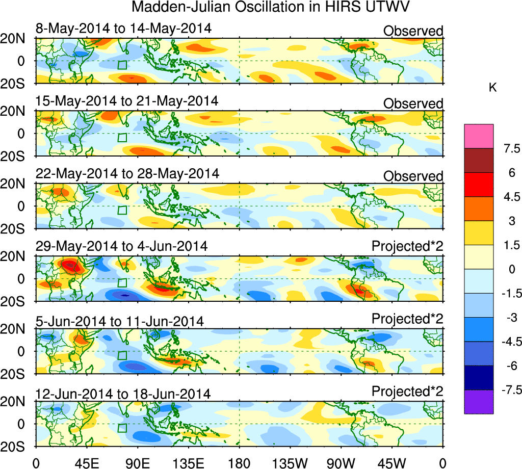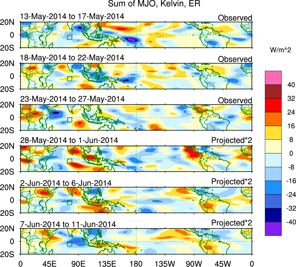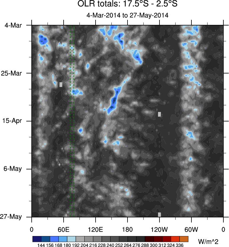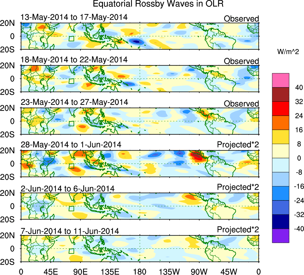 To identify tropical waves in near real-time, the OLR and UTWV data are filtered following Wheeler & Weickmann (2001 MWR). The daily anomalies are calculated using the first 3 harmonics of the seasonal cycle for 1979–2009. Missing values are then filled using linear interpolation in space and time. The most recent 365 days of anomalies are padded with 659 days of zeroes, and the result is filtered for each wave type.