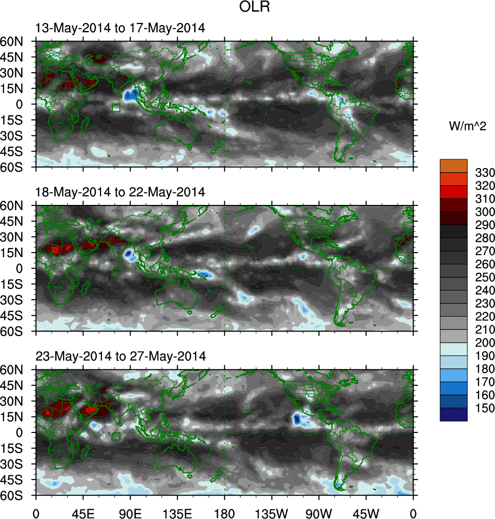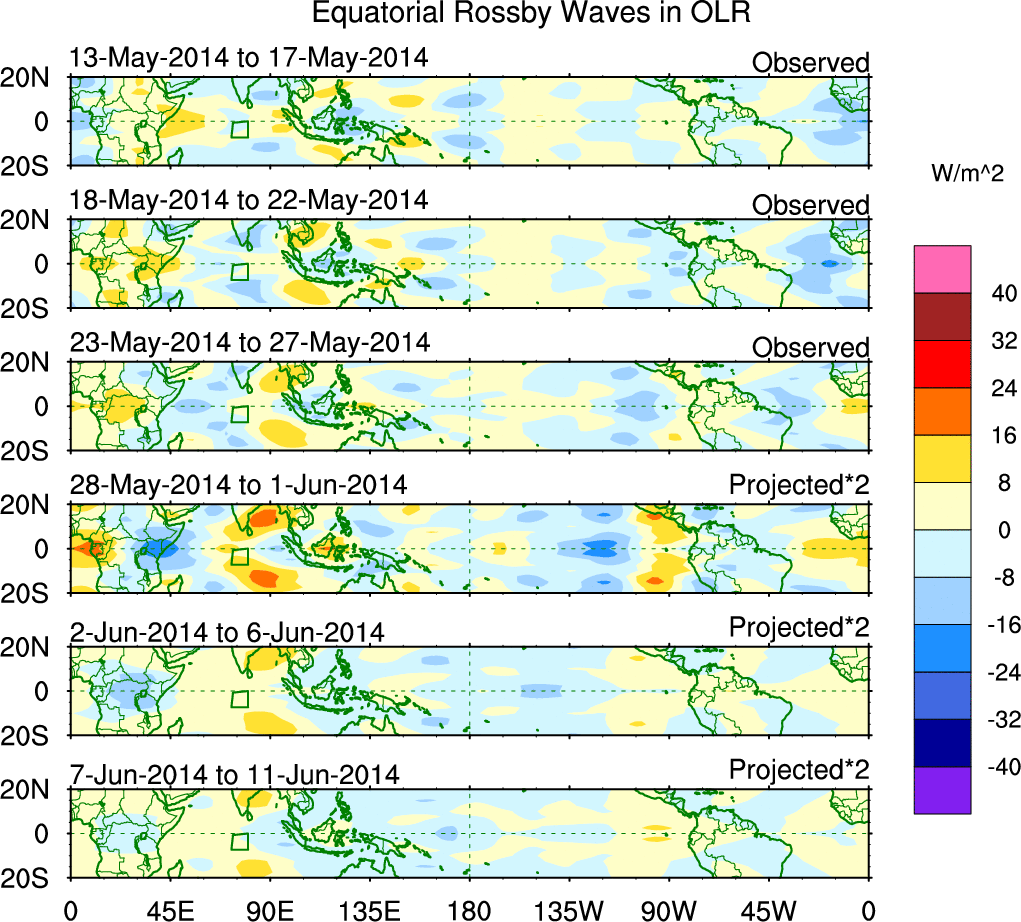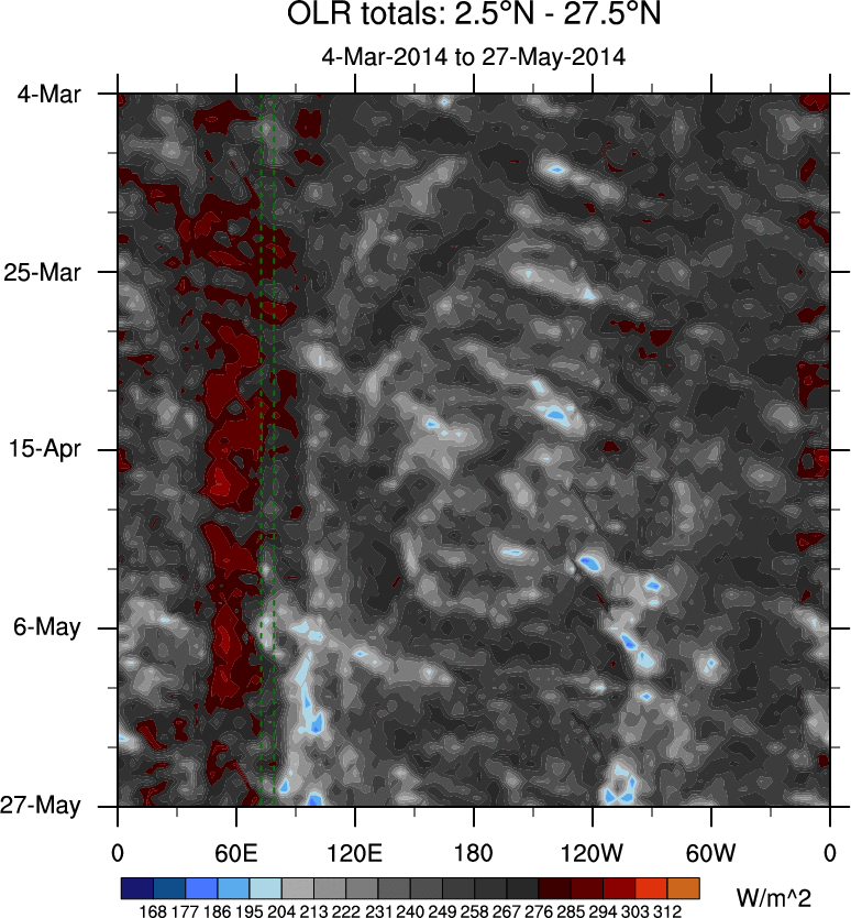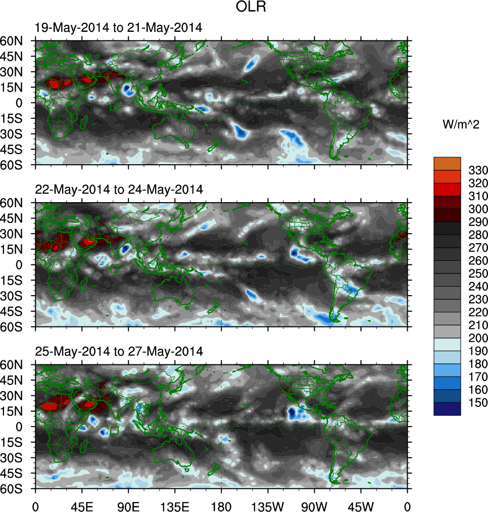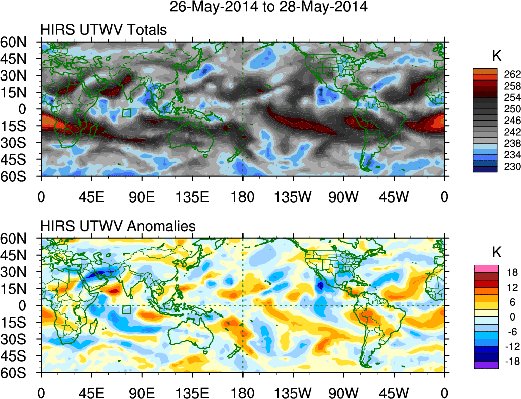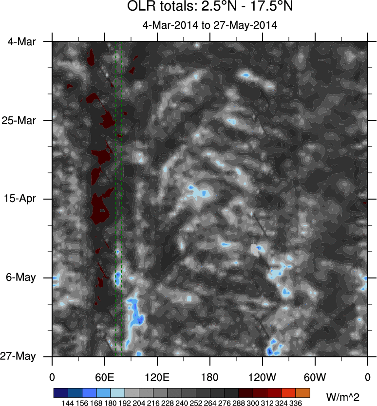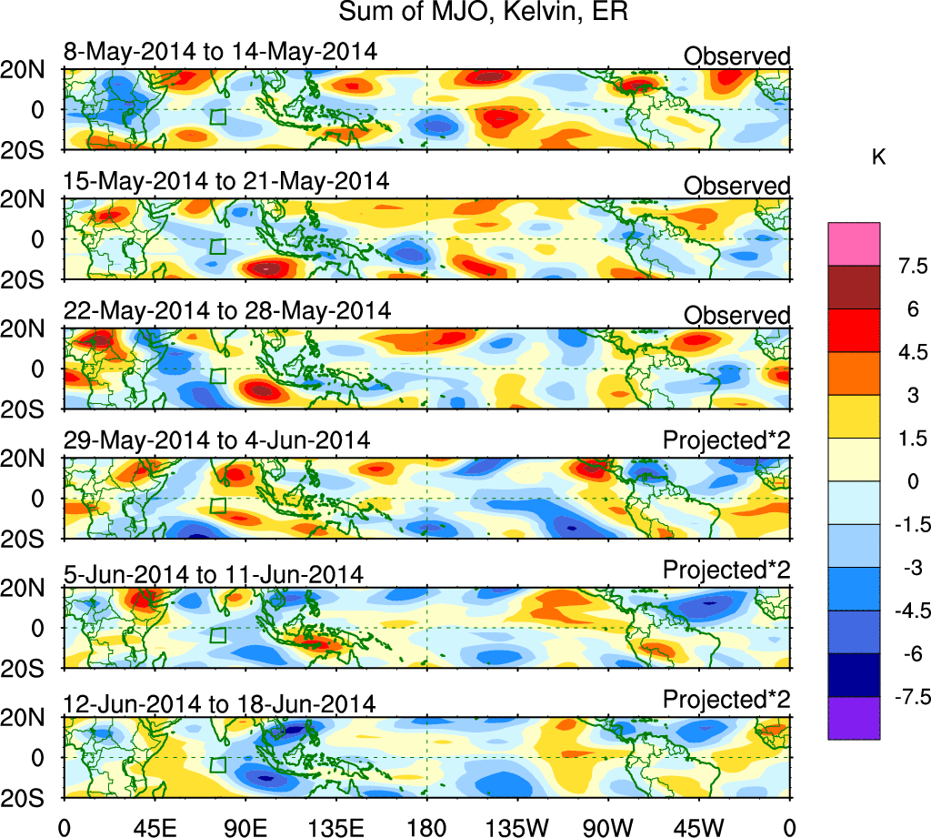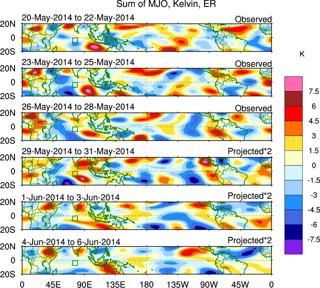 To identify tropical waves in near real-time, the OLR and UTWV data are filtered following Wheeler & Weickmann (2001 MWR). The daily anomalies are calculated using the first 3 harmonics of the seasonal cycle for 1979–2009. Missing values are then filled using linear interpolation in space and time. The most recent 365 days of anomalies are padded with 659 days of zeroes, and the result is filtered for each wave type.