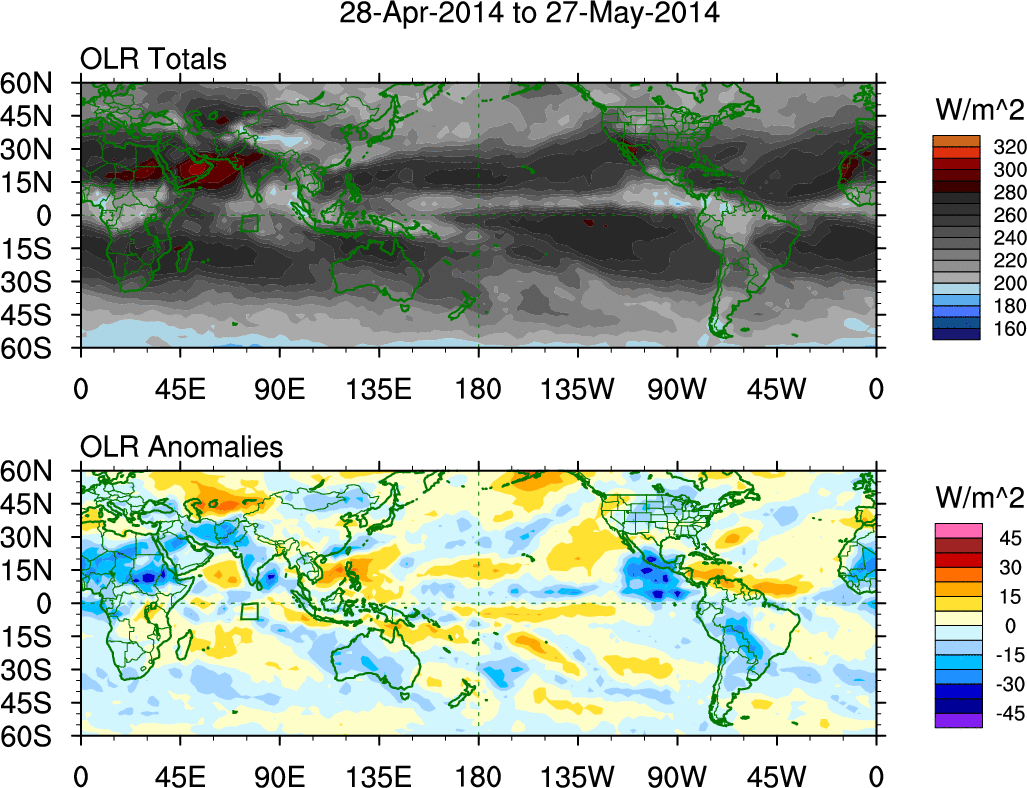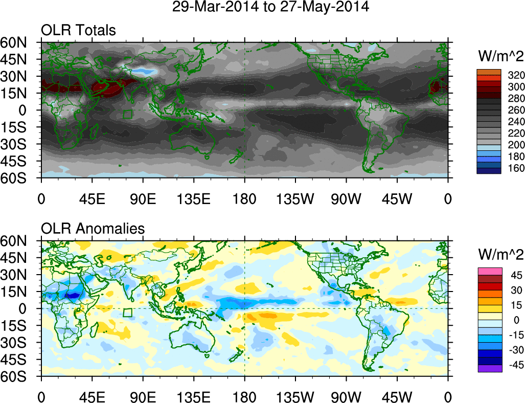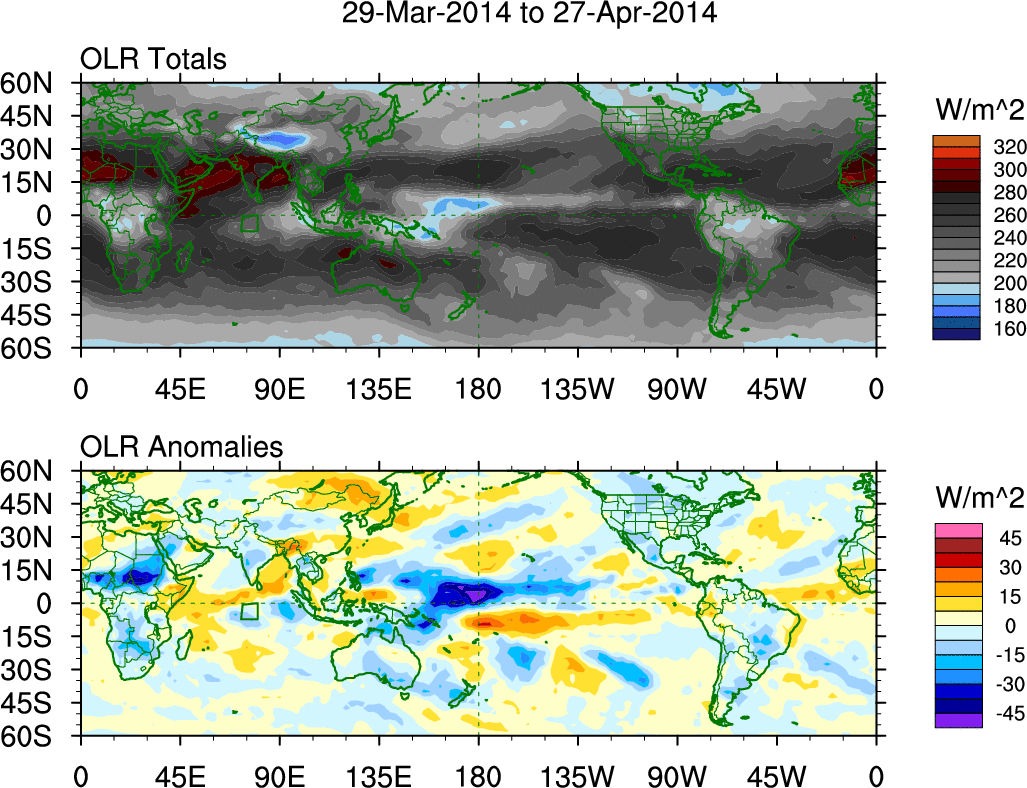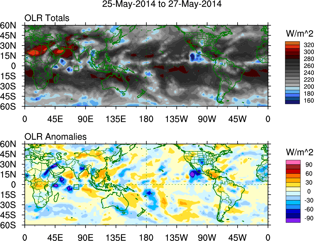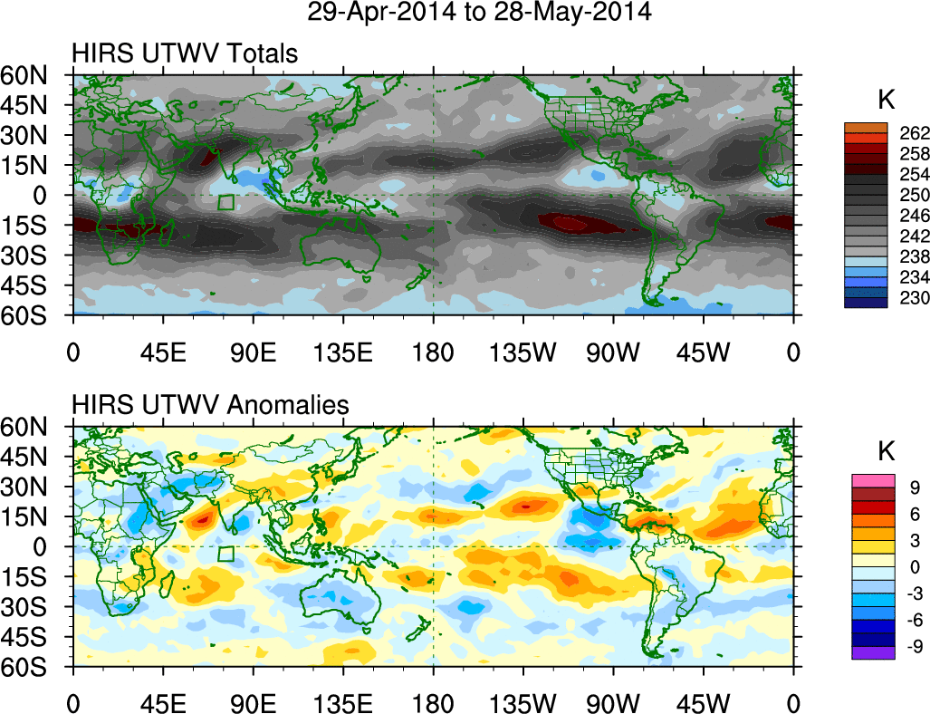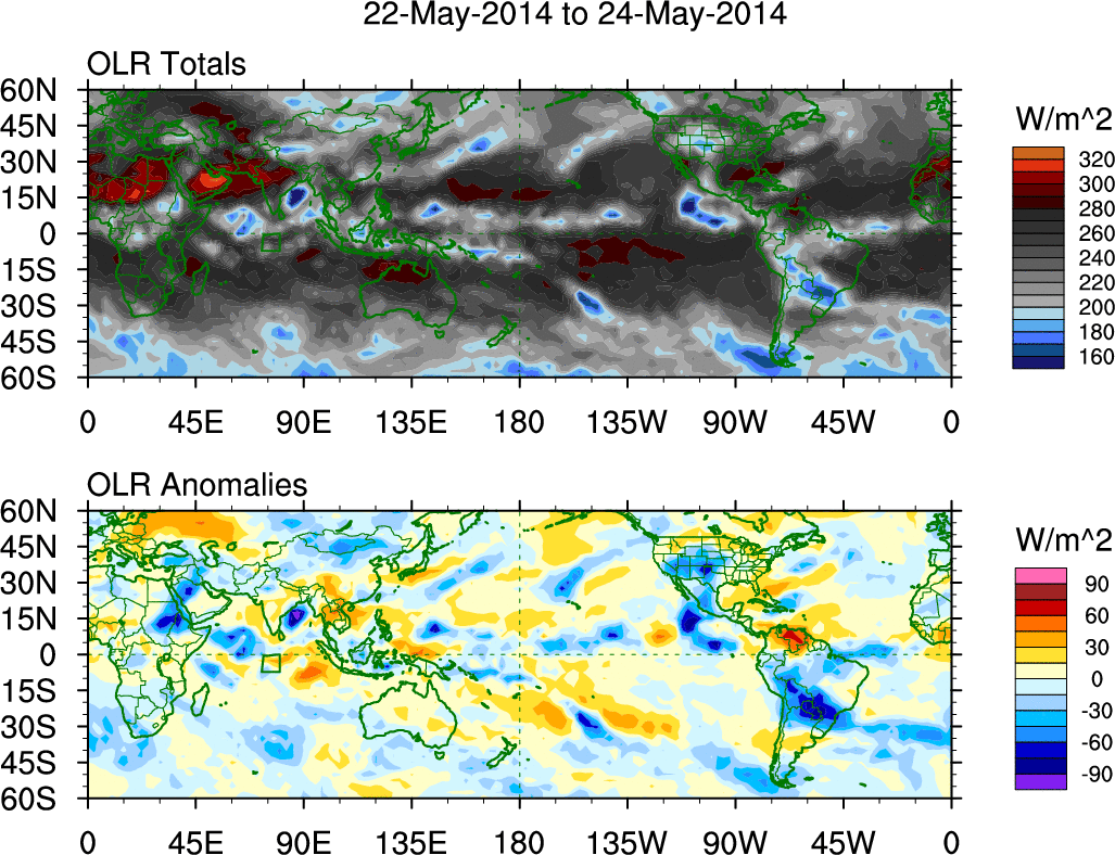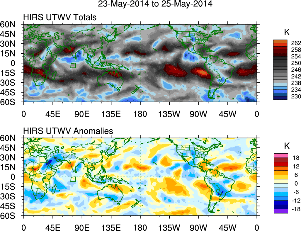 To identify tropical waves in near real-time, the OLR and UTWV data are filtered following Wheeler & Weickmann (2001 MWR). The daily anomalies are calculated using the first 3 harmonics of the seasonal cycle for 1979–2009. Missing values are then filled using linear interpolation in space and time. The most recent 365 days of anomalies are padded with 659 days of zeroes, and the result is filtered for each wave type.