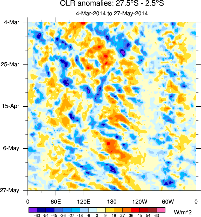 The figure above shows the wavenumber–frequency spectrum for OLR, divided by an estimate of the red background following Wheeler & Kiladis (1999, JAS). The panel on the left shows signals that are anti-symmetric about the equator, while the panel on the right shows those that are symmetric. Spectral peaks tend to lie along the dispersion curves for shallow water equatorial waves (black lines).