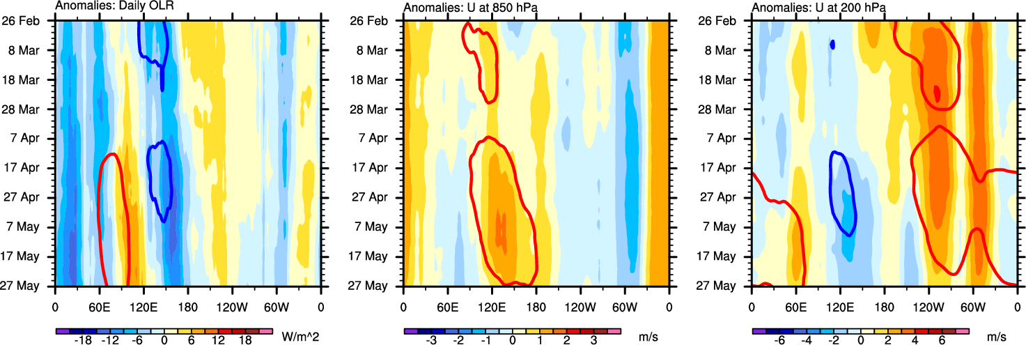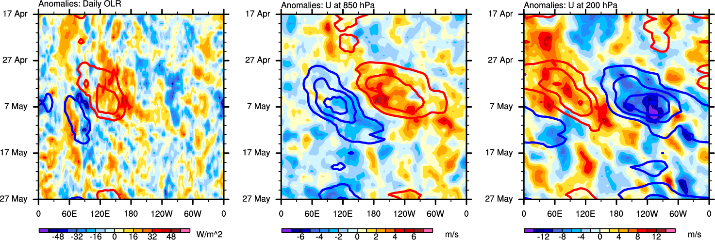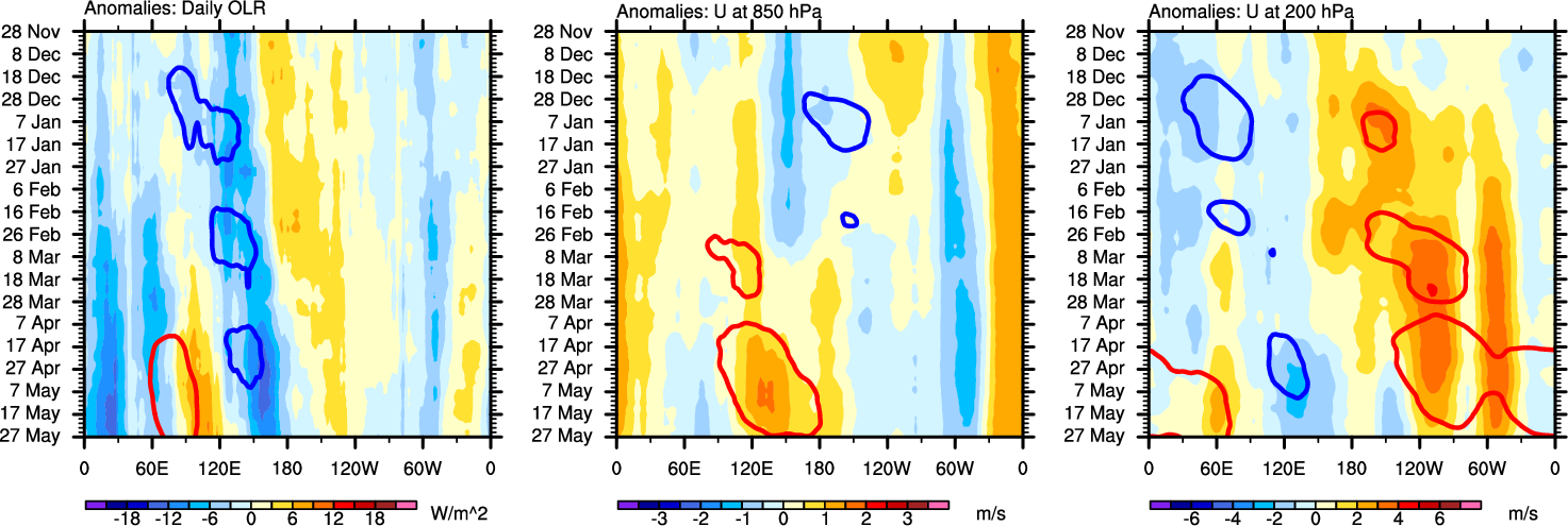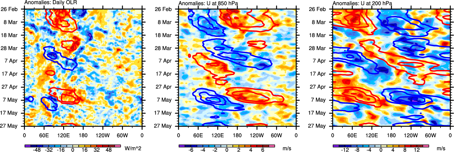 The Hovmollers show longitude-time plots for OLR, U-850, and U-200. The shading indicates the observed anomalies, while the contours are the projection of those anomalies onto the RMM EOFs.