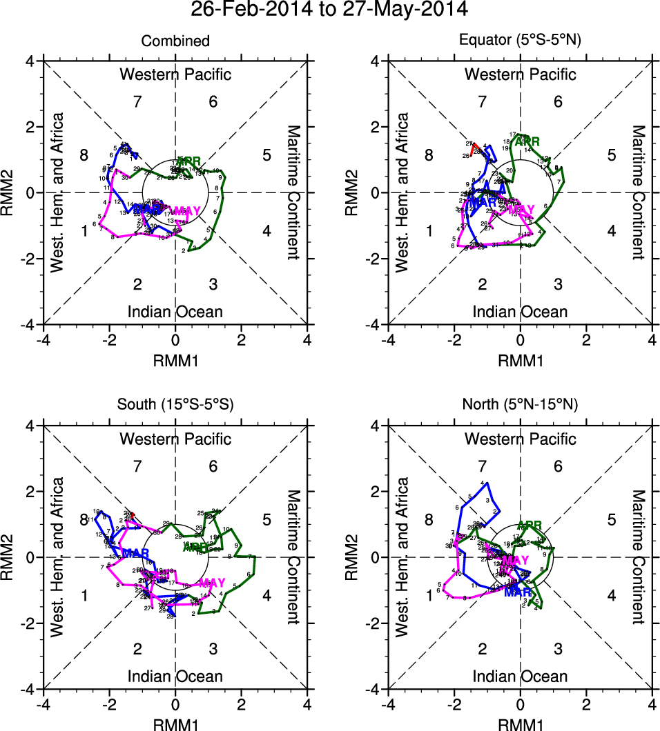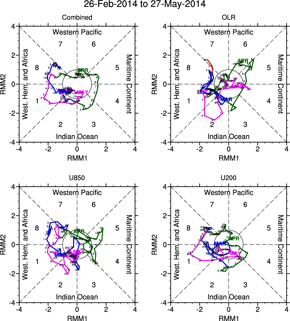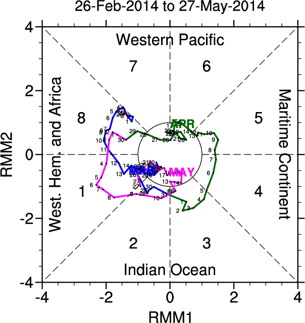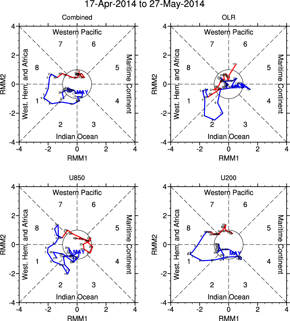 Wheeler and Hendon (2004) constructed the RMM index for monitoring the MJO. This index consists of the first two principal components (PCs) of OLR, 850-hPa zonal wind, and 200-hPa zonal wind averaged 15S-15N.