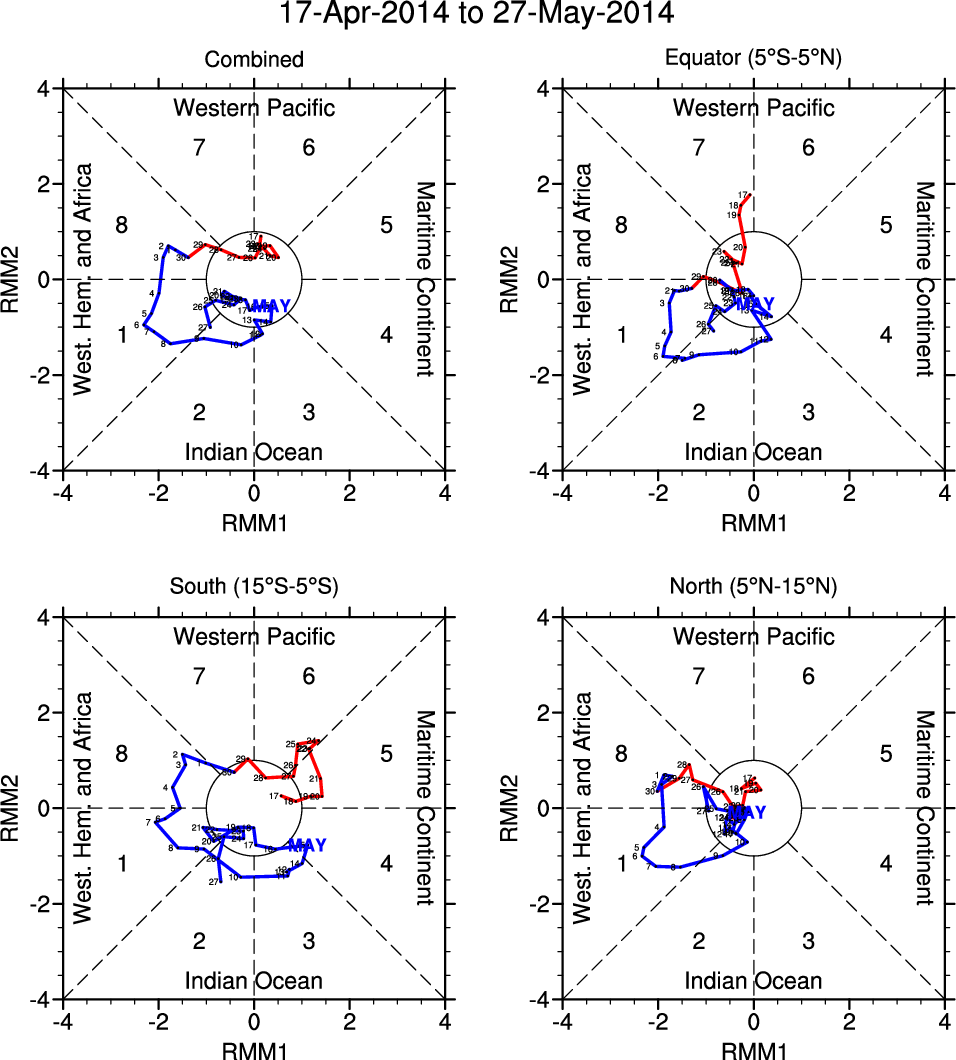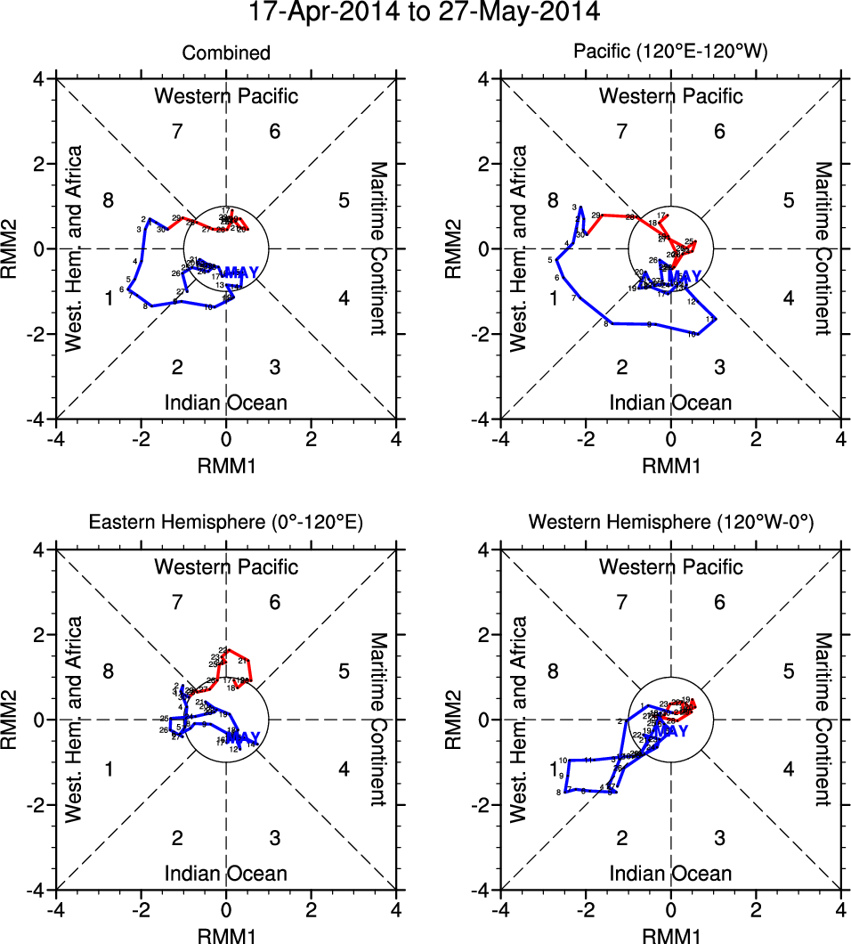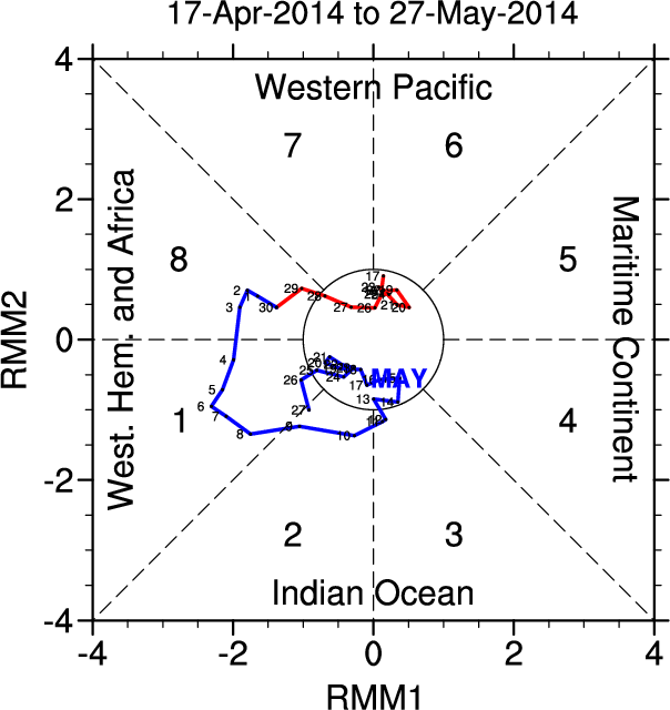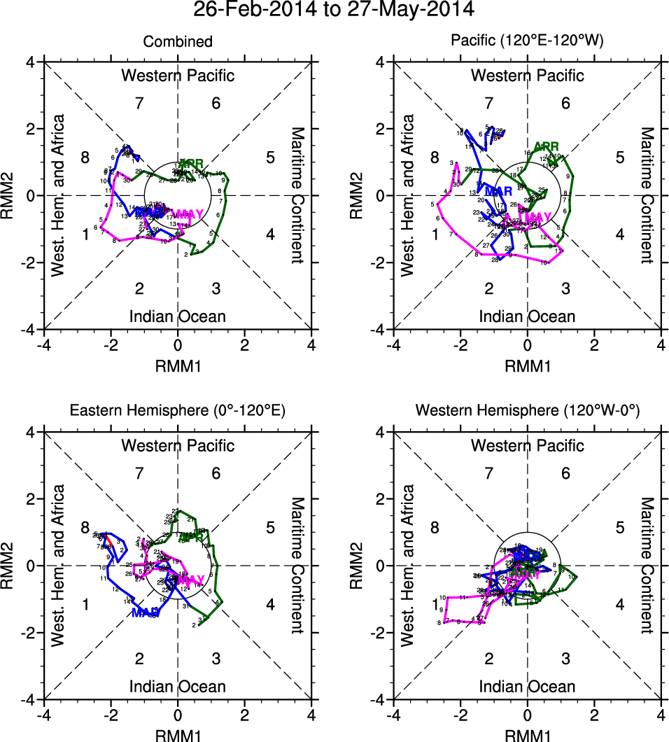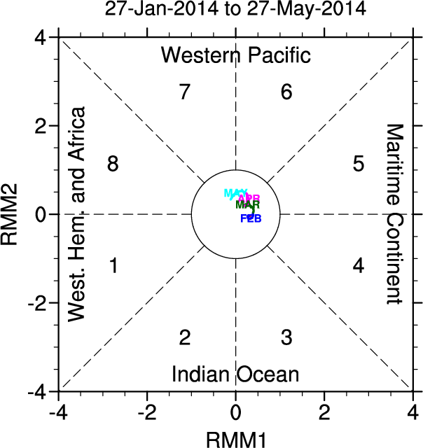 Wheeler and Hendon (2004) constructed the RMM index for monitoring the MJO. This index consists of the first two principal components (PCs) of OLR, 850-hPa zonal wind, and 200-hPa zonal wind averaged 15S-15N.