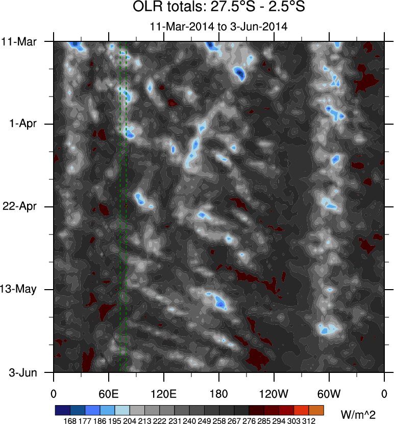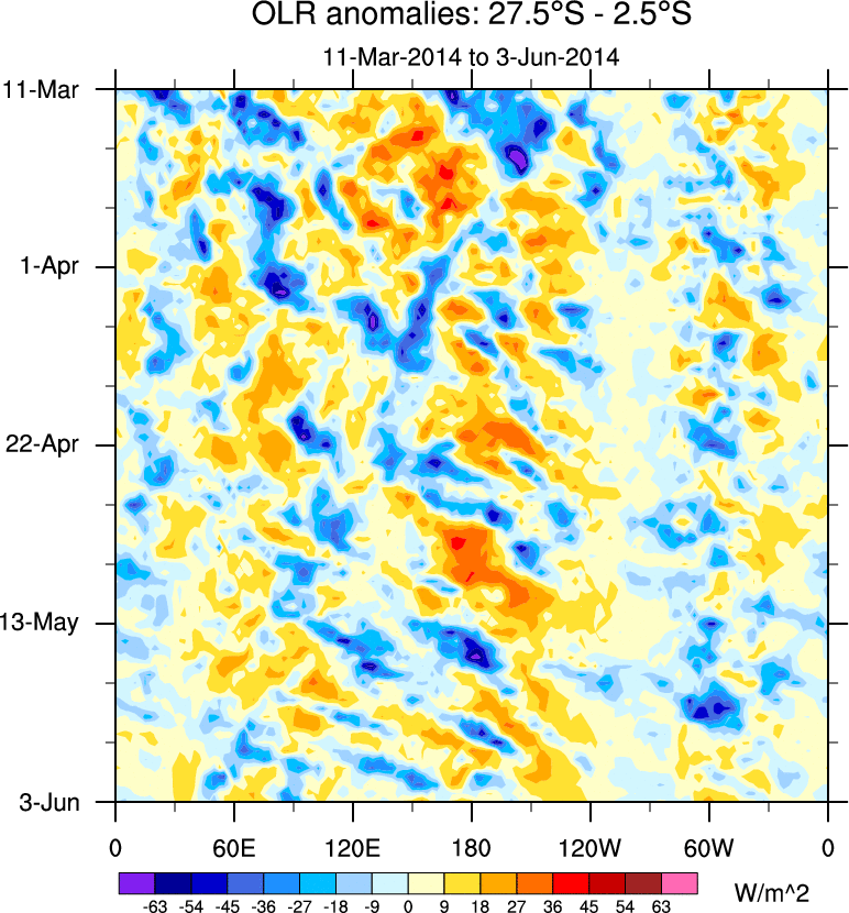 The figure above shows the wavenumber–frequency spectrum for OLR, divided by an estimate of the red background following Wheeler & Kiladis (1999, JAS). The panel on the left shows signals that are anti-symmetric about the equator, while the panel on the right shows those that are symmetric. Spectral peaks tend to lie along the dispersion curves for shallow water equatorial waves (black lines).