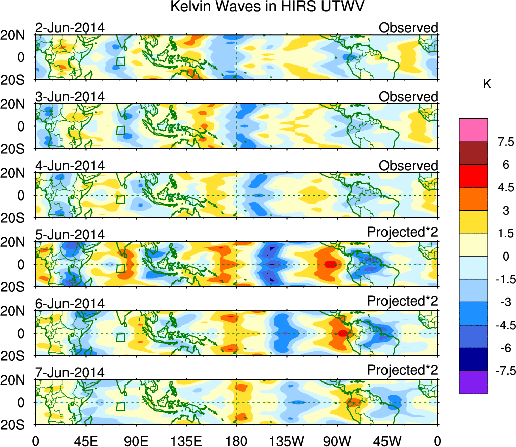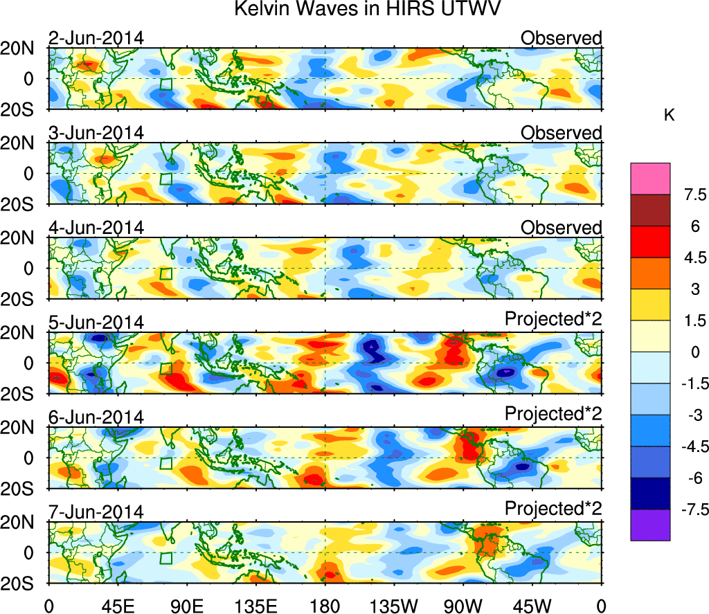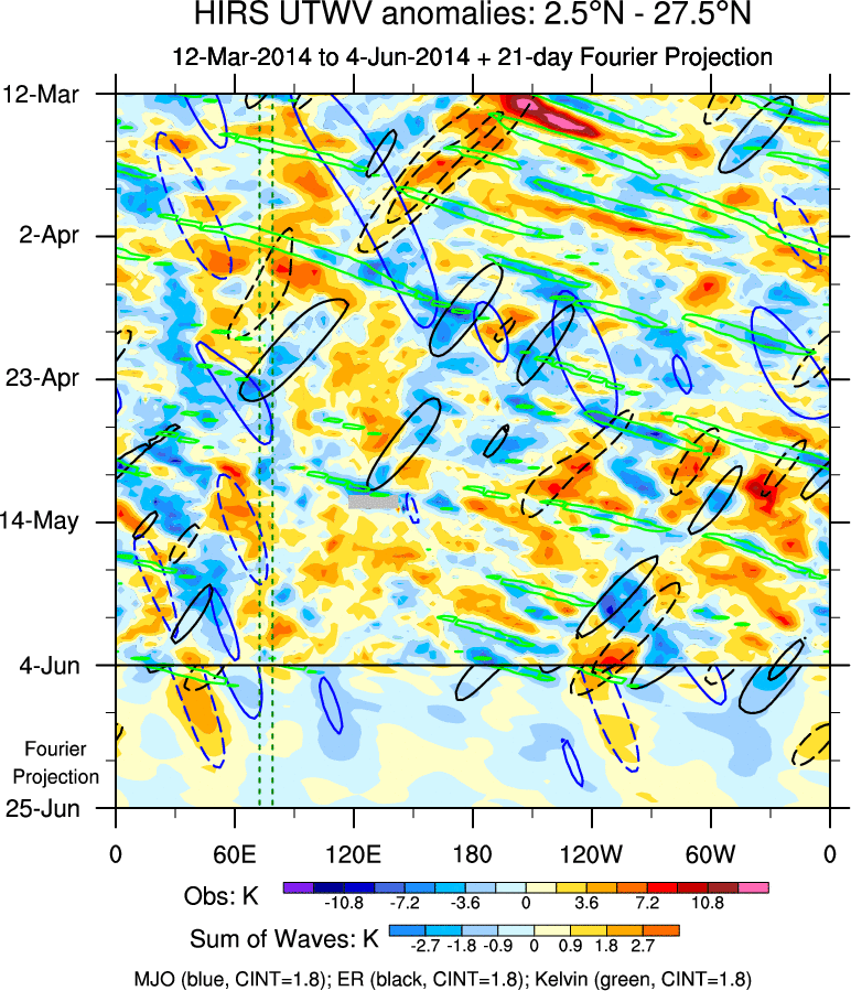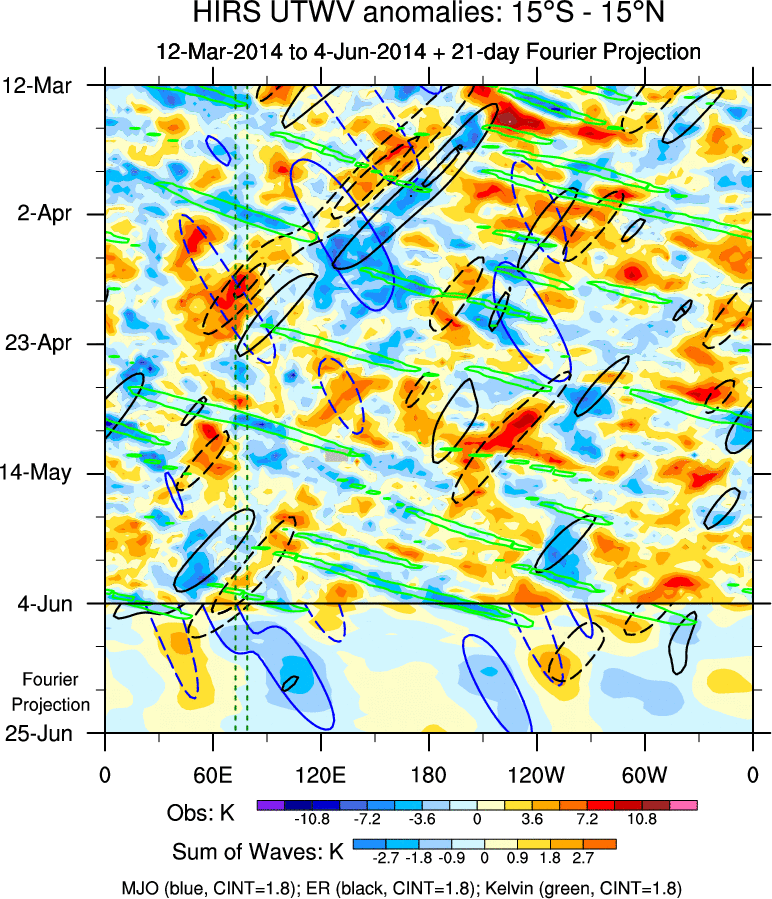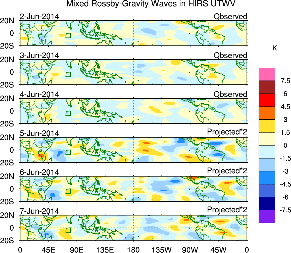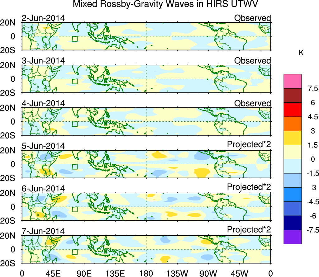 To identify tropical waves in near real-time, the OLR and UTWV data are filtered following Wheeler & Weickmann (2001 MWR). The daily anomalies are calculated using the first 3 harmonics of the seasonal cycle for 1979–2009. Missing values are then filled using linear interpolation in space and time. The most recent 365 days of anomalies are padded with 659 days of zeroes, and the result is filtered for each wave type.