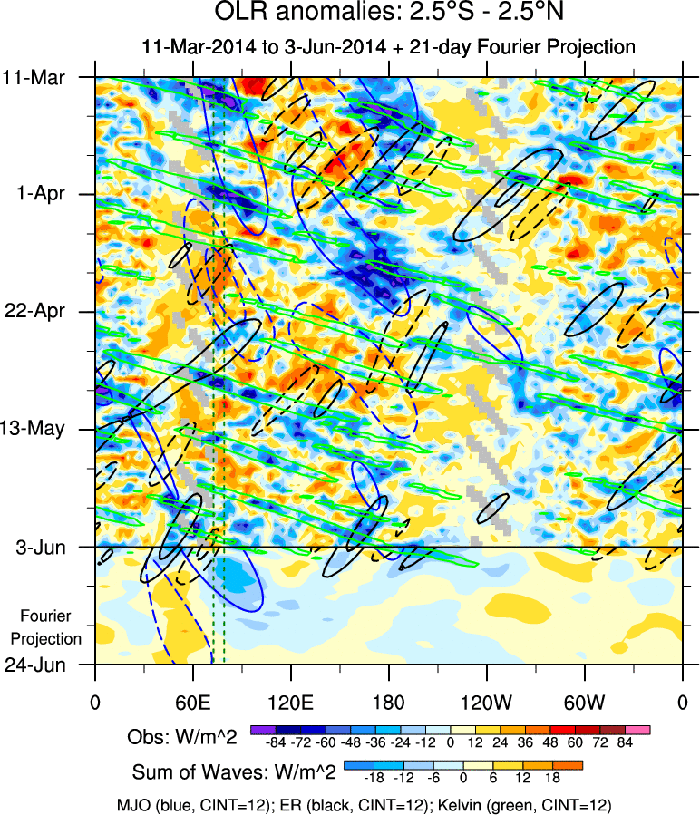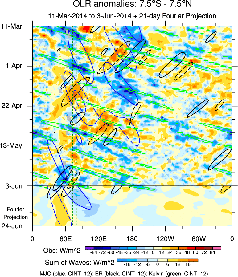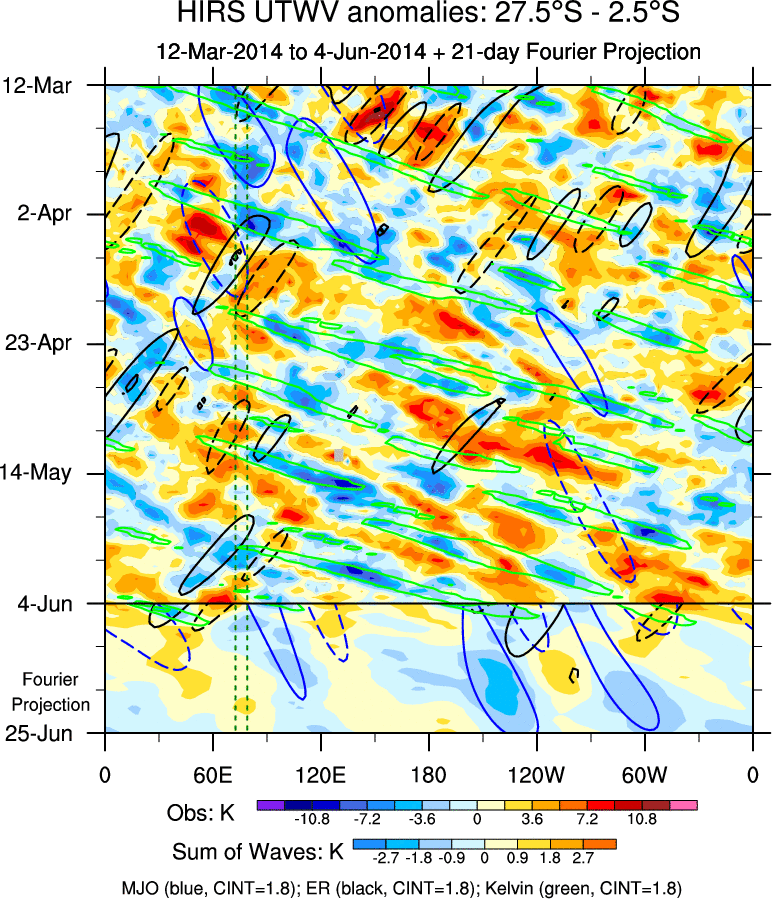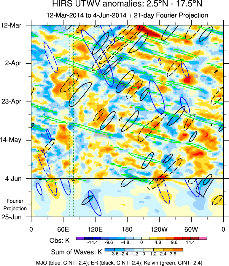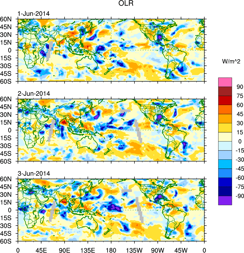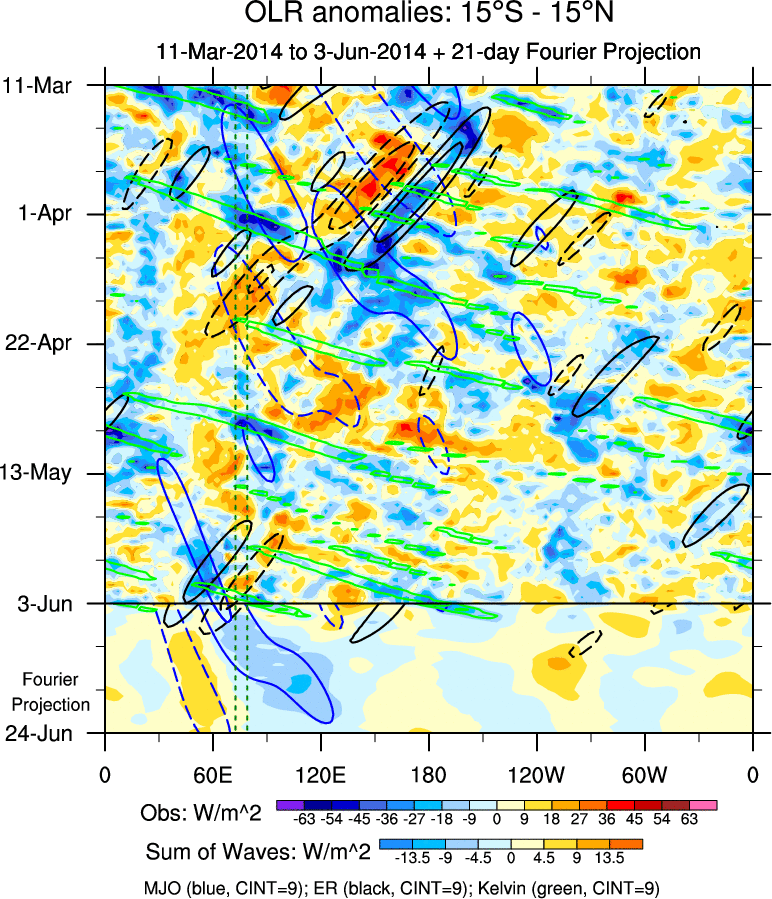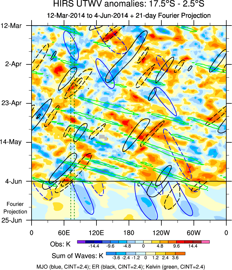 To identify tropical waves in near real-time, the OLR and UTWV data are filtered following Wheeler & Weickmann (2001 MWR). The daily anomalies are calculated using the first 3 harmonics of the seasonal cycle for 1979–2009. Missing values are then filled using linear interpolation in space and time. The most recent 365 days of anomalies are padded with 659 days of zeroes, and the result is filtered for each wave type.