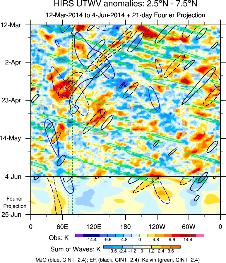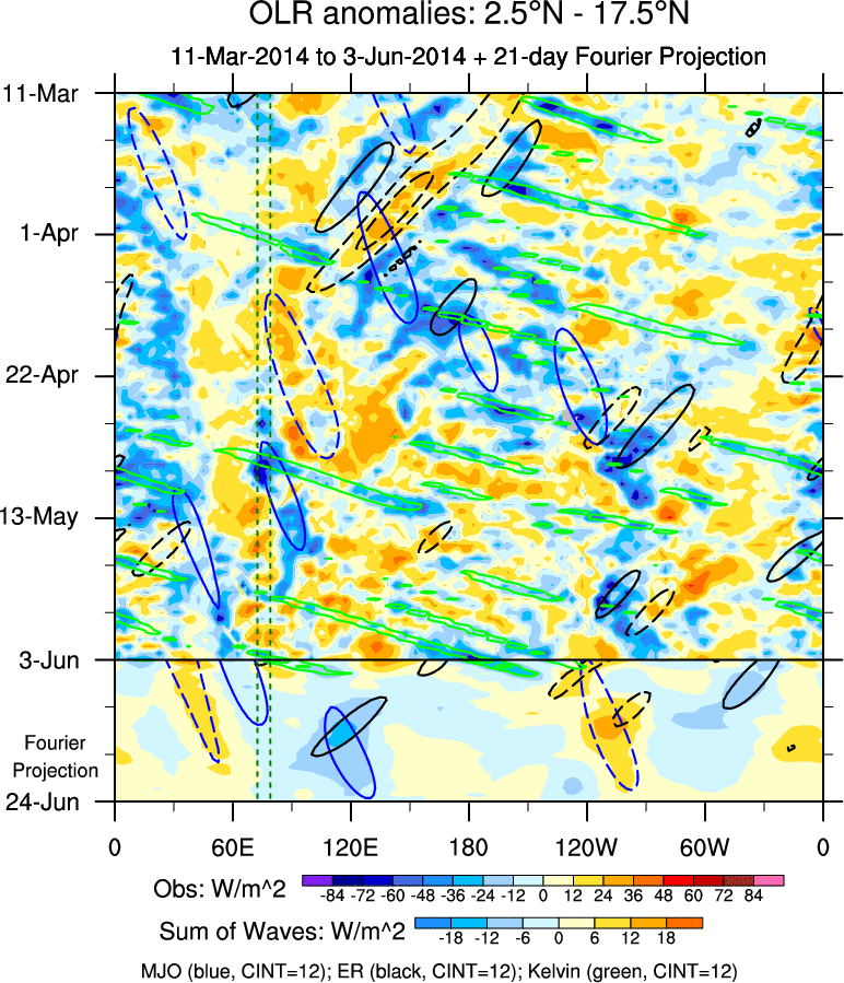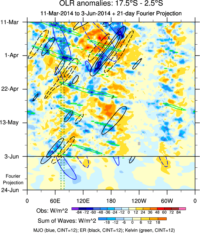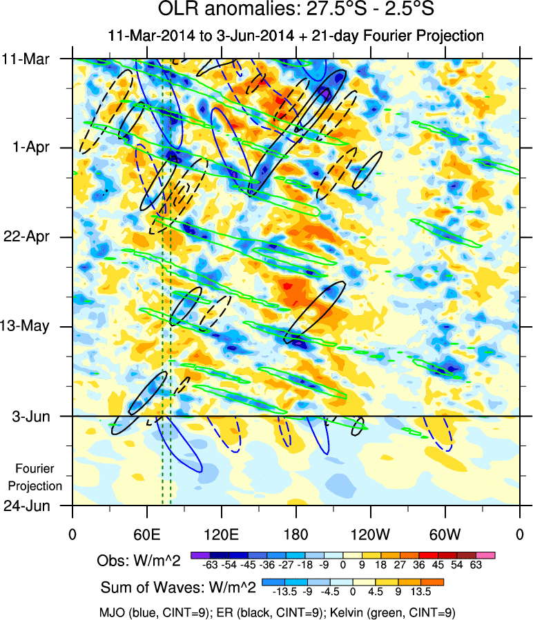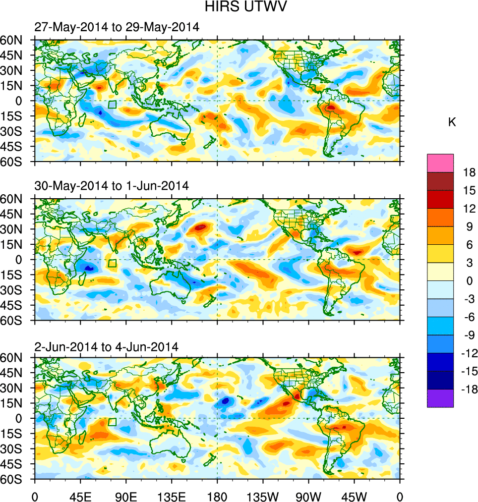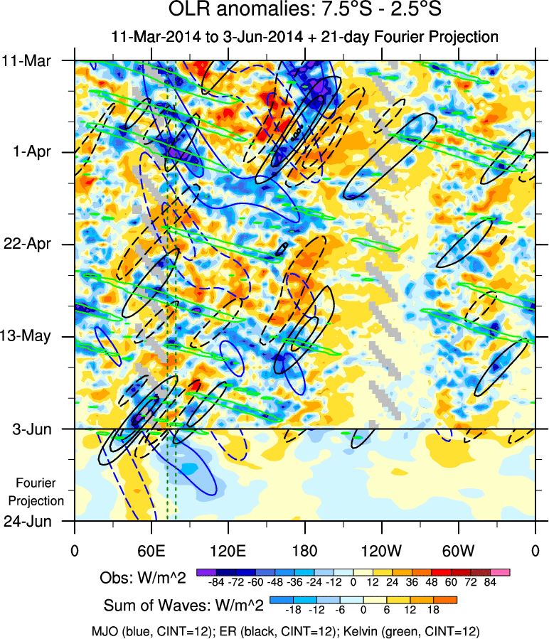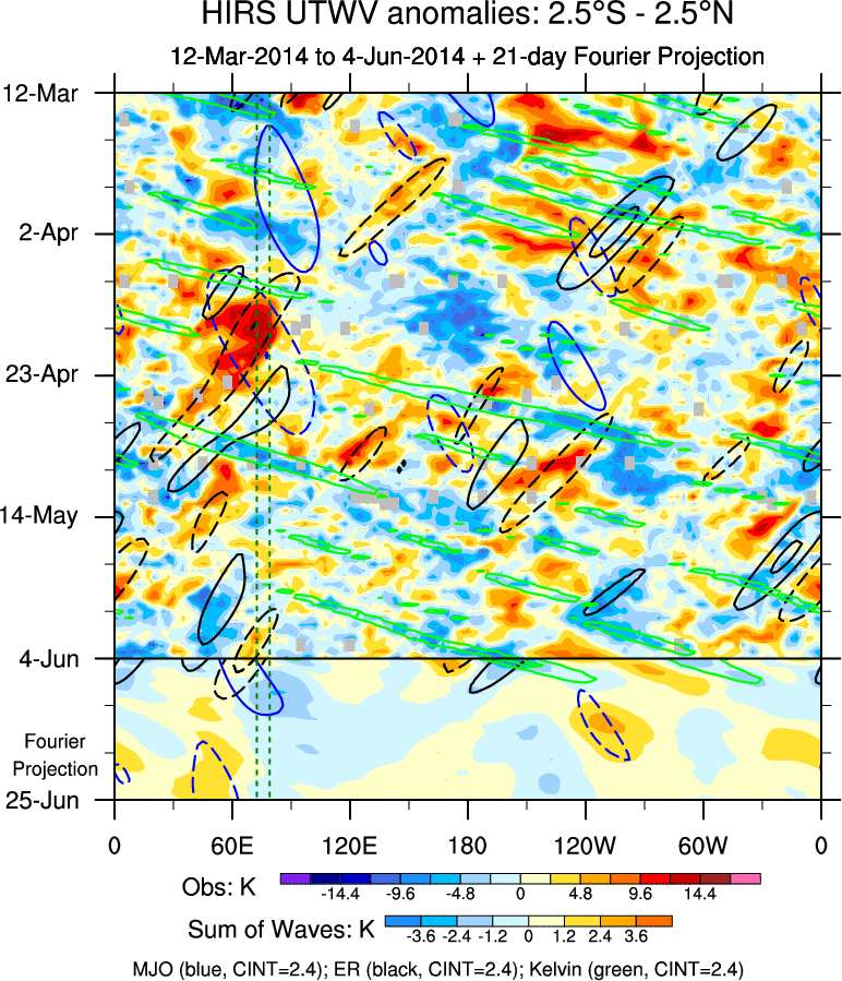 To identify tropical waves in near real-time, the OLR and UTWV data are filtered following Wheeler & Weickmann (2001 MWR). The daily anomalies are calculated using the first 3 harmonics of the seasonal cycle for 1979–2009. Missing values are then filled using linear interpolation in space and time. The most recent 365 days of anomalies are padded with 659 days of zeroes, and the result is filtered for each wave type.