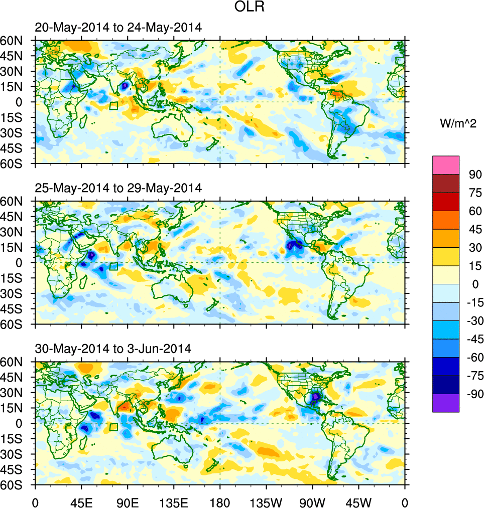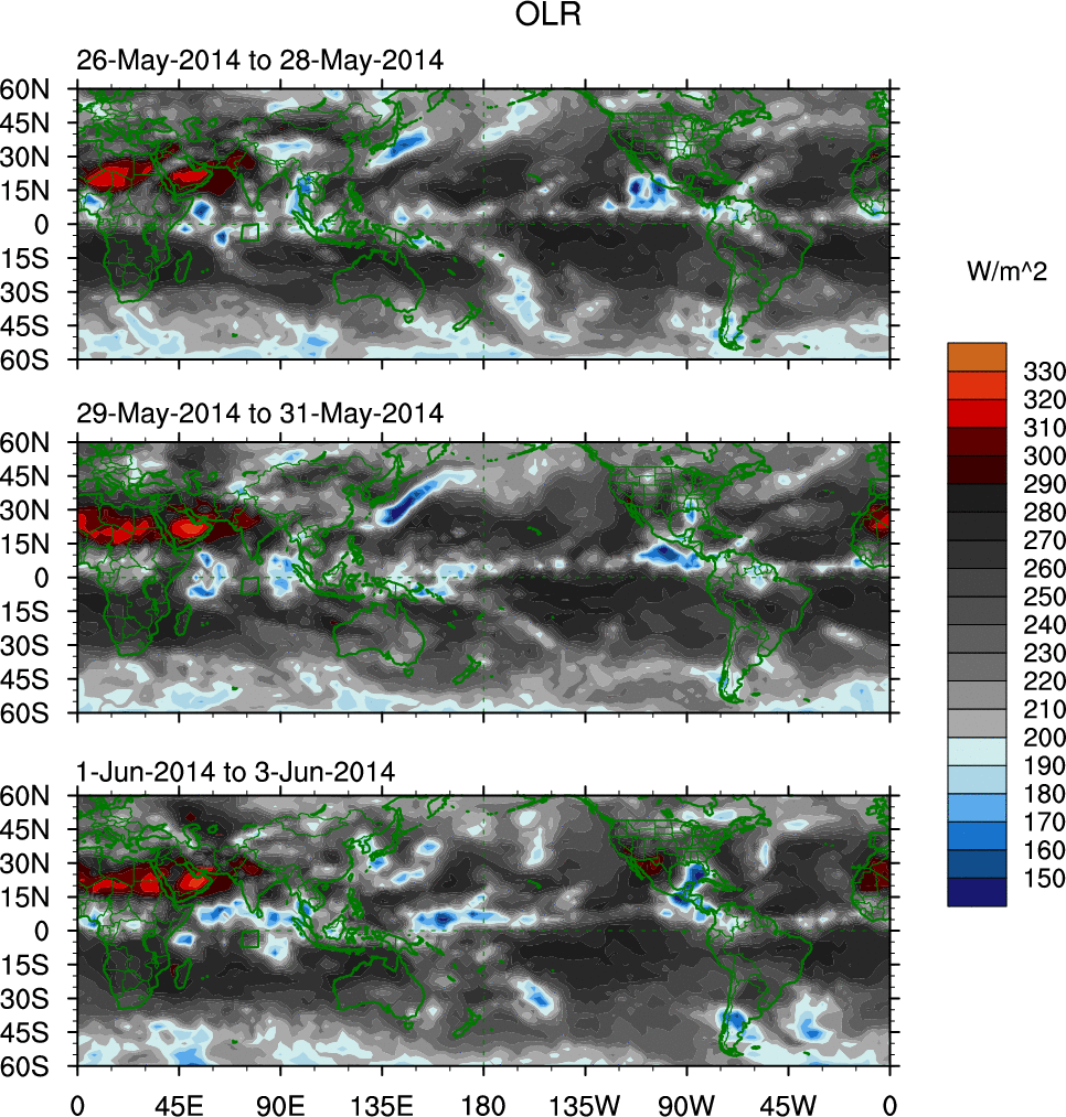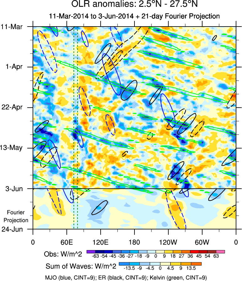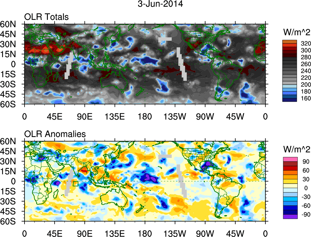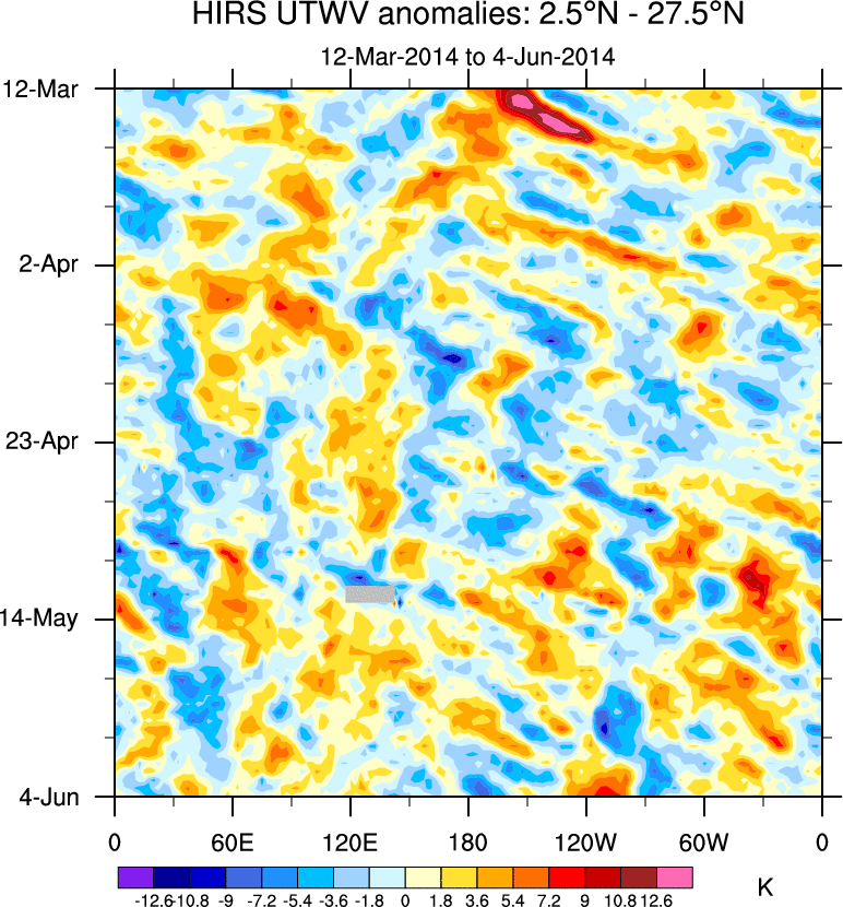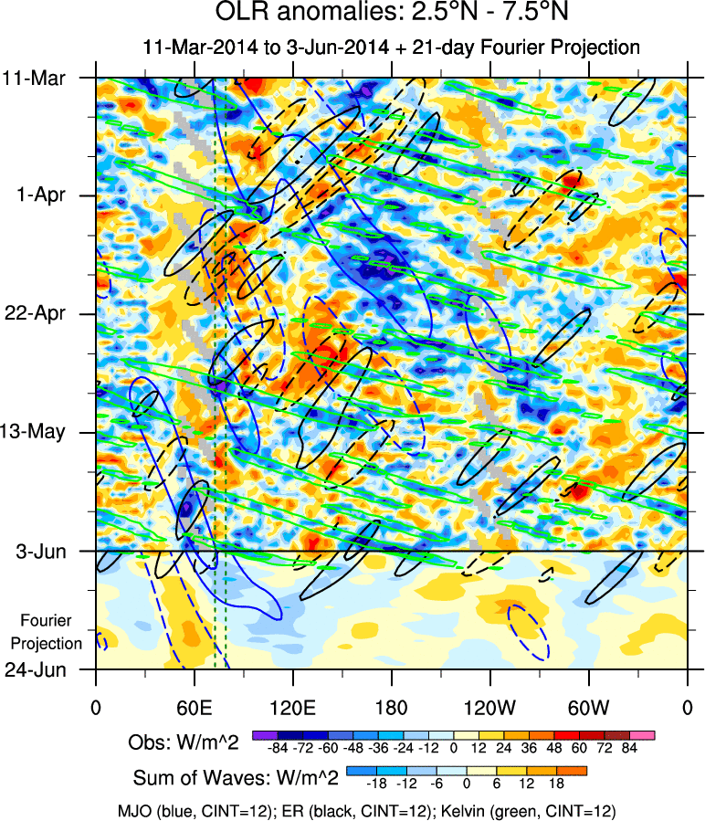 To identify tropical waves in near real-time, the OLR and UTWV data are filtered following Wheeler & Weickmann (2001 MWR). The daily anomalies are calculated using the first 3 harmonics of the seasonal cycle for 1979–2009. Missing values are then filled using linear interpolation in space and time. The most recent 365 days of anomalies are padded with 659 days of zeroes, and the result is filtered for each wave type.