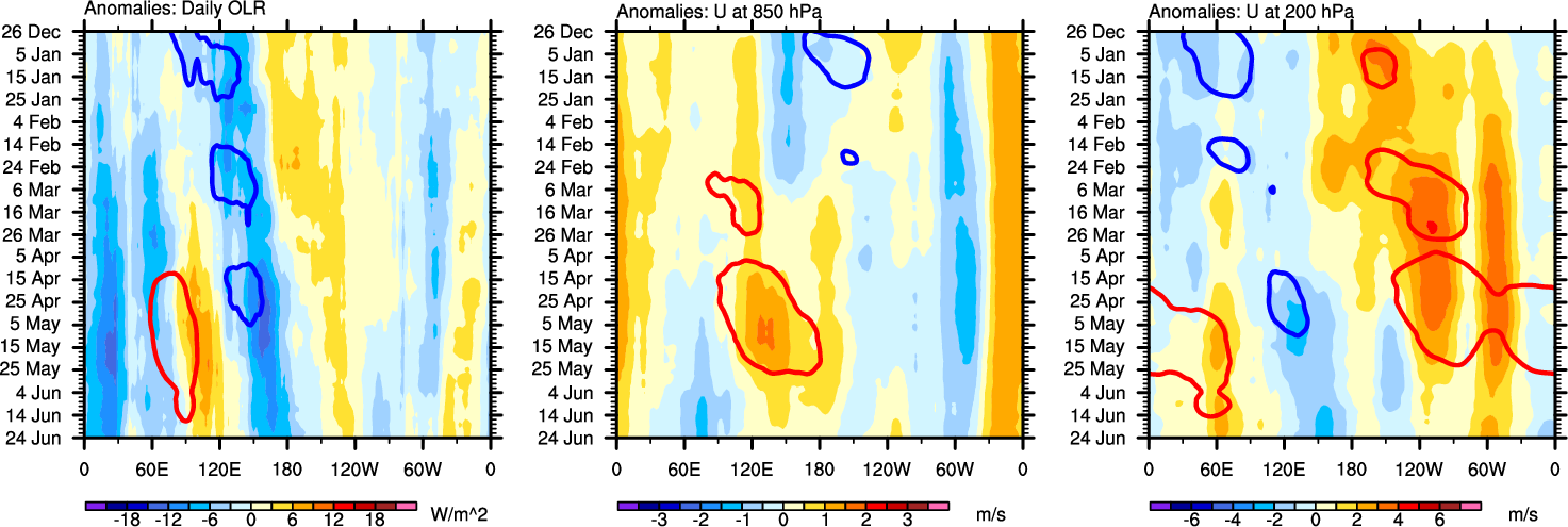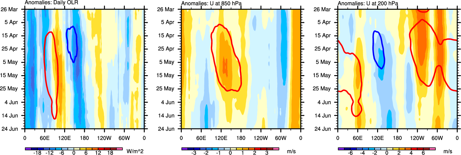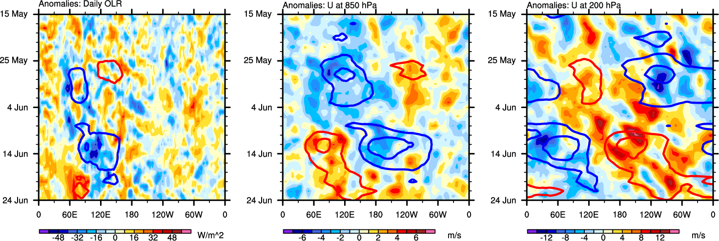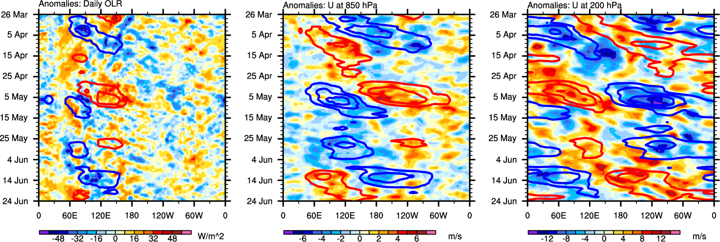 The Hovmöllers show longitude-time plots for OLR, U-850, and U-200. The shading indicates the observed anomalies, while the contours are the projection of those anomalies onto the RMM EOFs.