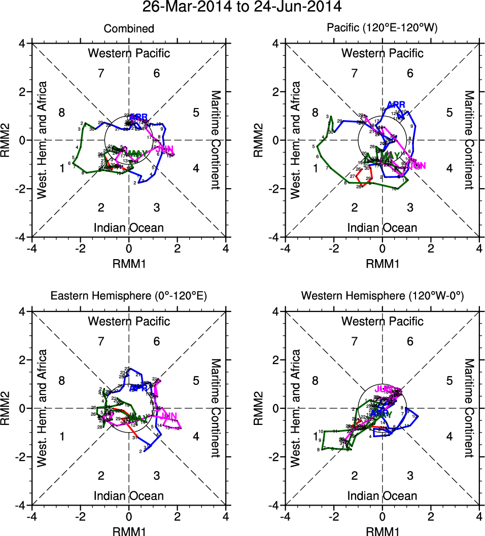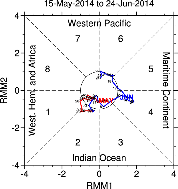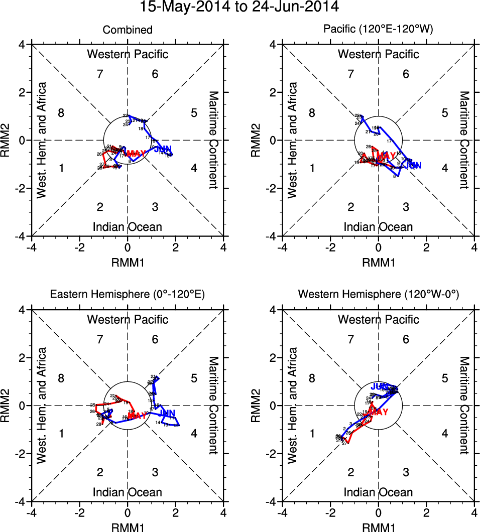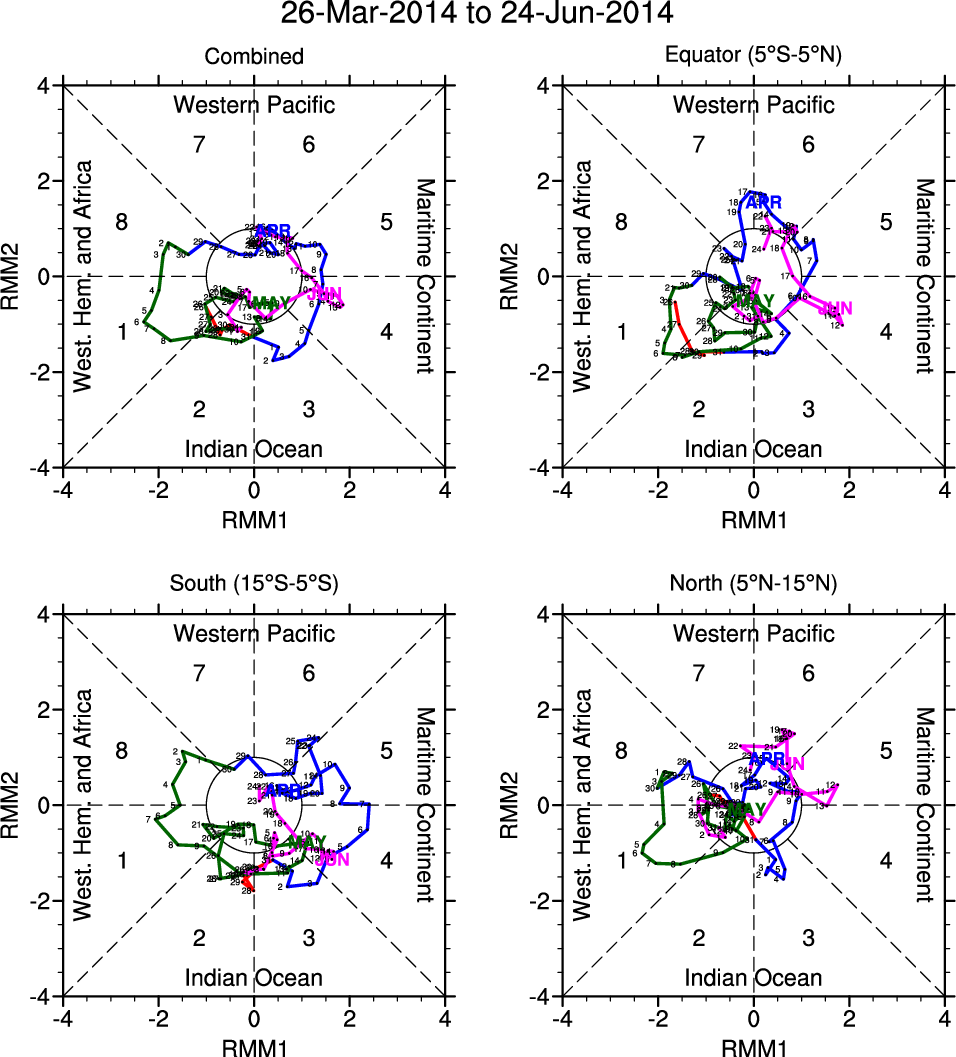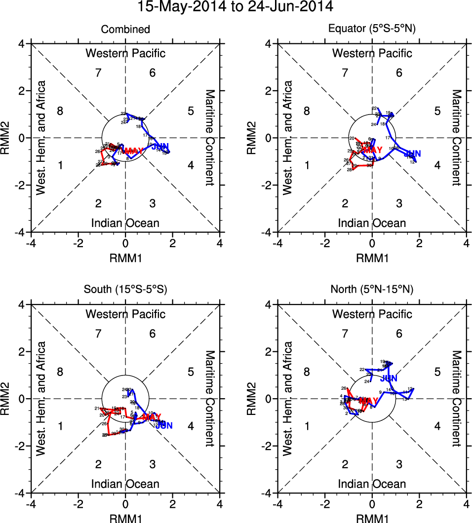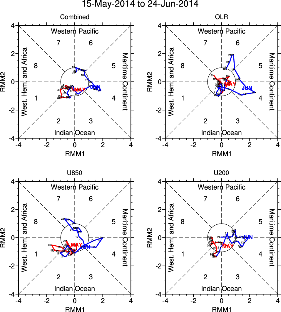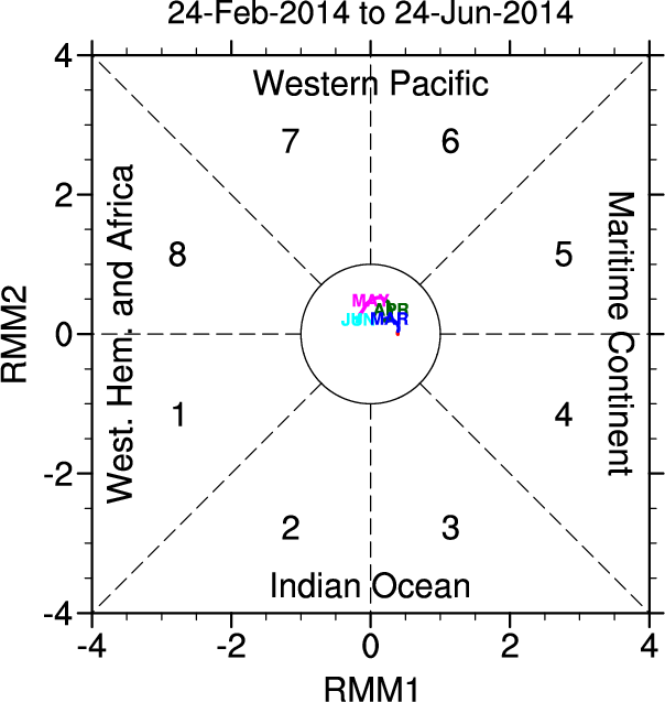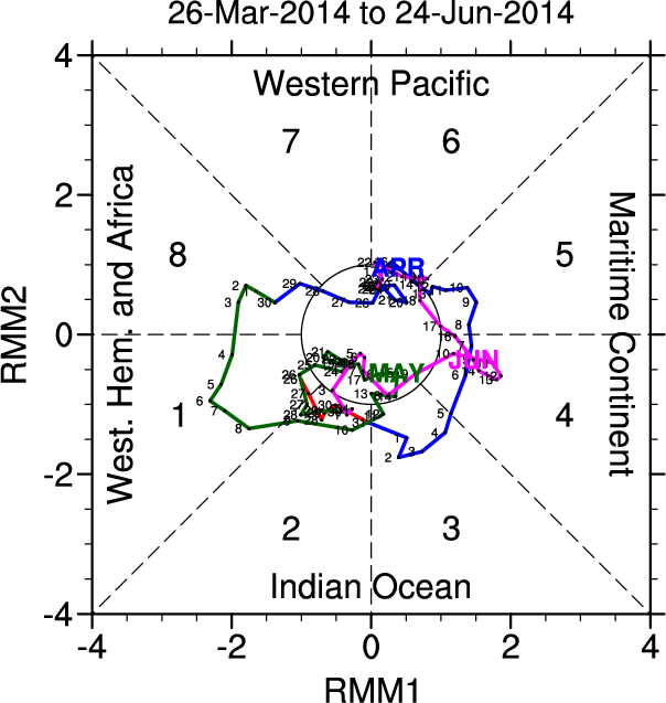 Wheeler and Hendon (2004) constructed the RMM index for monitoring the MJO. This index consists of the first two principal components (PCs) of OLR, 850-hPa zonal wind, and 200-hPa zonal wind averaged 15S-15N.