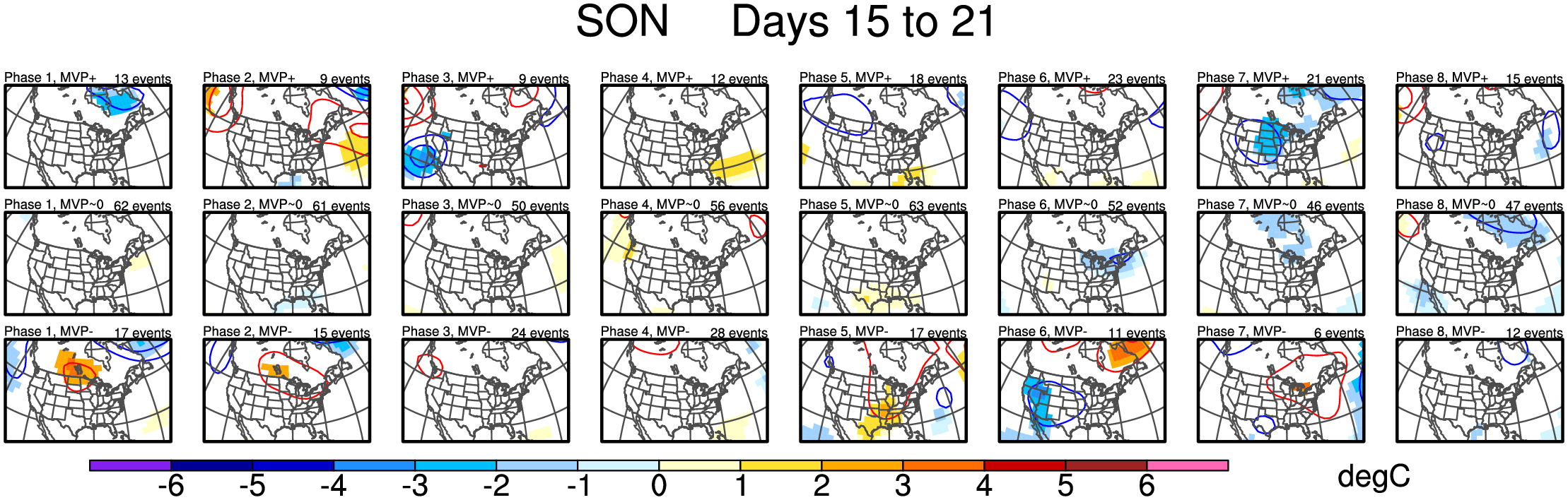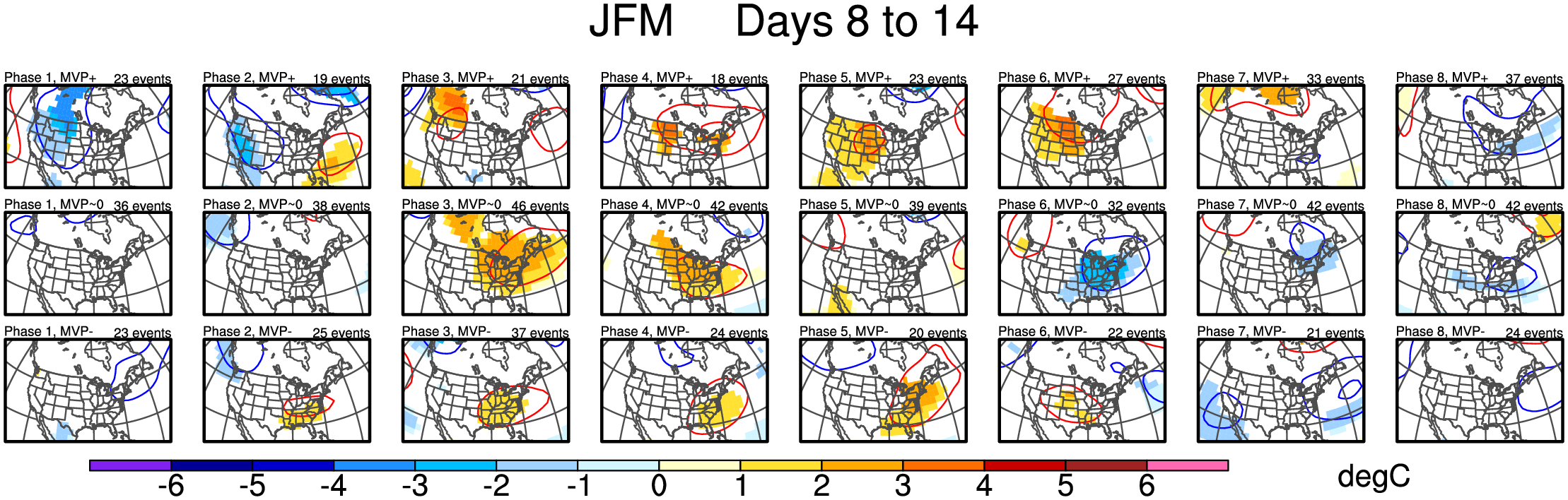 Maps of 500-hPa geopotential height anomalies (contoured every 30 m) and significant 850-hPa temperature anomalies, as shown in Schreck et al. (2013).