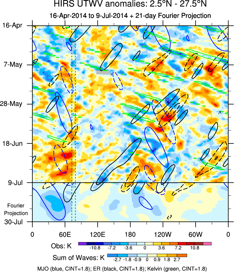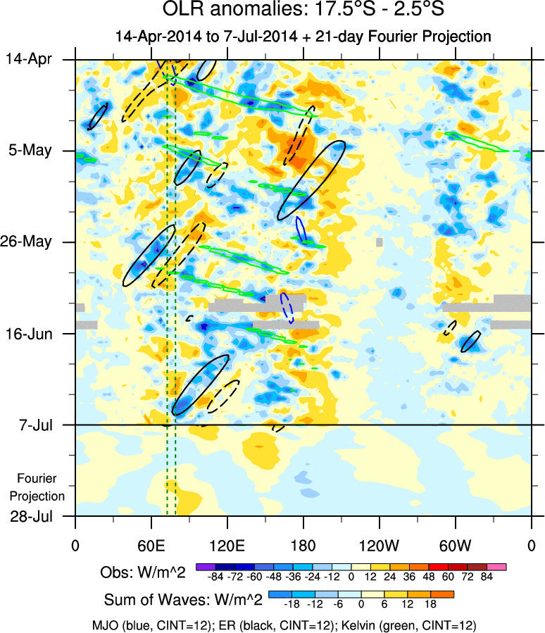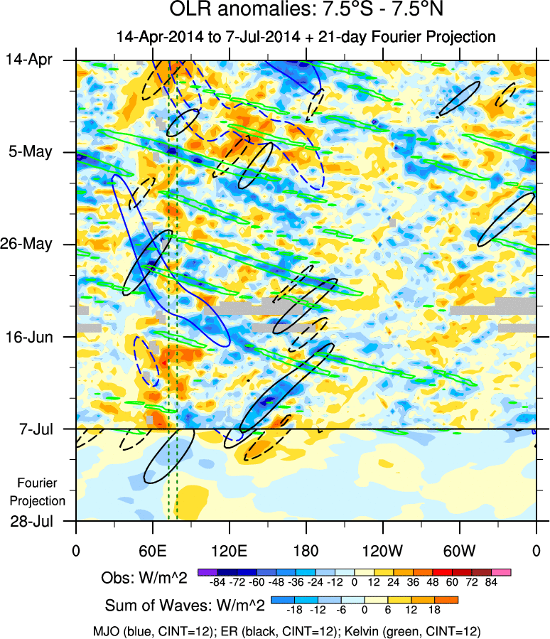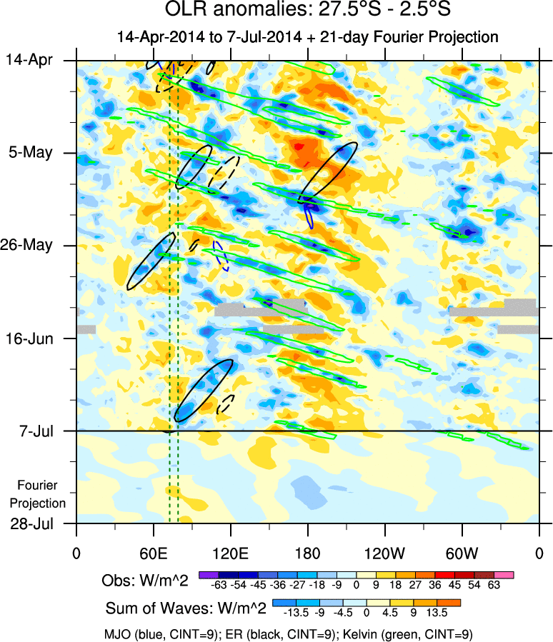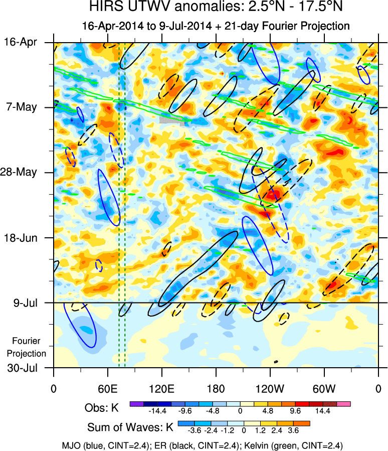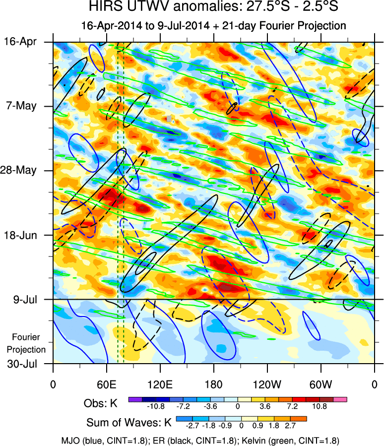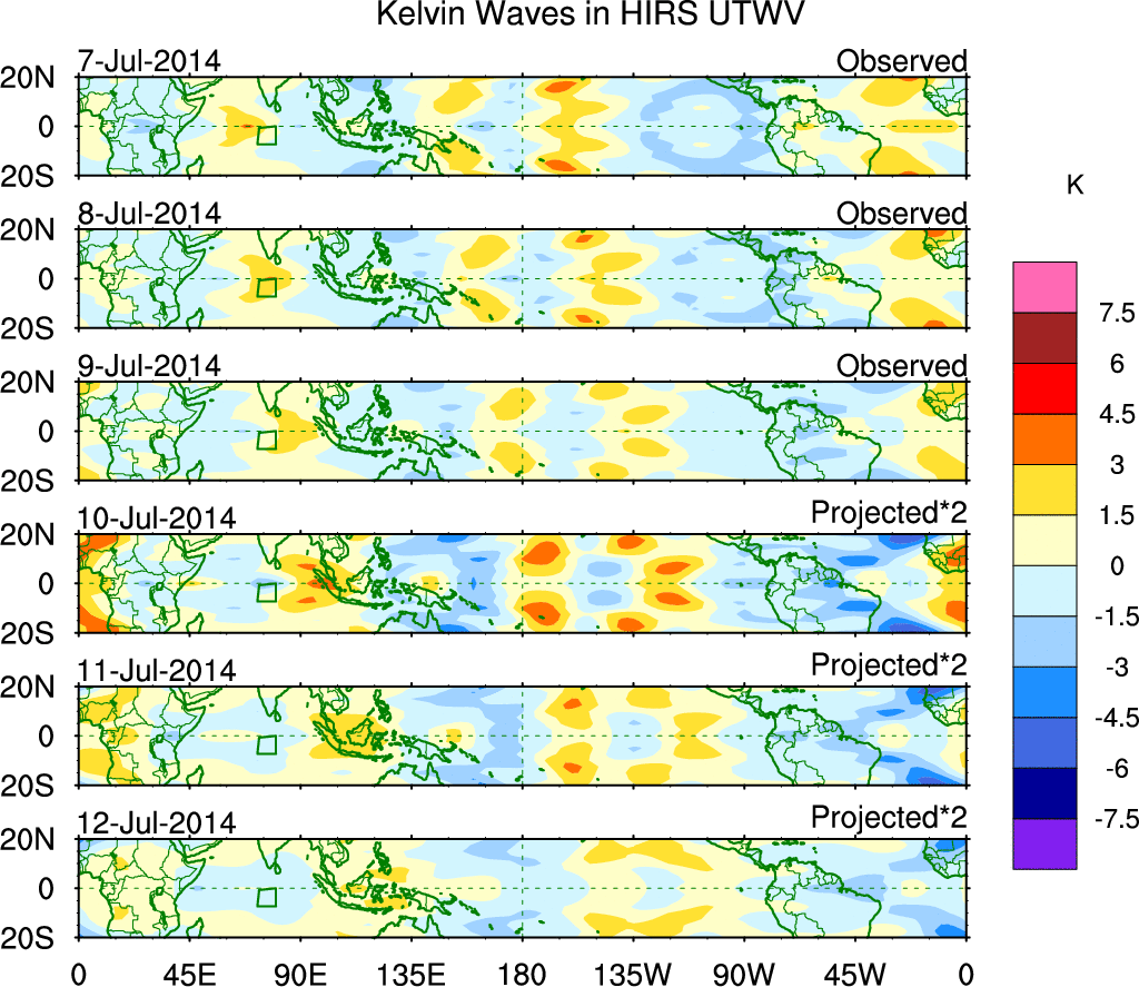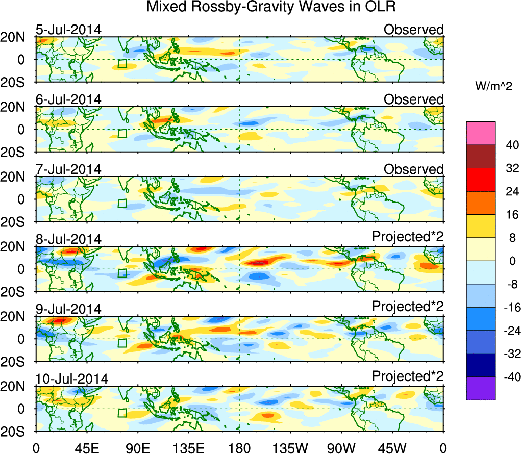 To identify tropical waves in near real-time, the OLR and UTWV data are filtered following Wheeler & Weickmann (2001 MWR). The daily anomalies are calculated using the first 3 harmonics of the seasonal cycle for 1979–2009. Missing values are then filled using linear interpolation in space and time. The most recent 365 days of anomalies are padded with 659 days of zeroes, and the result is filtered for each wave type.