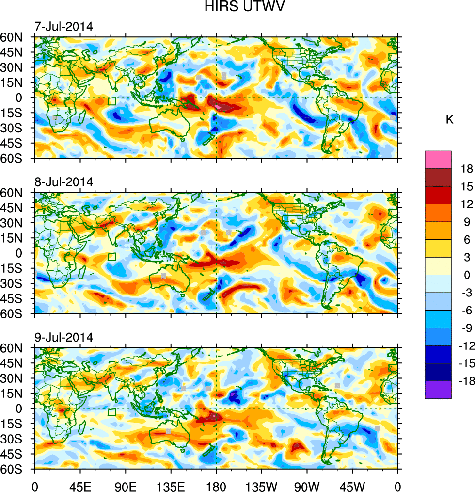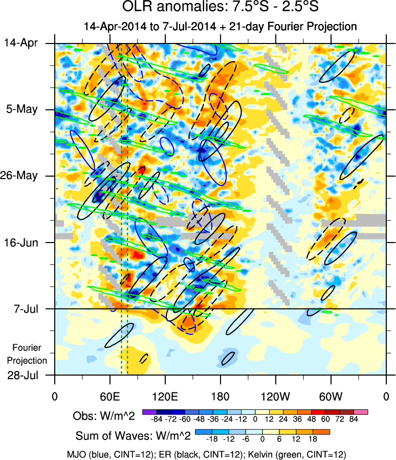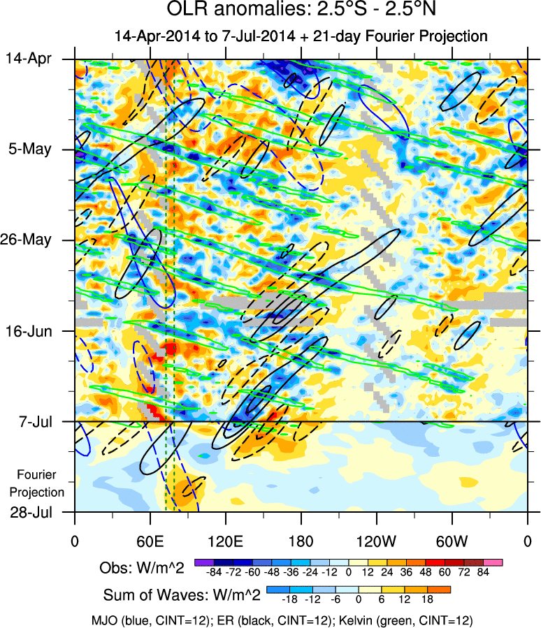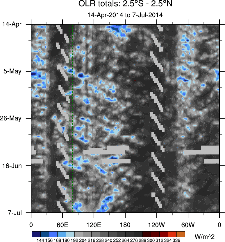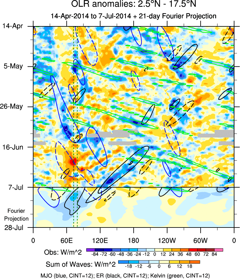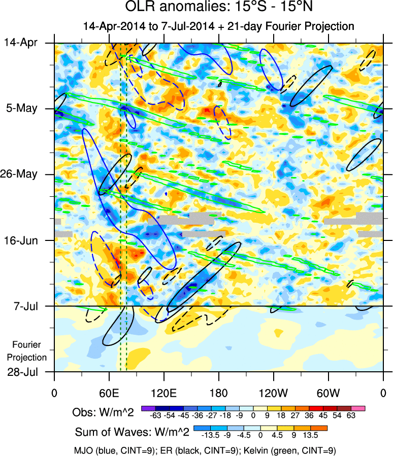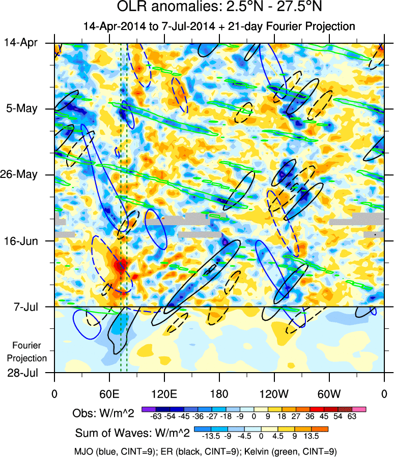 To identify tropical waves in near real-time, the OLR and UTWV data are filtered following Wheeler & Weickmann (2001 MWR). The daily anomalies are calculated using the first 3 harmonics of the seasonal cycle for 1979–2009. Missing values are then filled using linear interpolation in space and time. The most recent 365 days of anomalies are padded with 659 days of zeroes, and the result is filtered for each wave type.