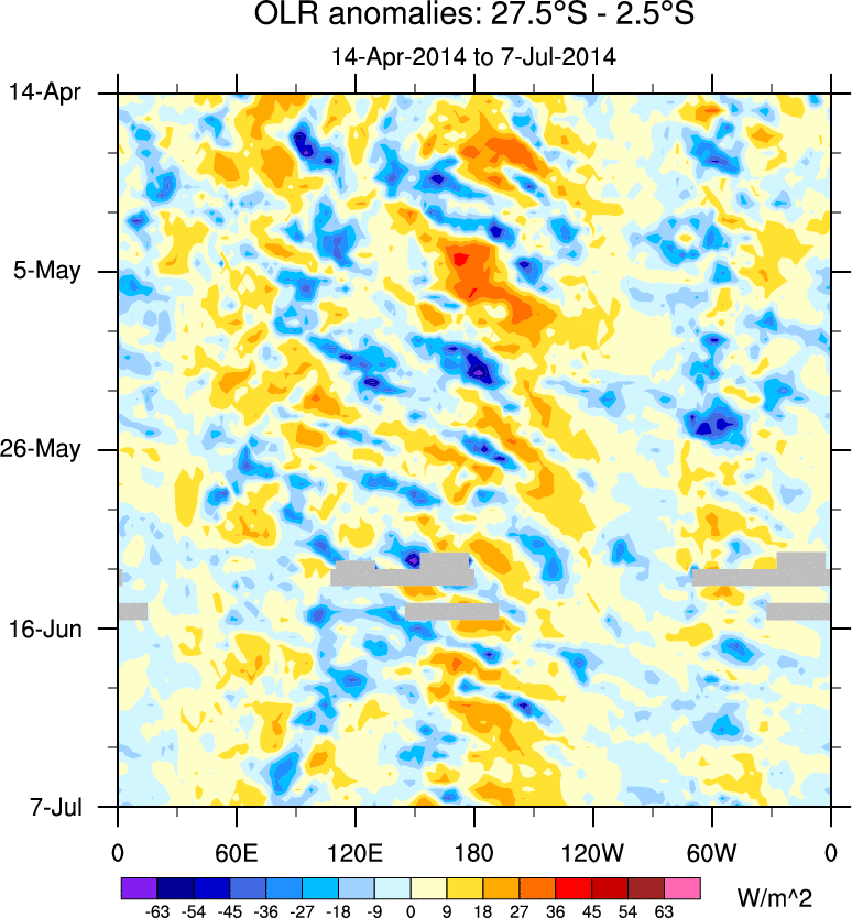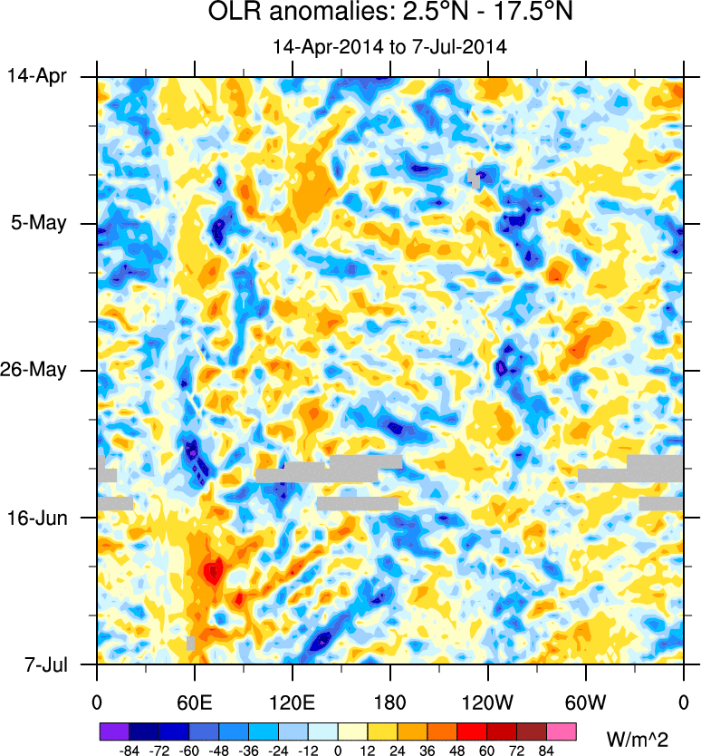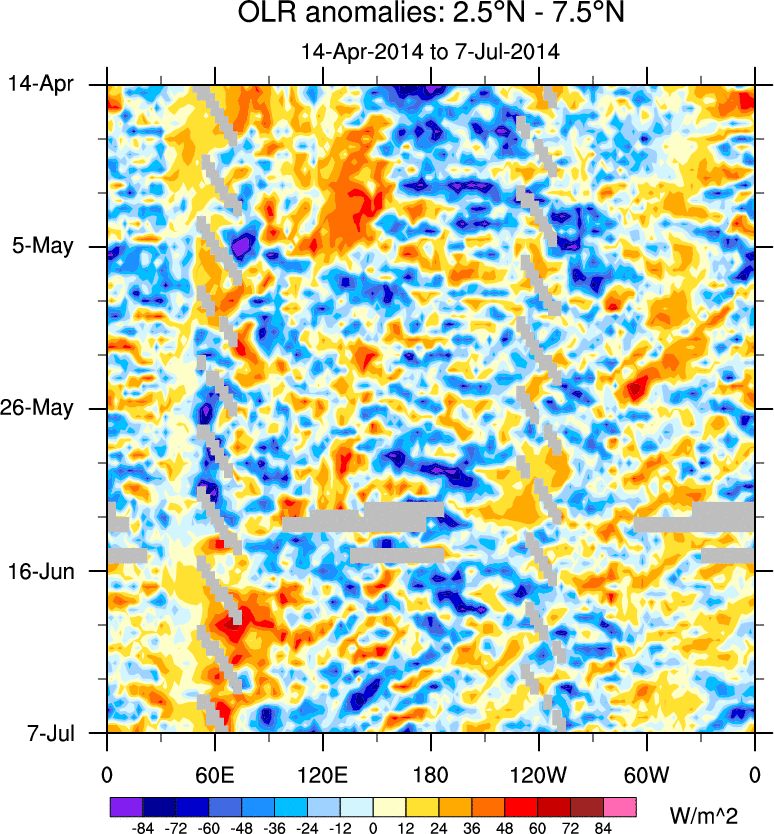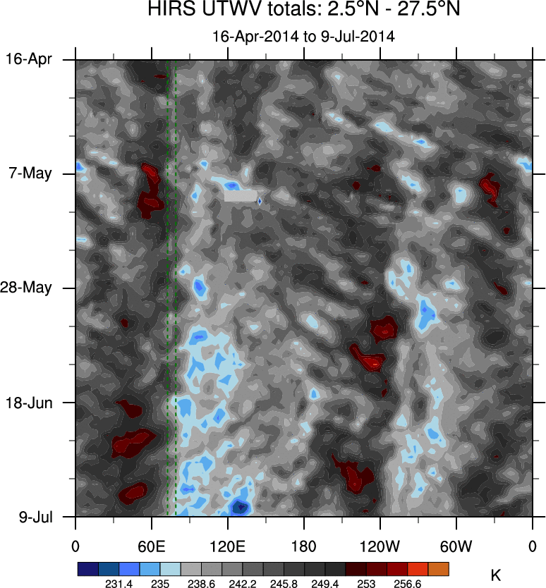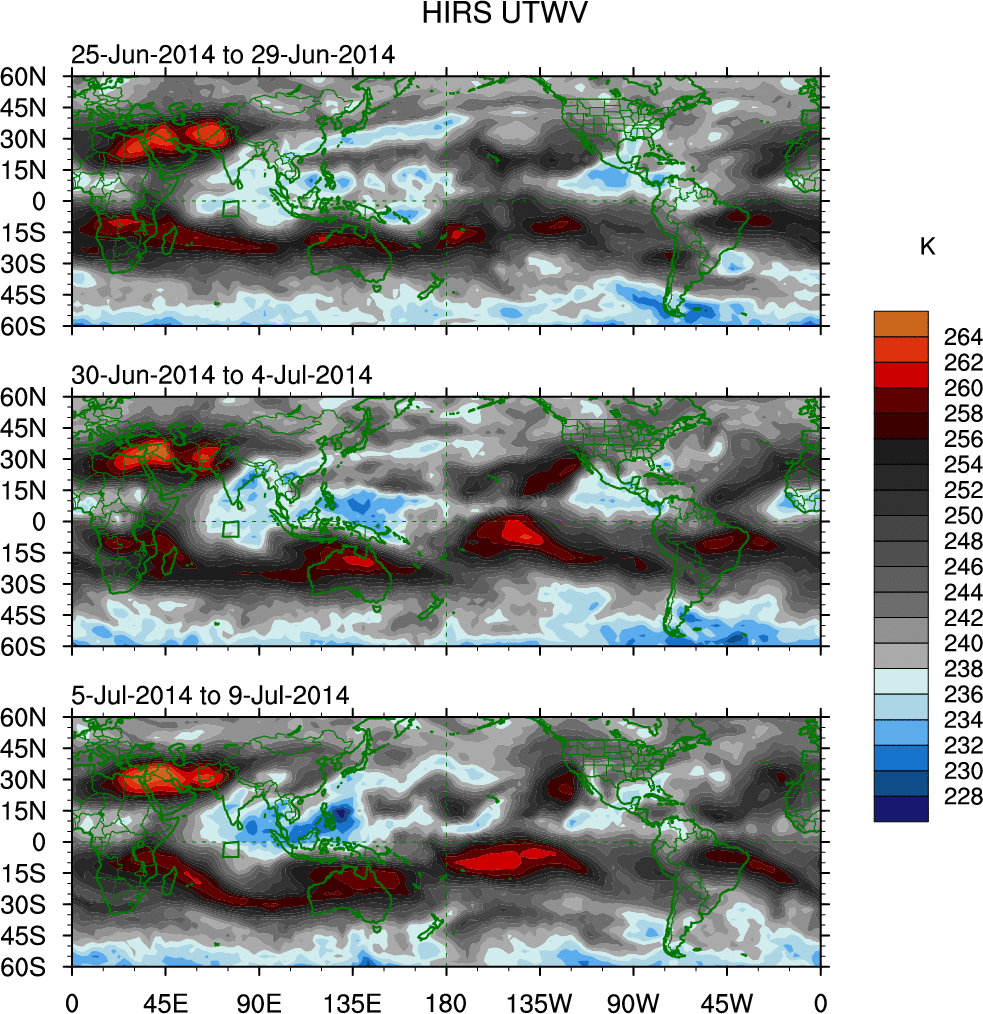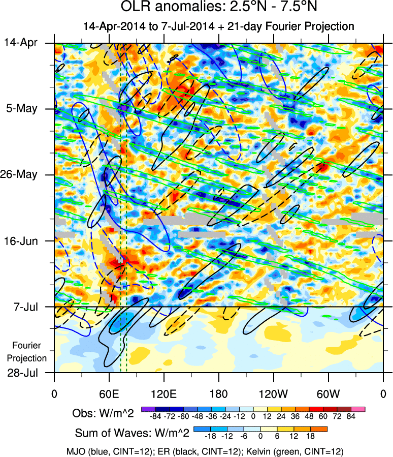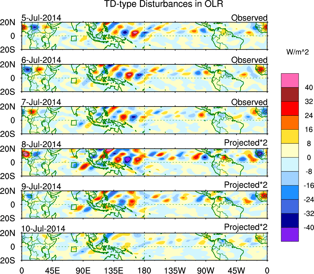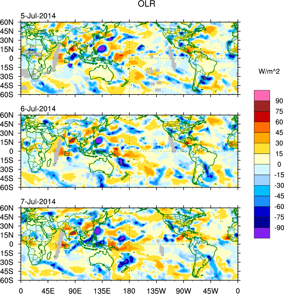 To identify tropical waves in near real-time, the OLR and UTWV data are filtered following Wheeler & Weickmann (2001 MWR). The daily anomalies are calculated using the first 3 harmonics of the seasonal cycle for 1979–2009. Missing values are then filled using linear interpolation in space and time. The most recent 365 days of anomalies are padded with 659 days of zeroes, and the result is filtered for each wave type.