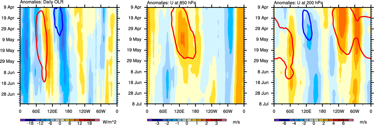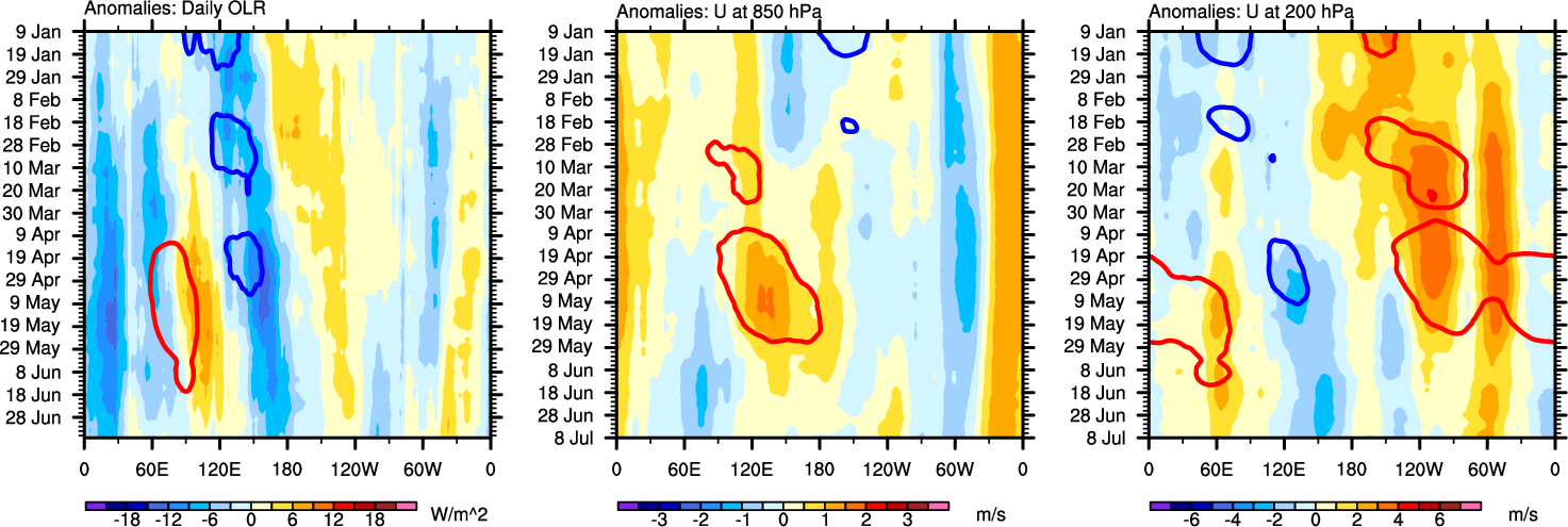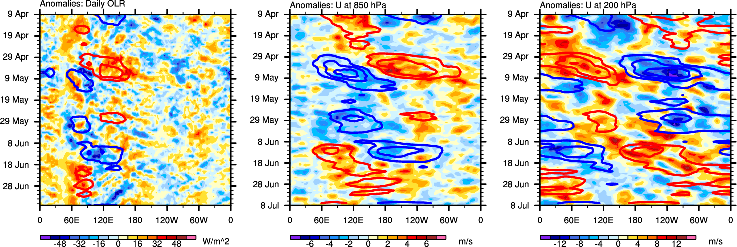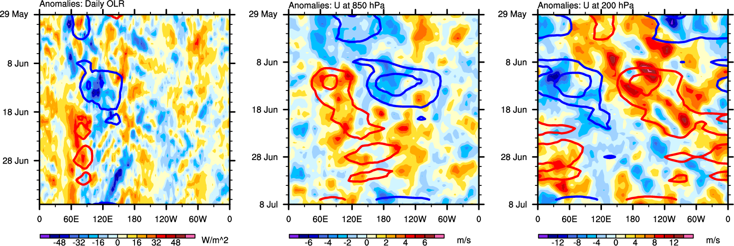 The Hovmöllers show longitude-time plots for OLR, U-850, and U-200. The shading indicates the observed anomalies, while the contours are the projection of those anomalies onto the RMM EOFs.