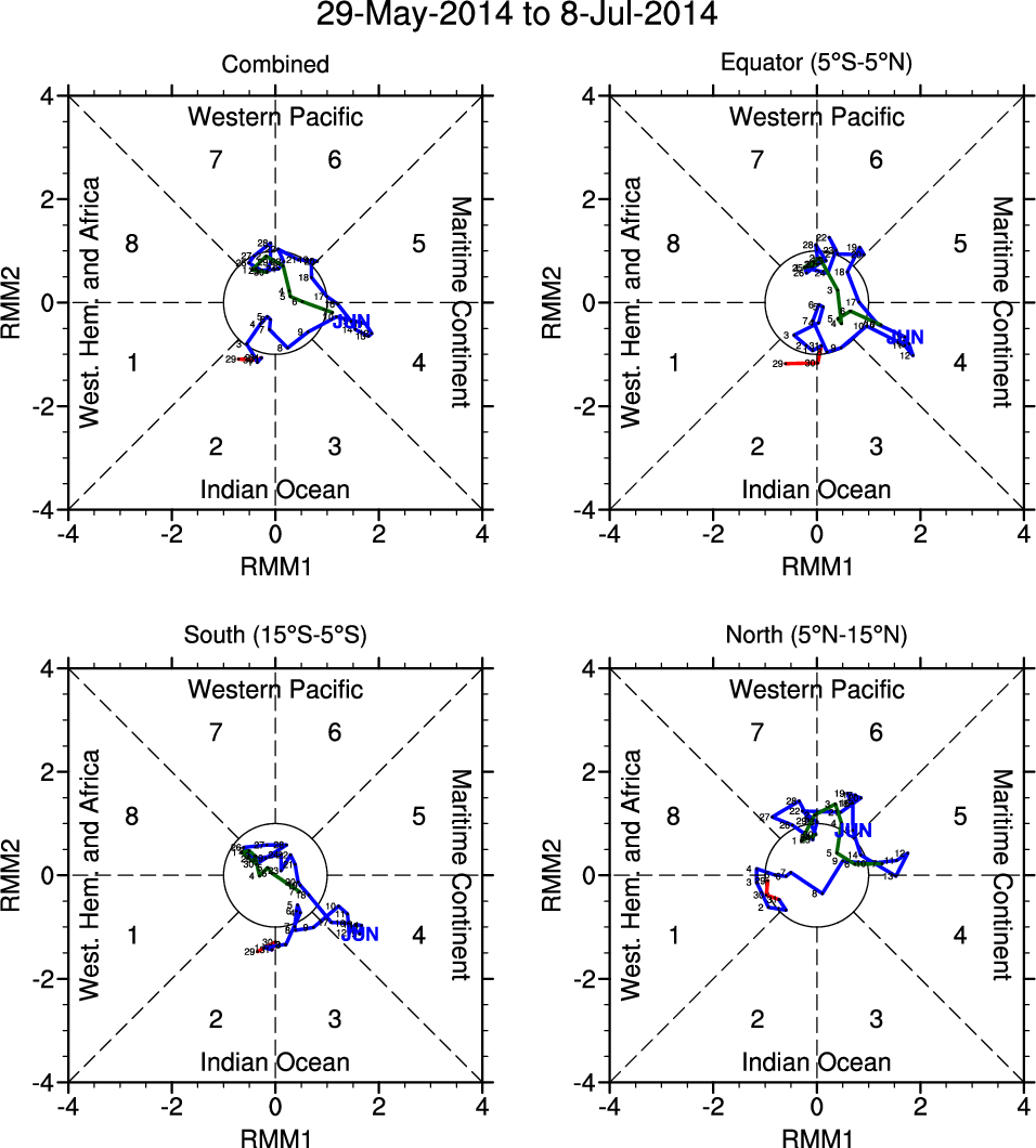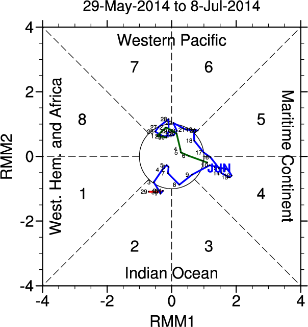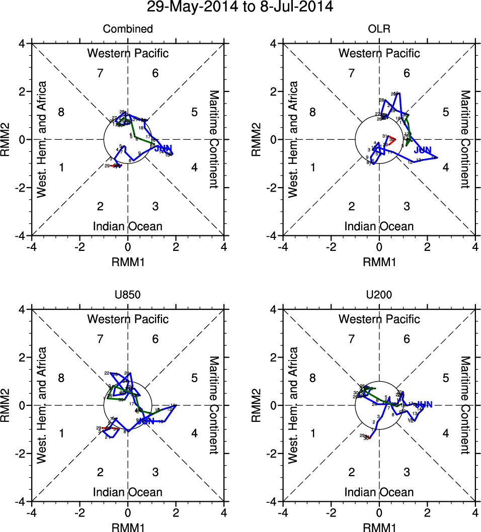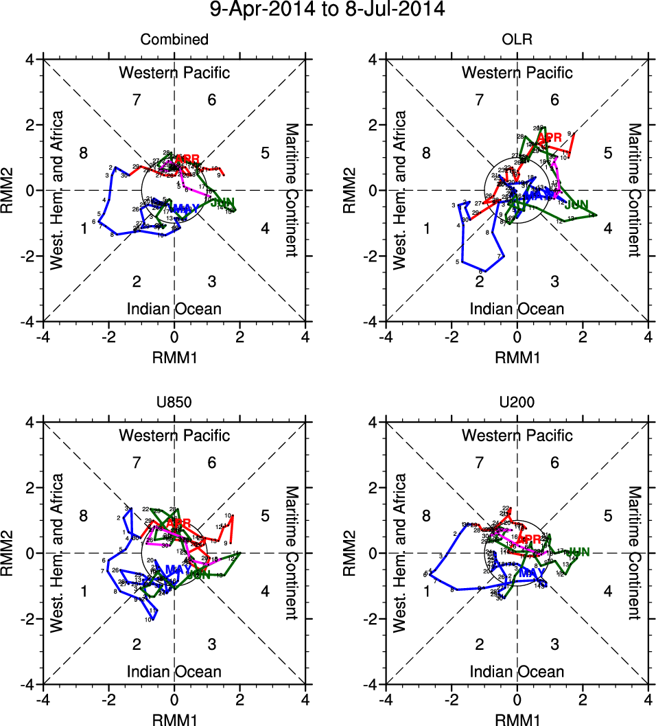 Wheeler and Hendon (2004) constructed the RMM index for monitoring the MJO. This index consists of the first two principal components (PCs) of OLR, 850-hPa zonal wind, and 200-hPa zonal wind averaged 15S-15N.