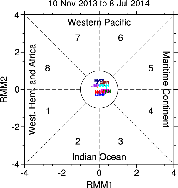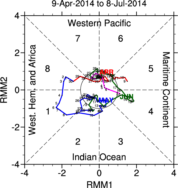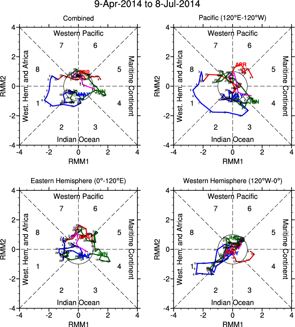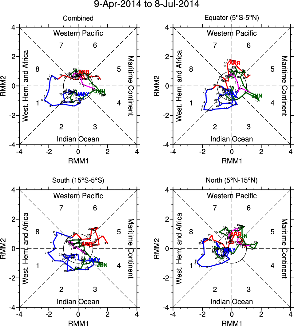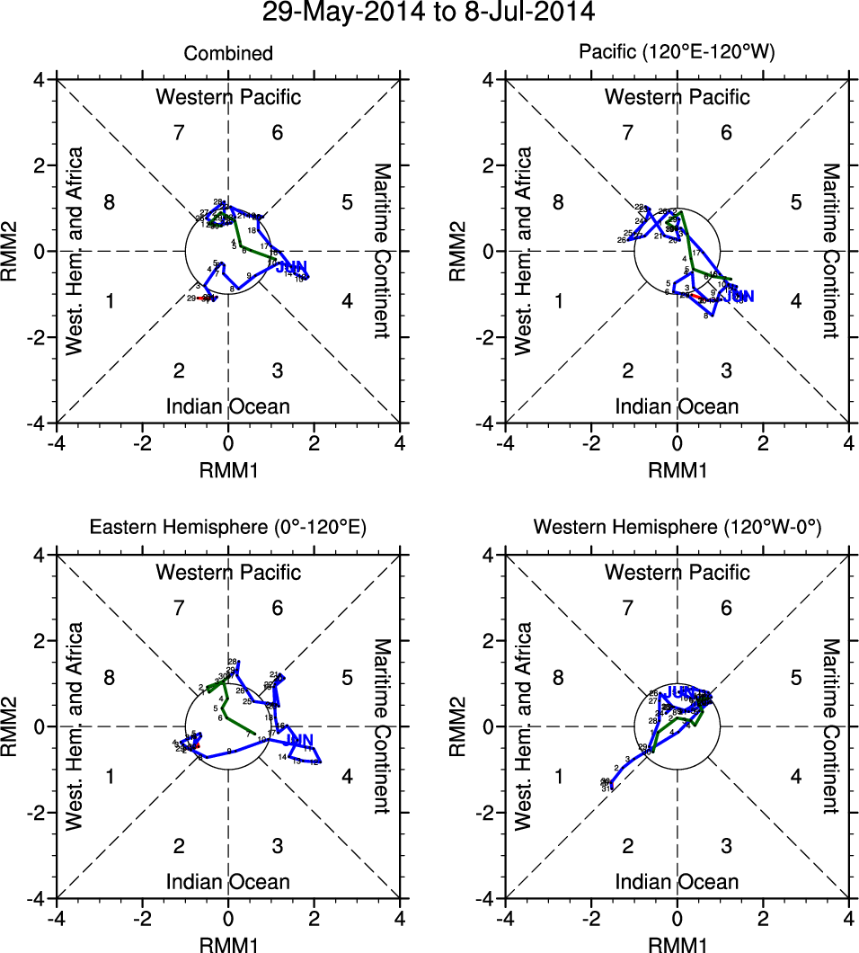 Wheeler and Hendon (2004) constructed the RMM index for monitoring the MJO. This index consists of the first two principal components (PCs) of OLR, 850-hPa zonal wind, and 200-hPa zonal wind averaged 15S-15N.