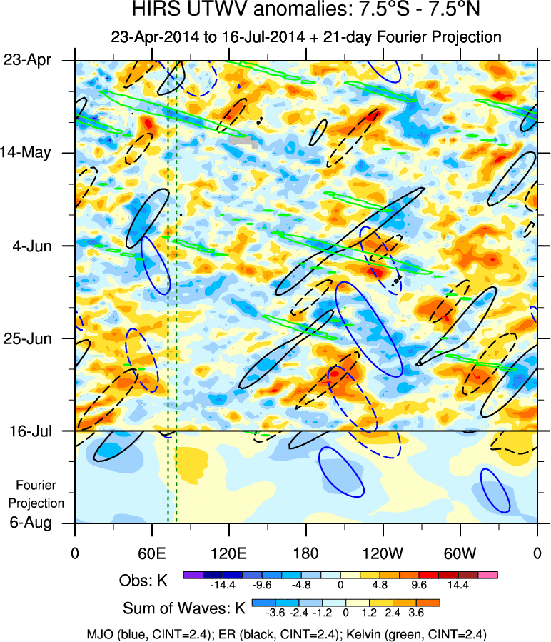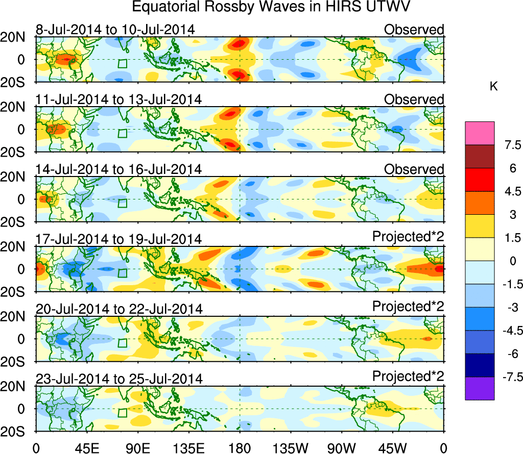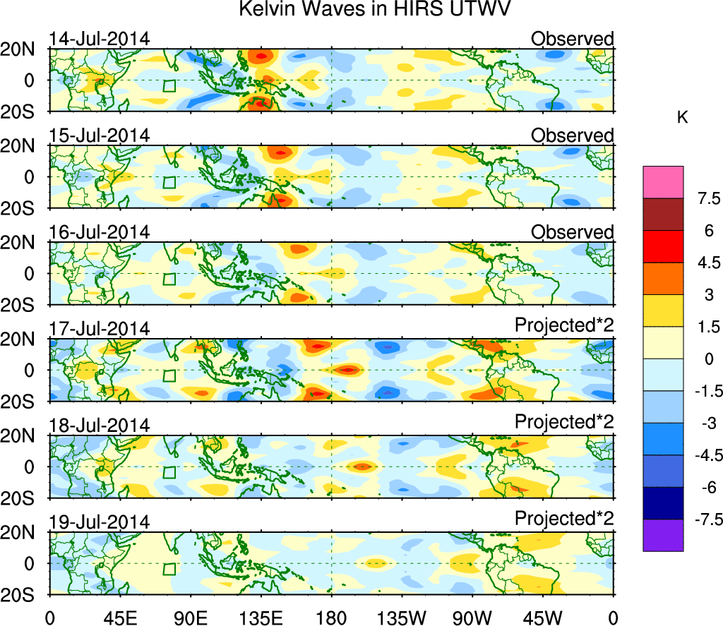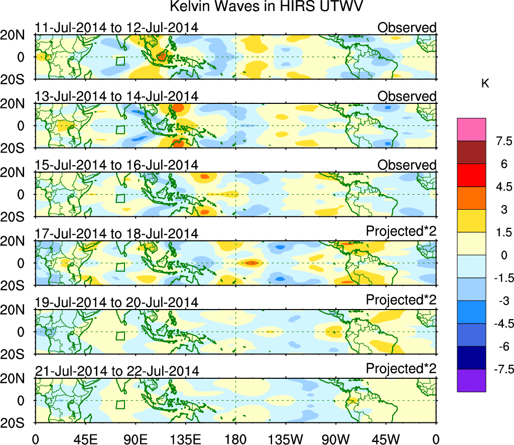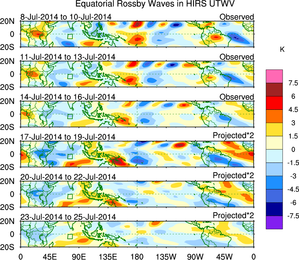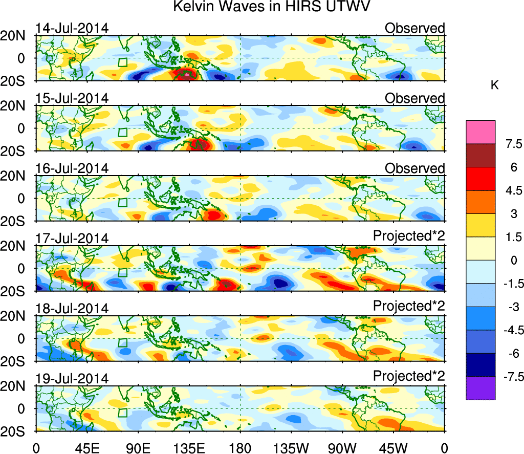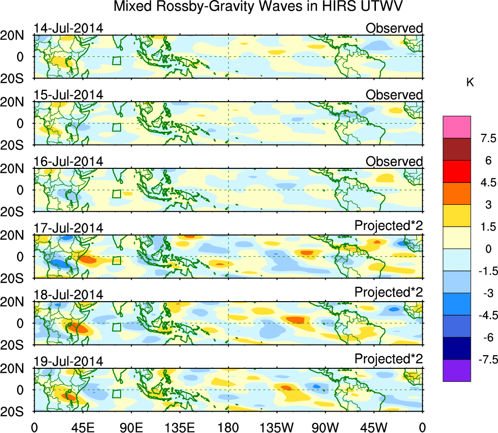 To identify tropical waves in near real-time, the OLR and UTWV data are filtered following Wheeler & Weickmann (2001 MWR). The daily anomalies are calculated using the first 3 harmonics of the seasonal cycle for 1979–2009. Missing values are then filled using linear interpolation in space and time. The most recent 365 days of anomalies are padded with 659 days of zeroes, and the result is filtered for each wave type.