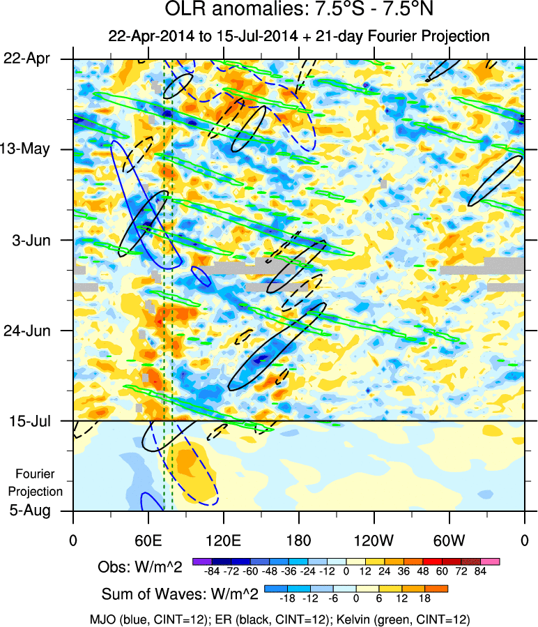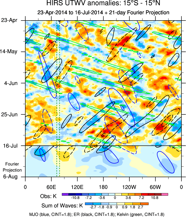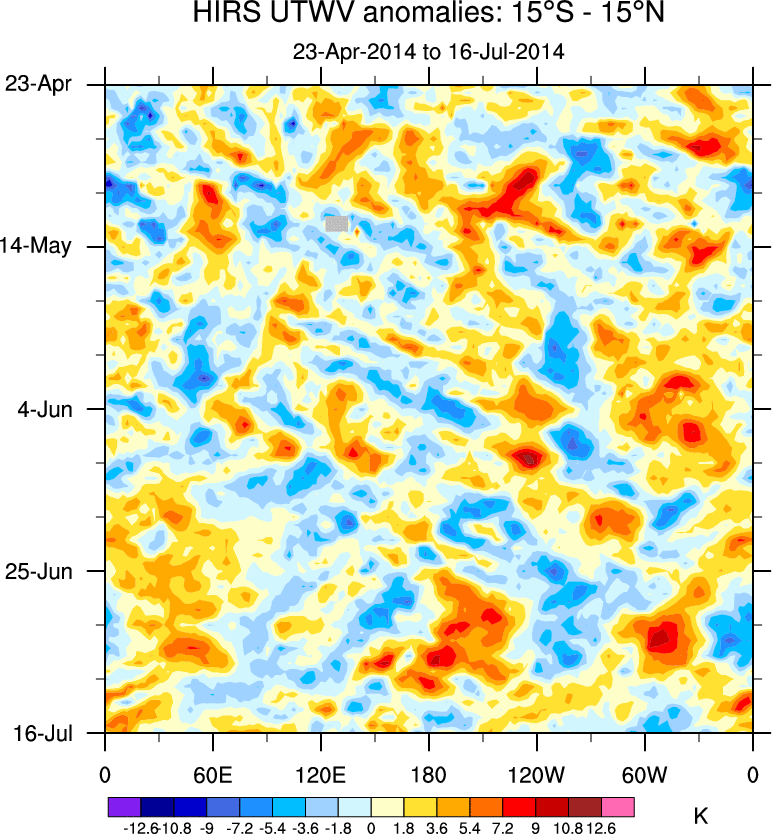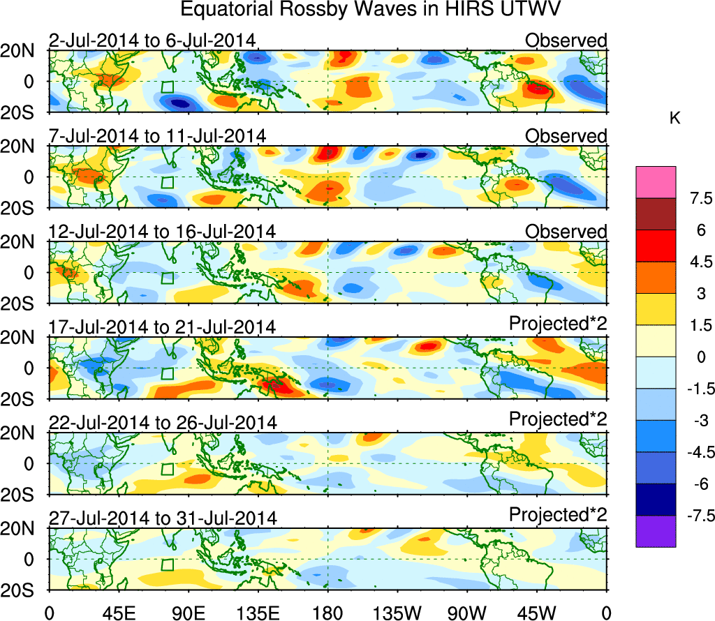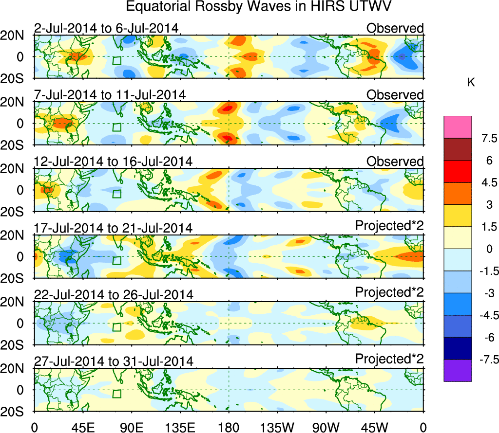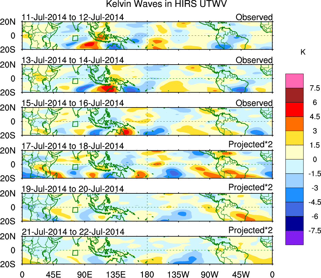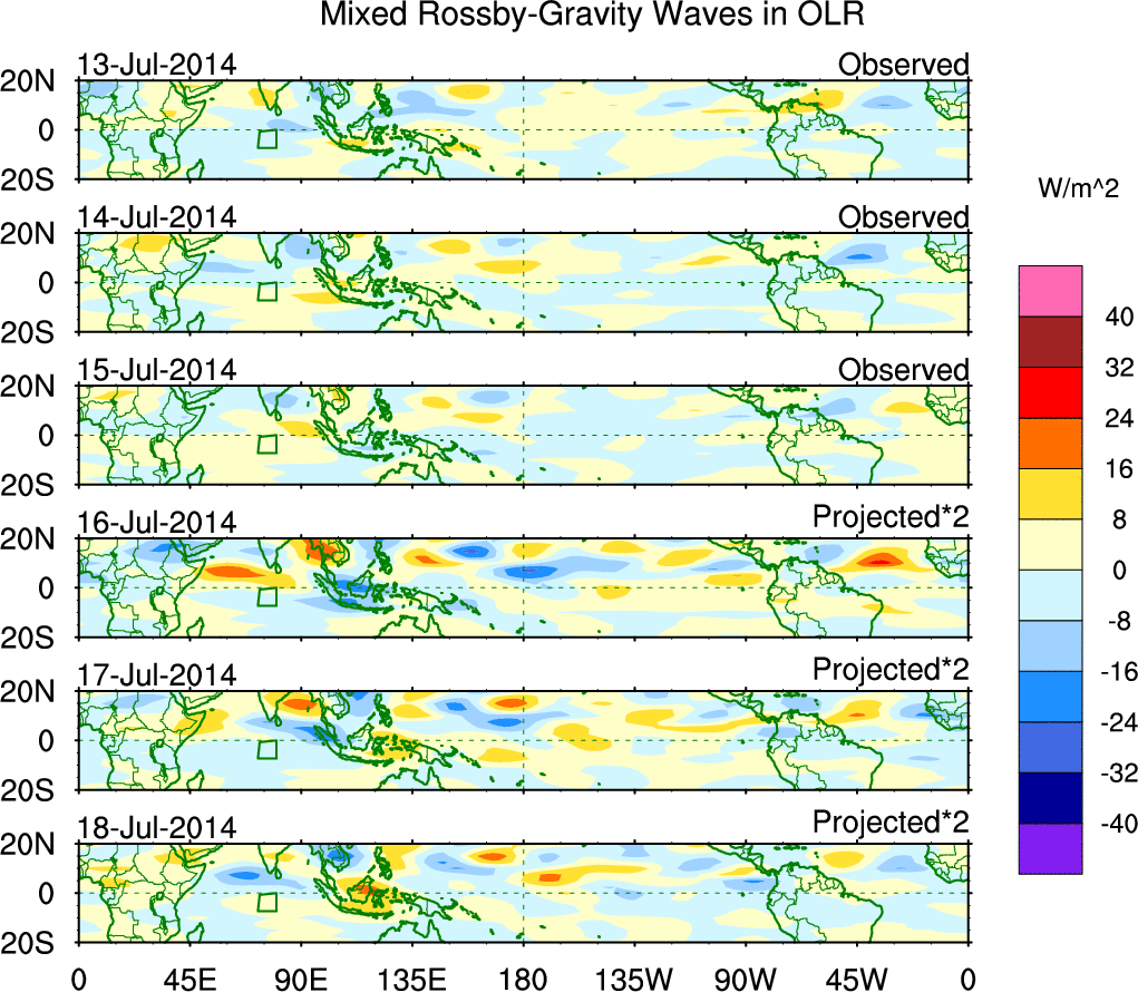 To identify tropical waves in near real-time, the OLR and UTWV data are filtered following Wheeler & Weickmann (2001 MWR). The daily anomalies are calculated using the first 3 harmonics of the seasonal cycle for 1979–2009. Missing values are then filled using linear interpolation in space and time. The most recent 365 days of anomalies are padded with 659 days of zeroes, and the result is filtered for each wave type.