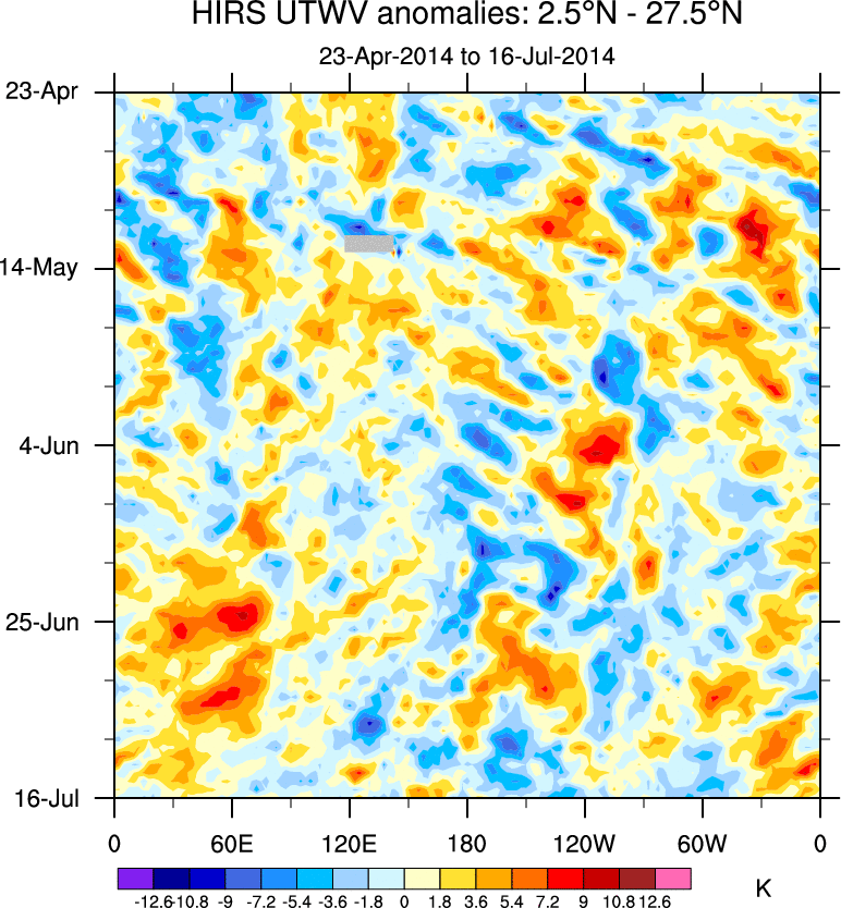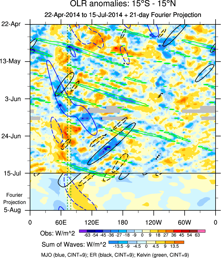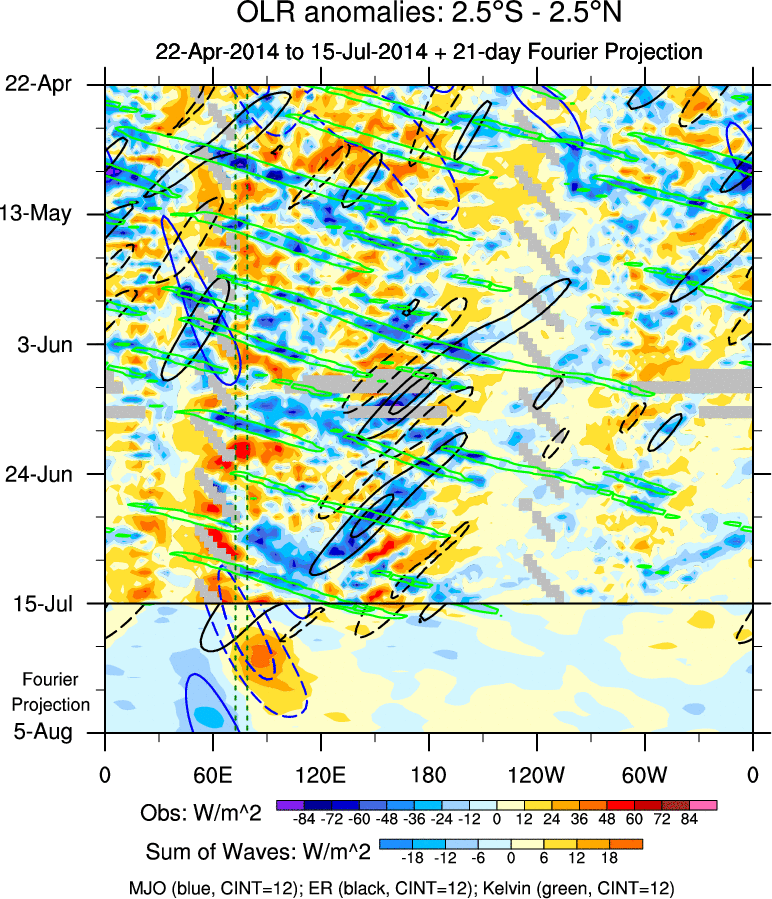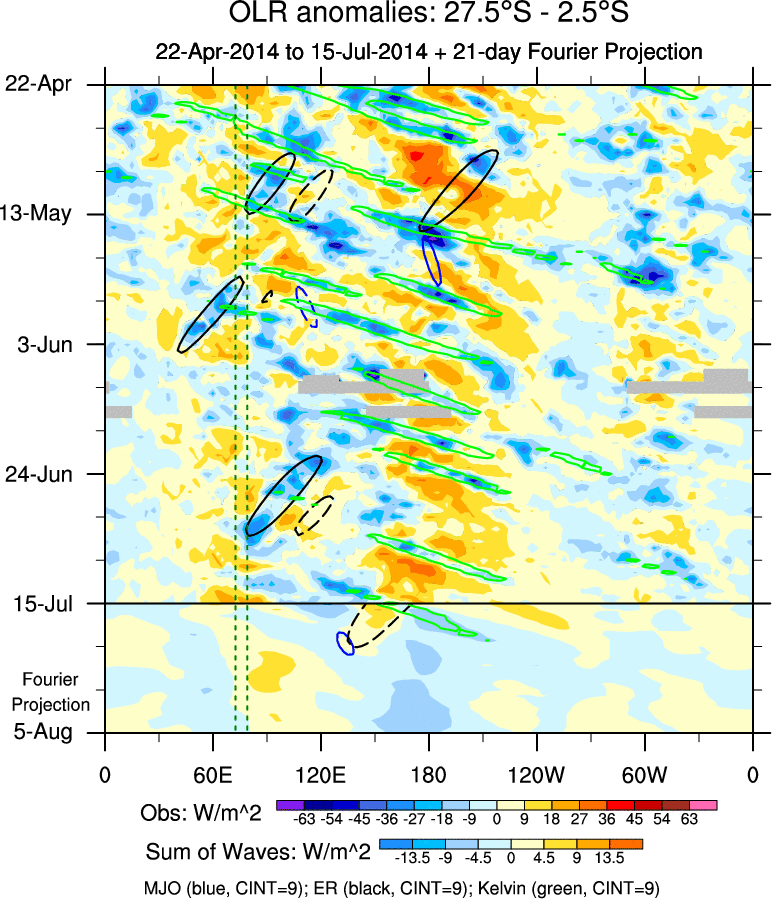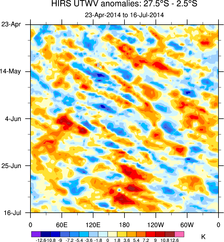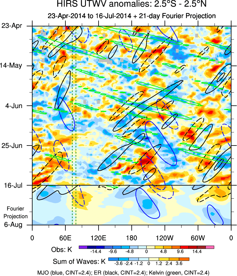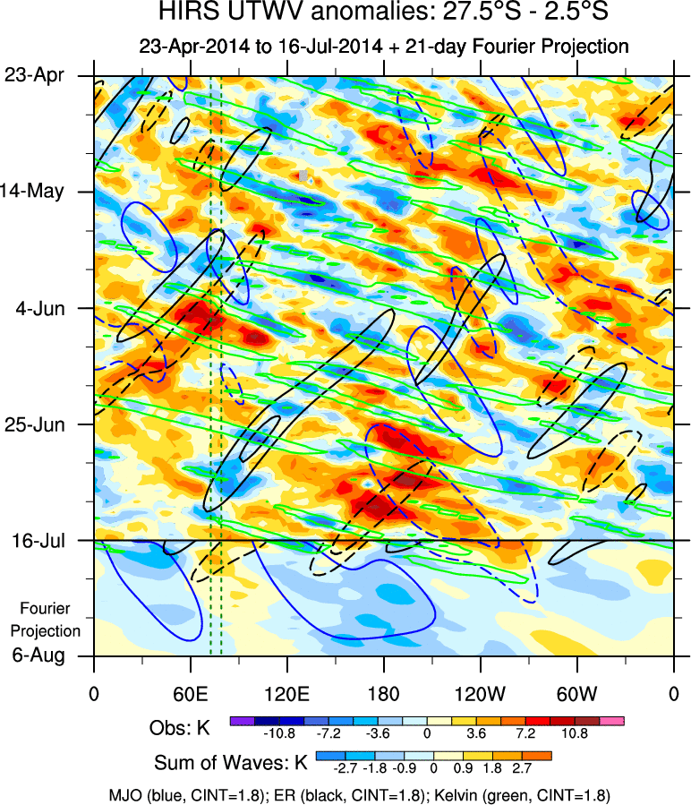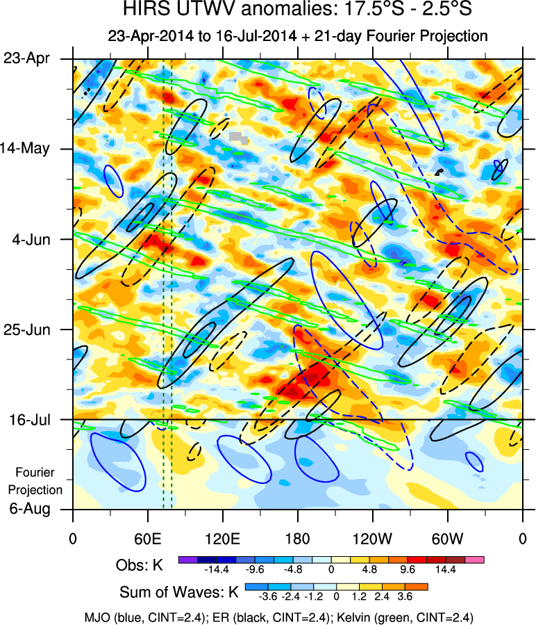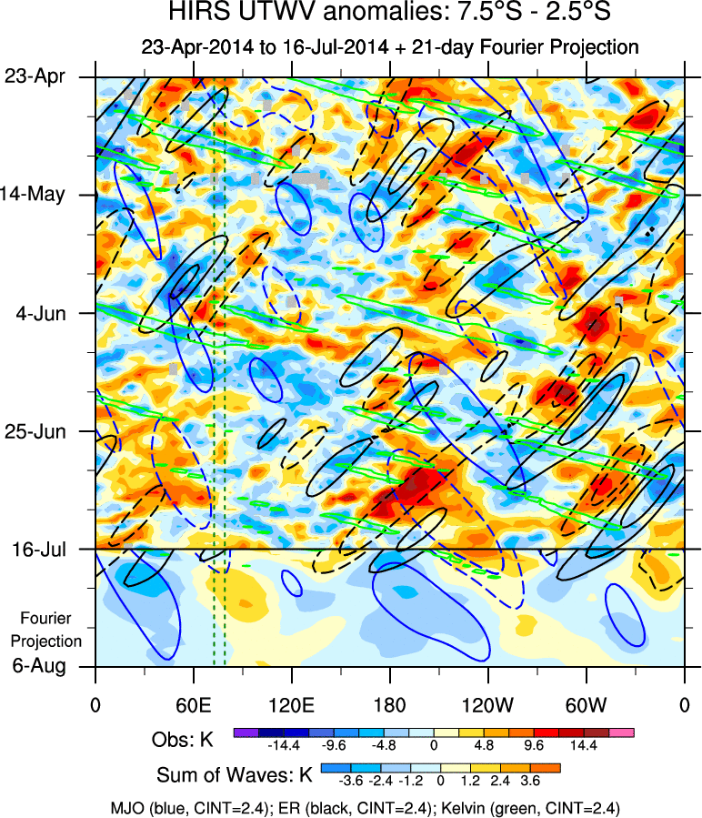 To identify tropical waves in near real-time, the OLR and UTWV data are filtered following Wheeler & Weickmann (2001 MWR). The daily anomalies are calculated using the first 3 harmonics of the seasonal cycle for 1979–2009. Missing values are then filled using linear interpolation in space and time. The most recent 365 days of anomalies are padded with 659 days of zeroes, and the result is filtered for each wave type.