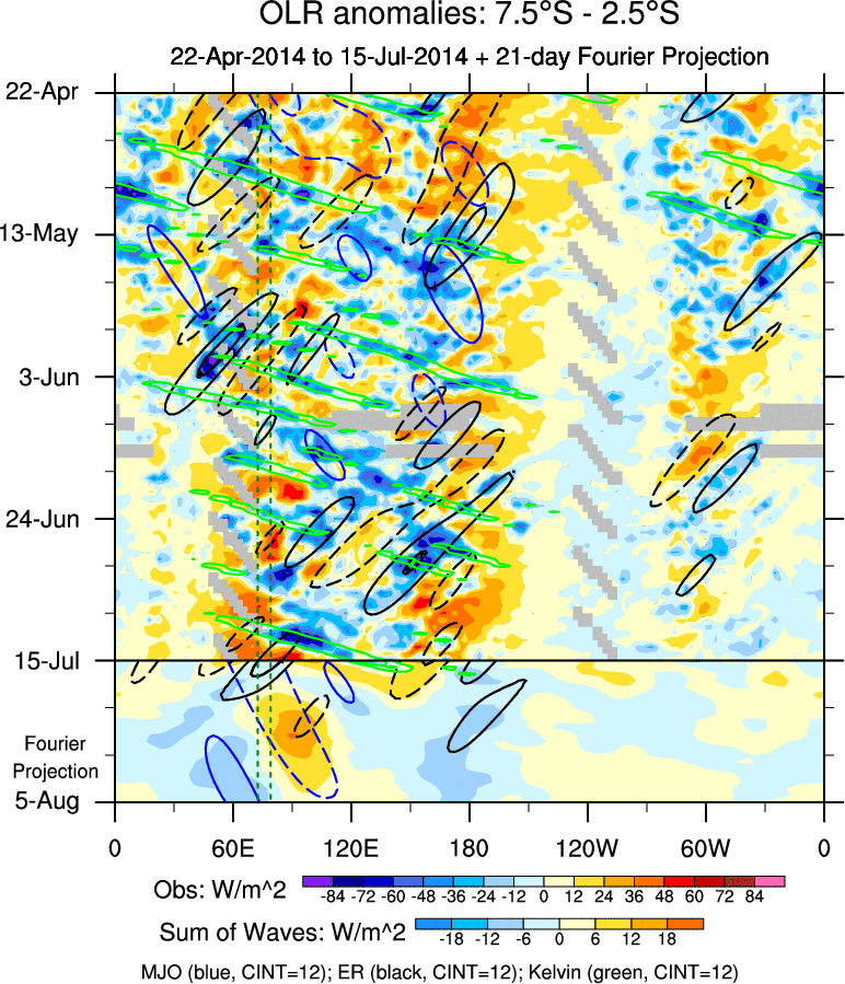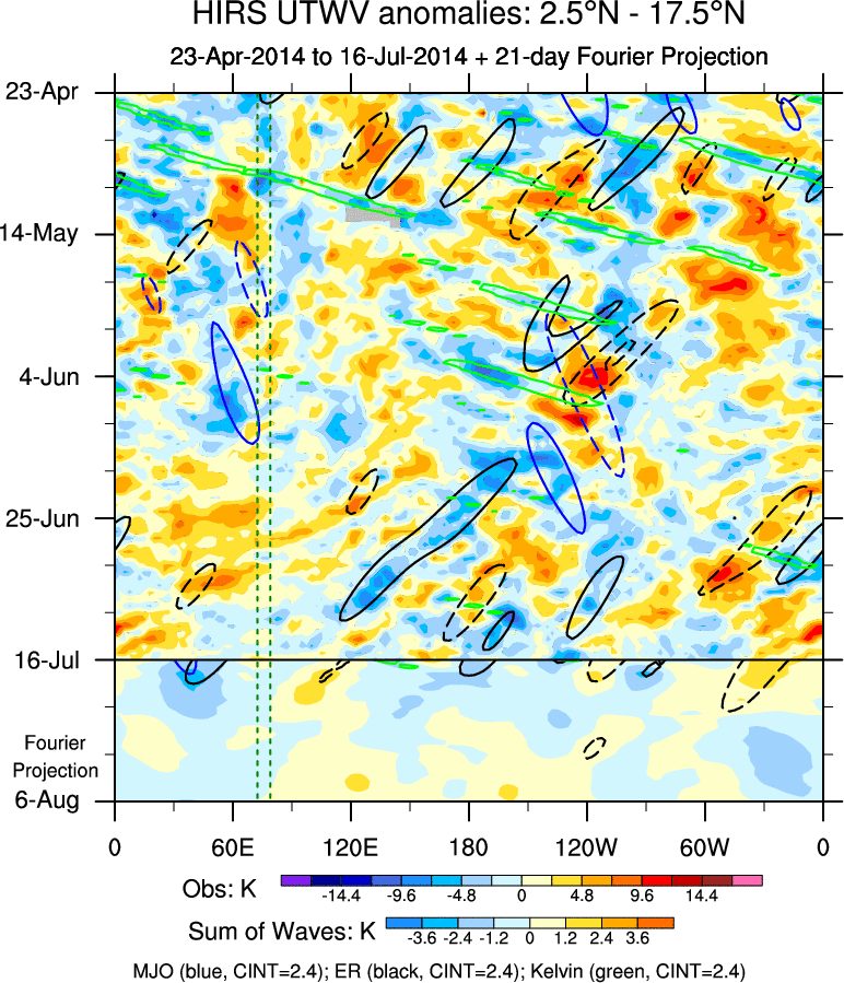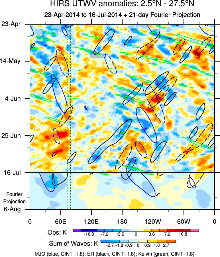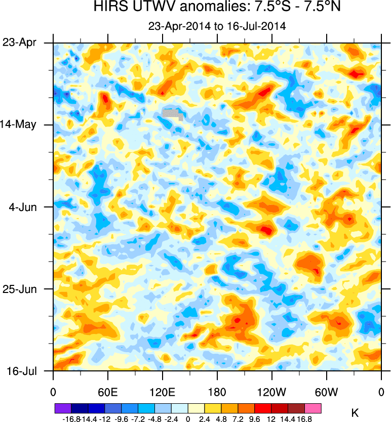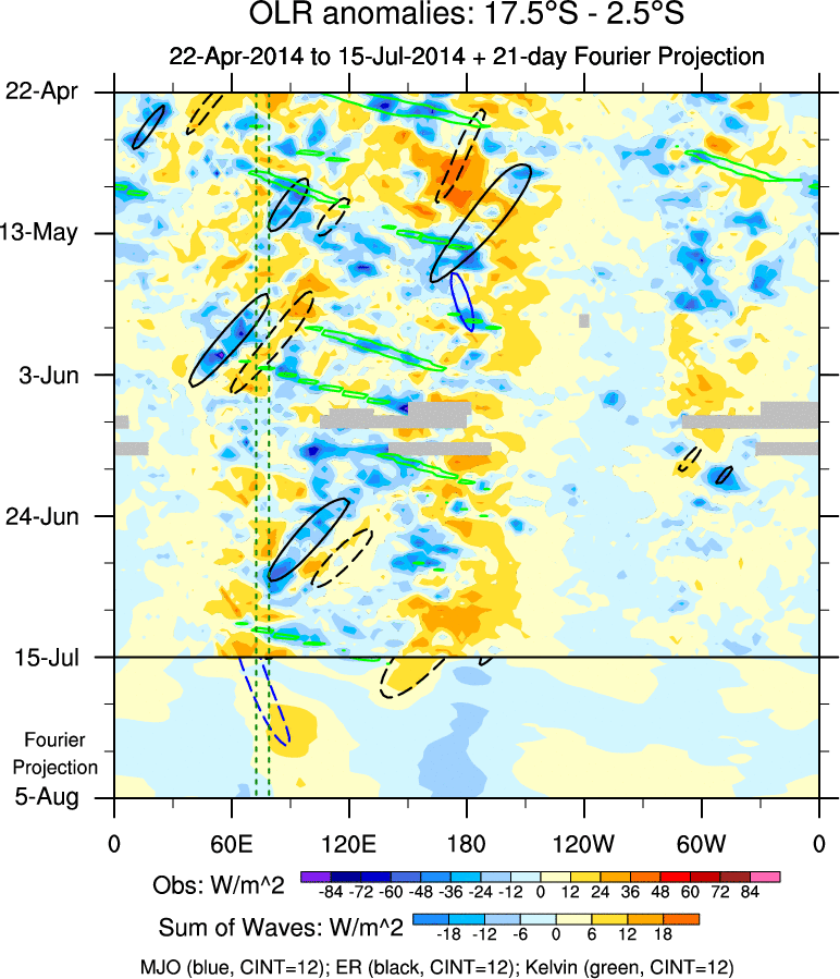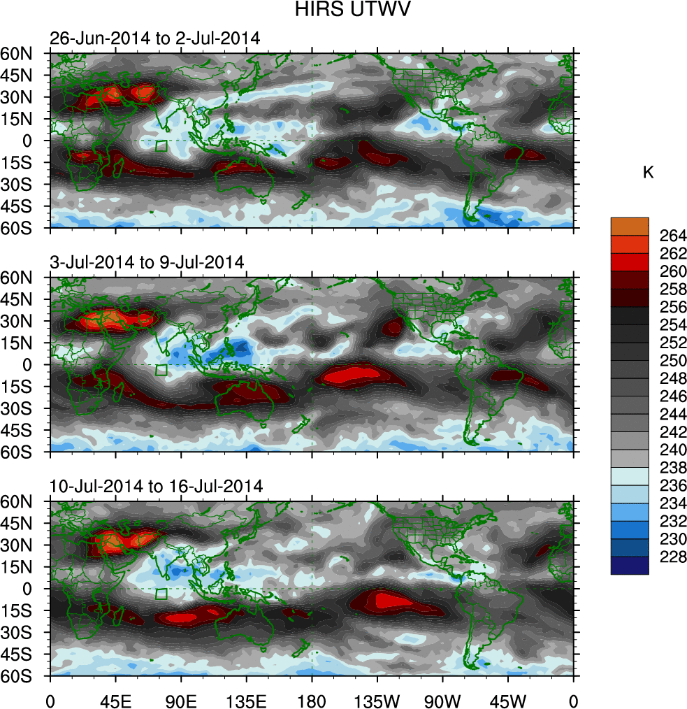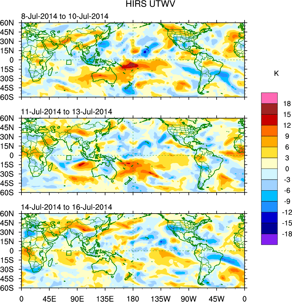 To identify tropical waves in near real-time, the OLR and UTWV data are filtered following Wheeler & Weickmann (2001 MWR). The daily anomalies are calculated using the first 3 harmonics of the seasonal cycle for 1979–2009. Missing values are then filled using linear interpolation in space and time. The most recent 365 days of anomalies are padded with 659 days of zeroes, and the result is filtered for each wave type.
