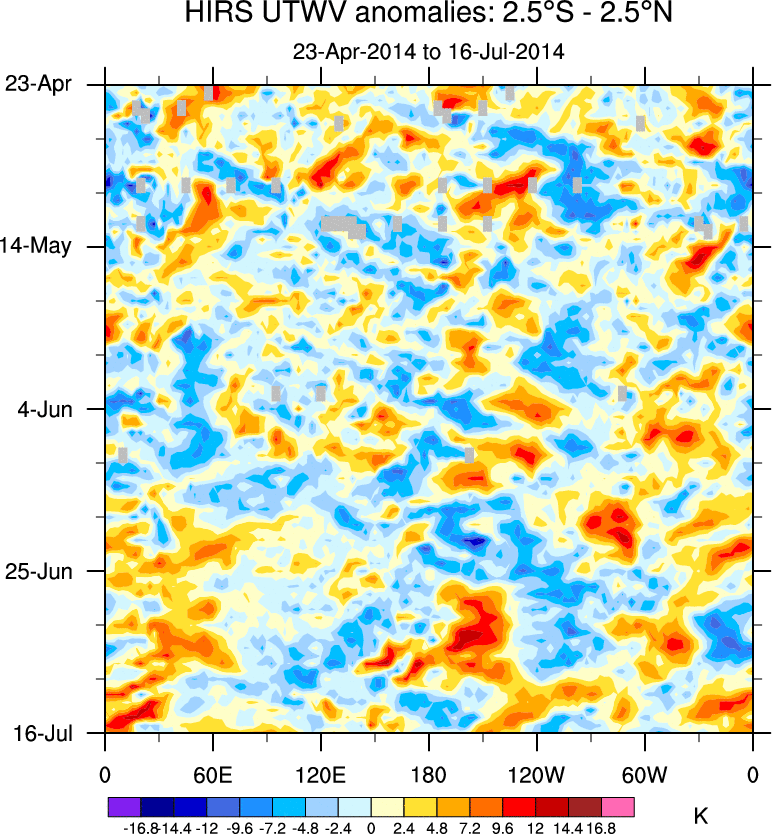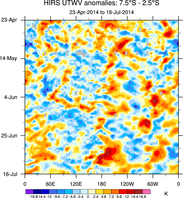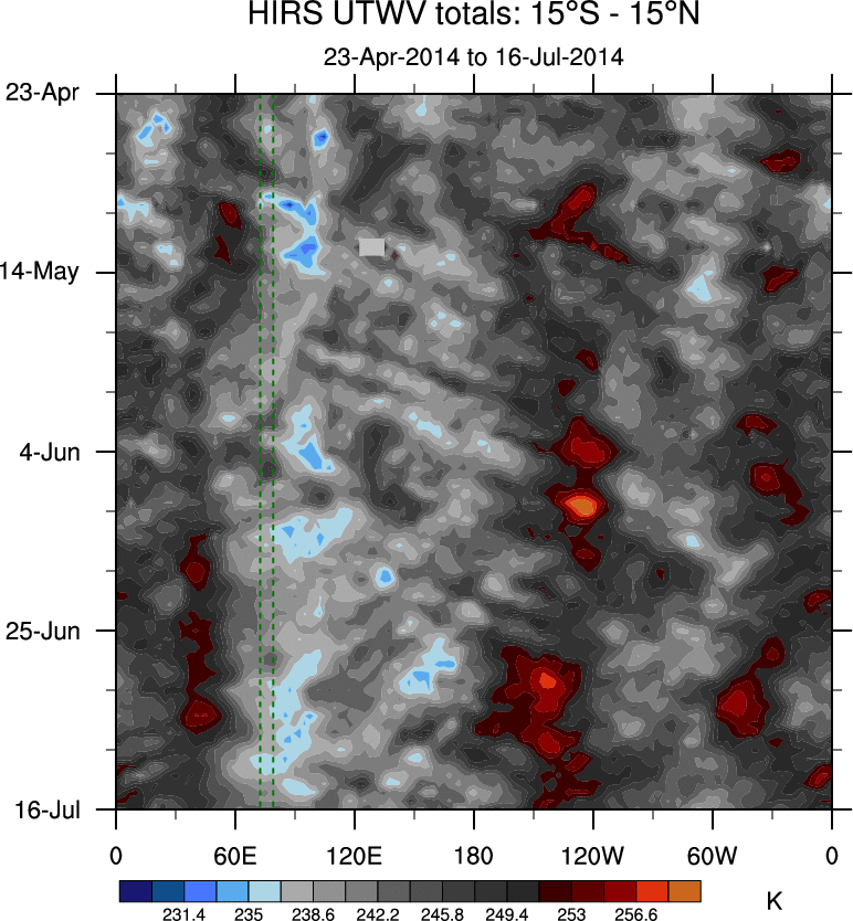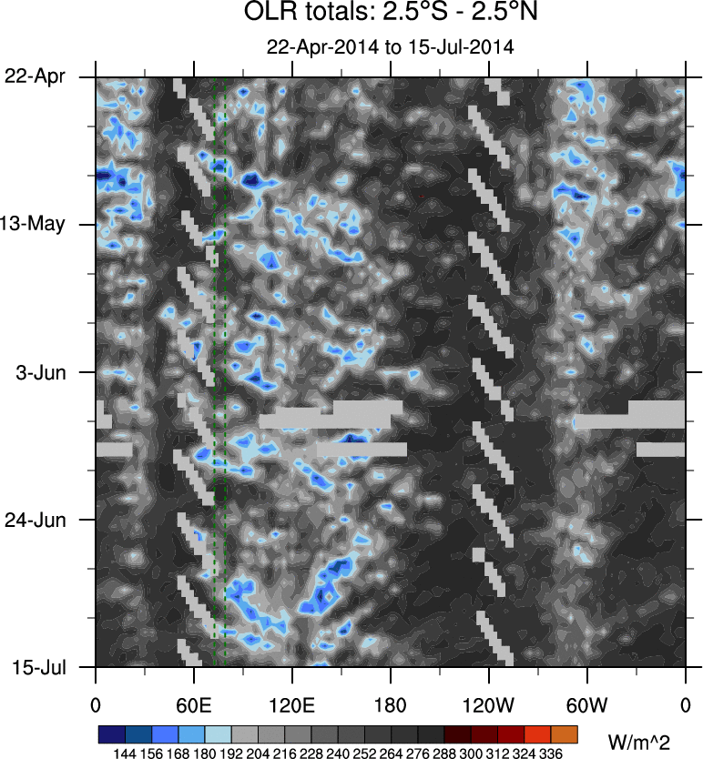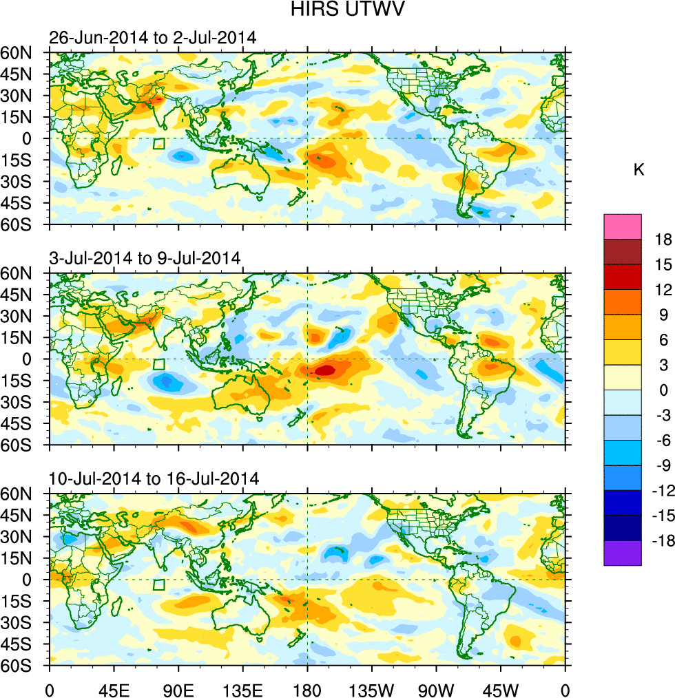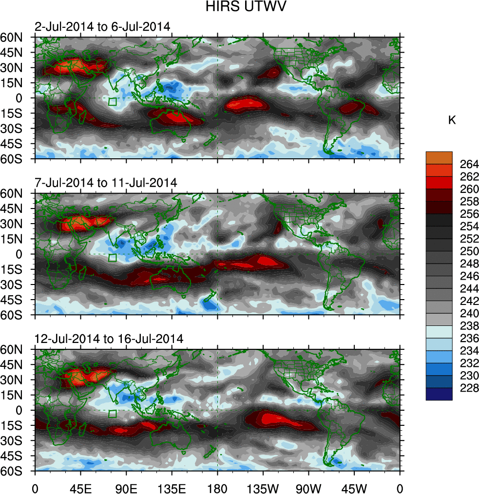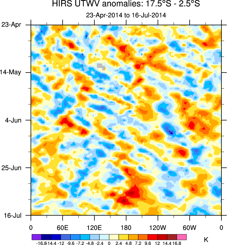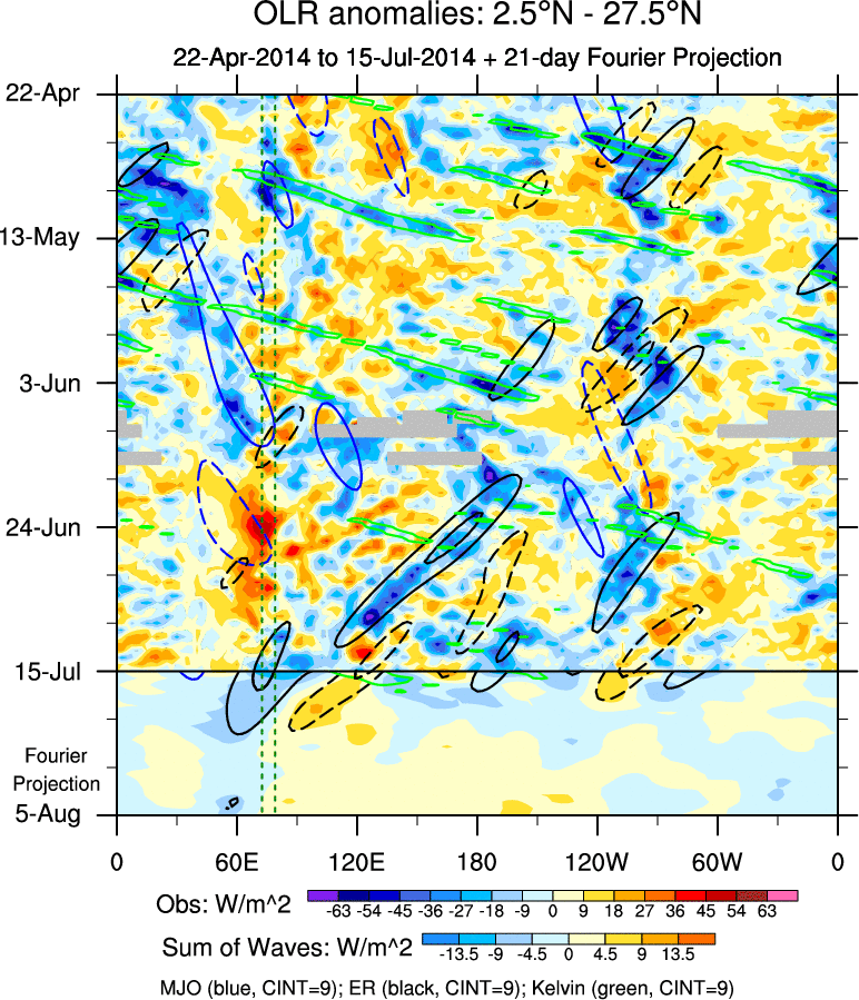 To identify tropical waves in near real-time, the OLR and UTWV data are filtered following Wheeler & Weickmann (2001 MWR). The daily anomalies are calculated using the first 3 harmonics of the seasonal cycle for 1979–2009. Missing values are then filled using linear interpolation in space and time. The most recent 365 days of anomalies are padded with 659 days of zeroes, and the result is filtered for each wave type.
