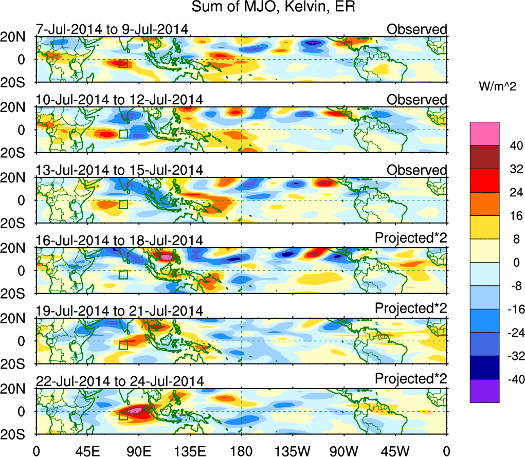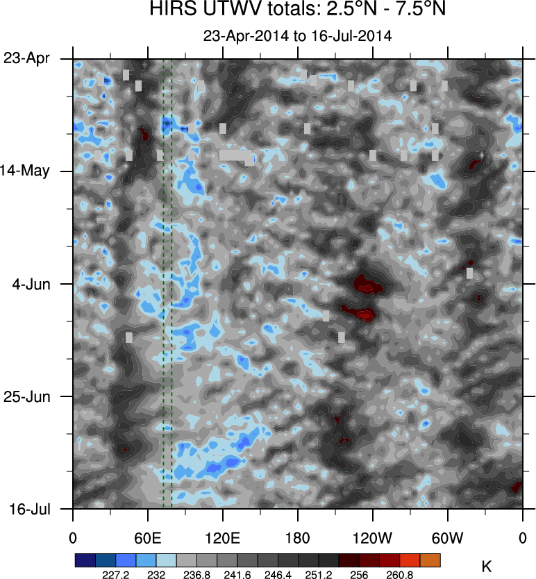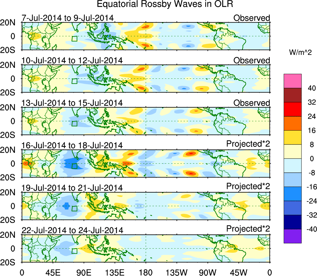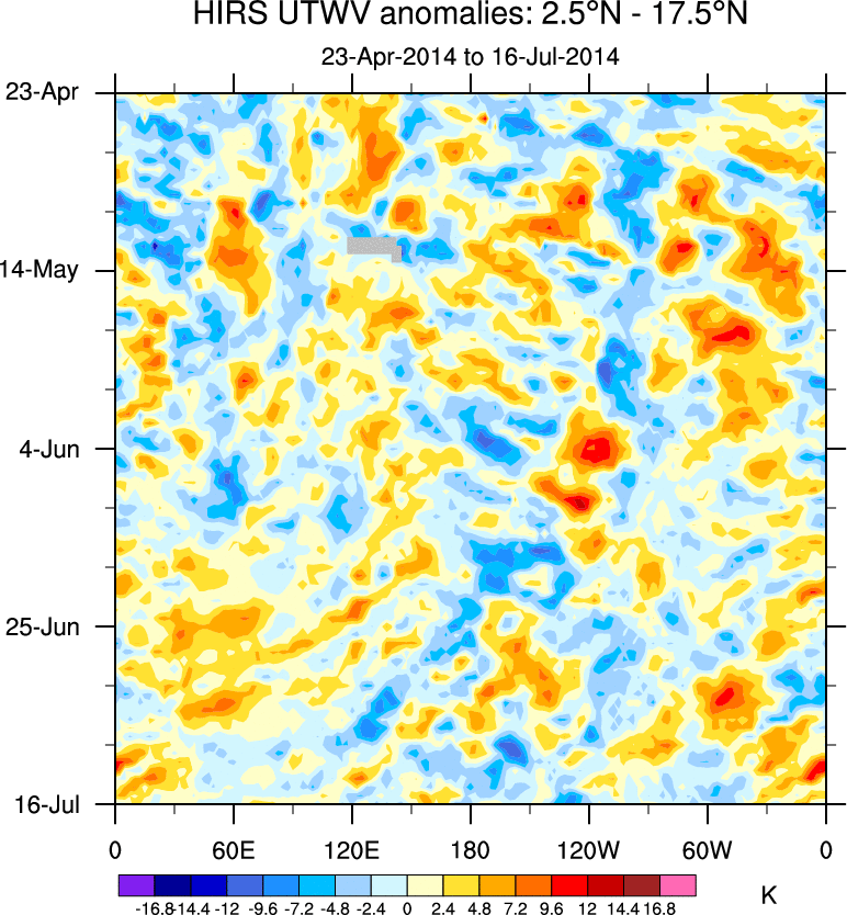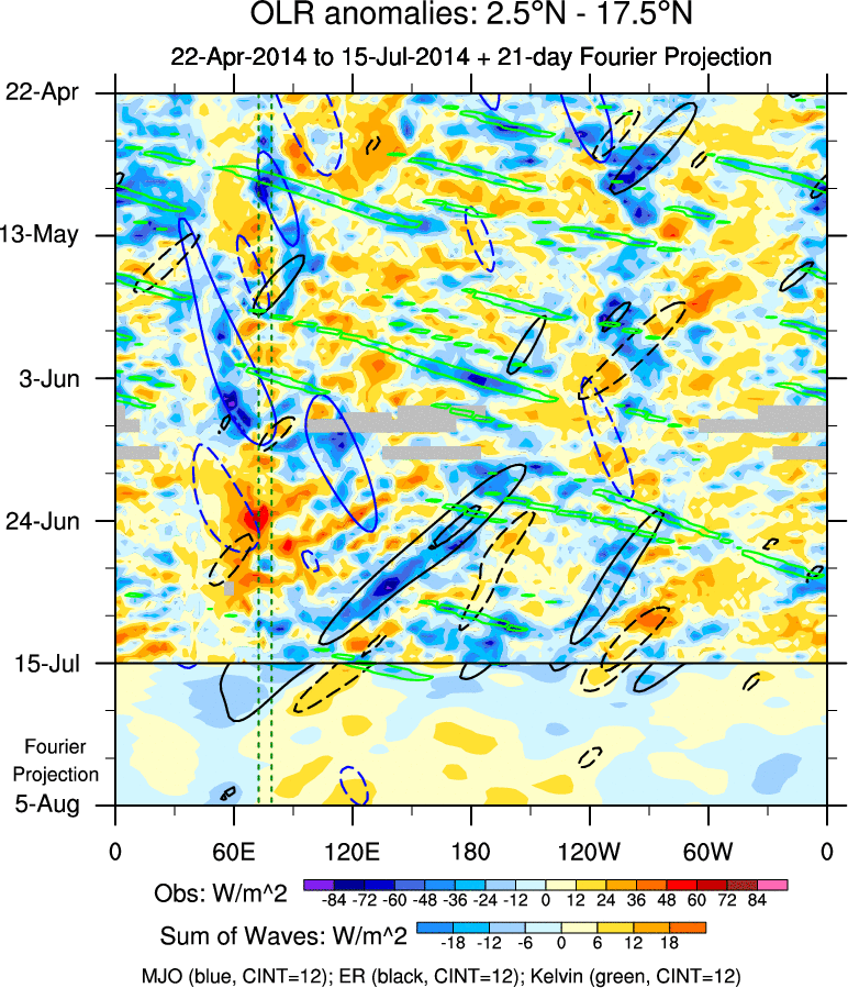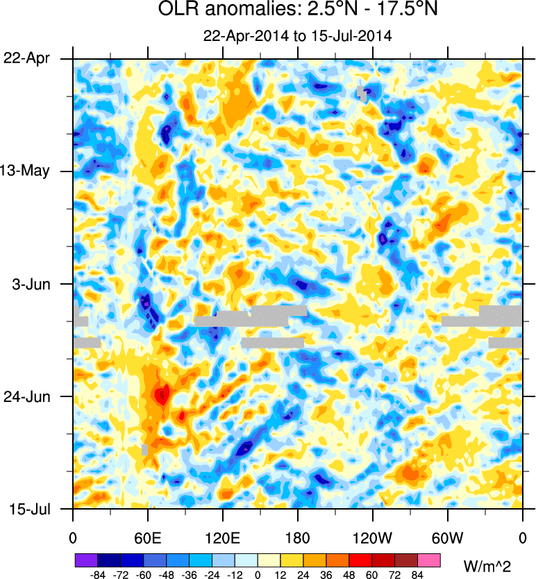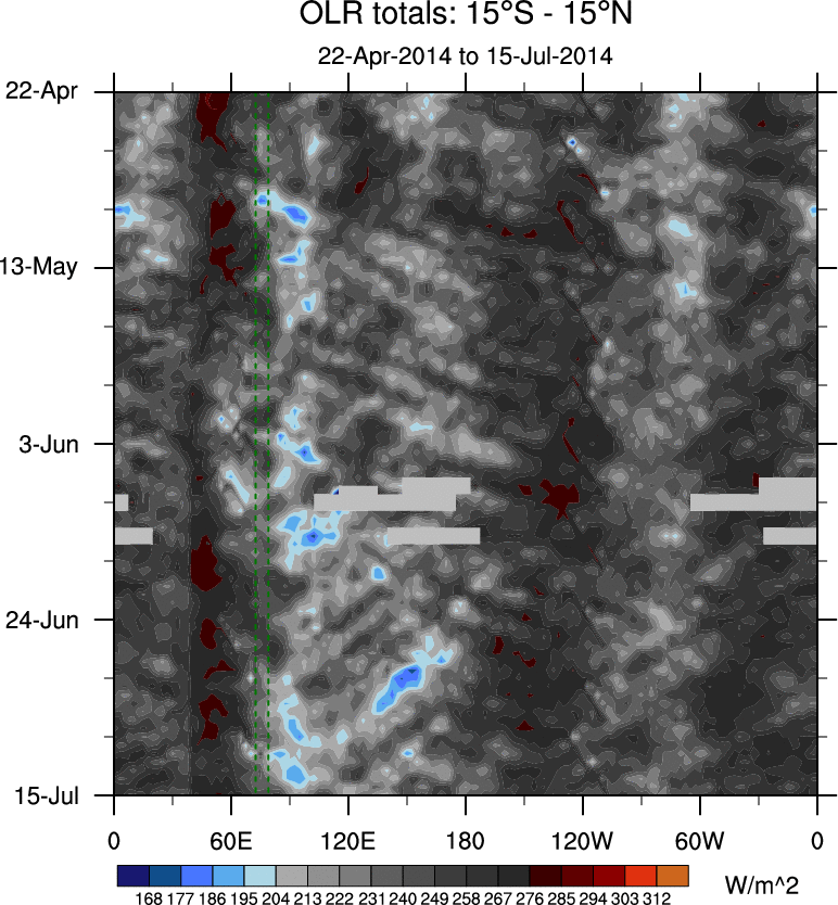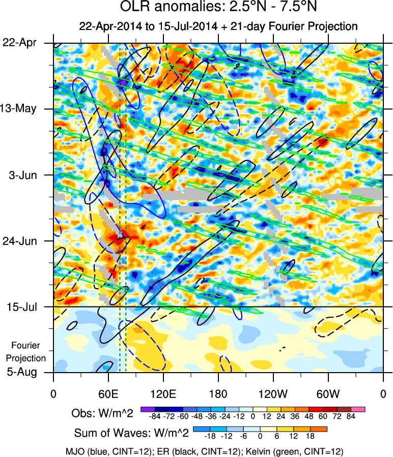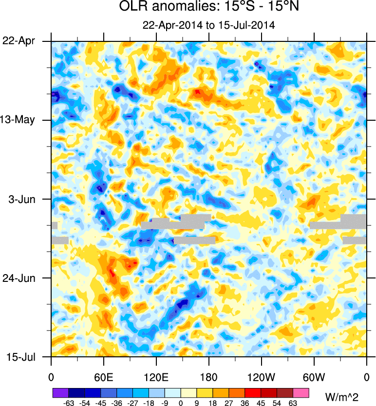 To identify tropical waves in near real-time, the OLR and UTWV data are filtered following Wheeler & Weickmann (2001 MWR). The daily anomalies are calculated using the first 3 harmonics of the seasonal cycle for 1979–2009. Missing values are then filled using linear interpolation in space and time. The most recent 365 days of anomalies are padded with 659 days of zeroes, and the result is filtered for each wave type.